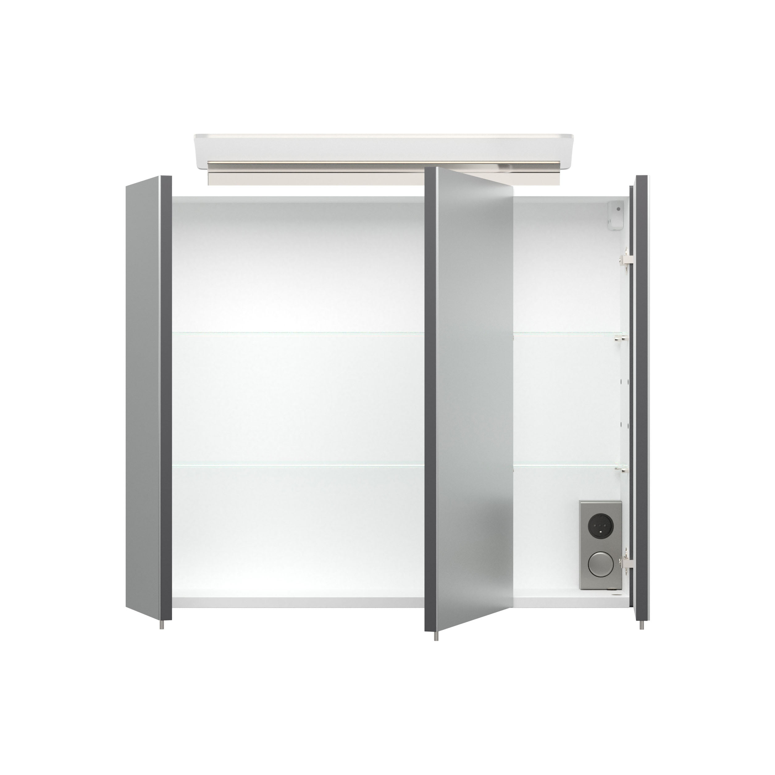 This mirror cabinet, with its sleek design, will fit perfectly into any bathroom. Its 10-watt neutral white bulb ensures excellent lighting (4000 Kelvin). Behind the soft-close doors are four glass shelves for storing all your belongings. The on/off switch and power outlet are also located here. This cabinet features a high-gloss anthracite finish and is 75cm wide, 62cm high, and 17cm deep.