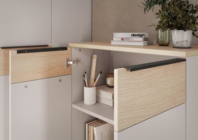 - Gebruik kantoorkasten met verschillende hoogtes en indelingen om diverse items te organiseren, van documenten en kantoorbenodigdheden tot persoonlijke spullen.