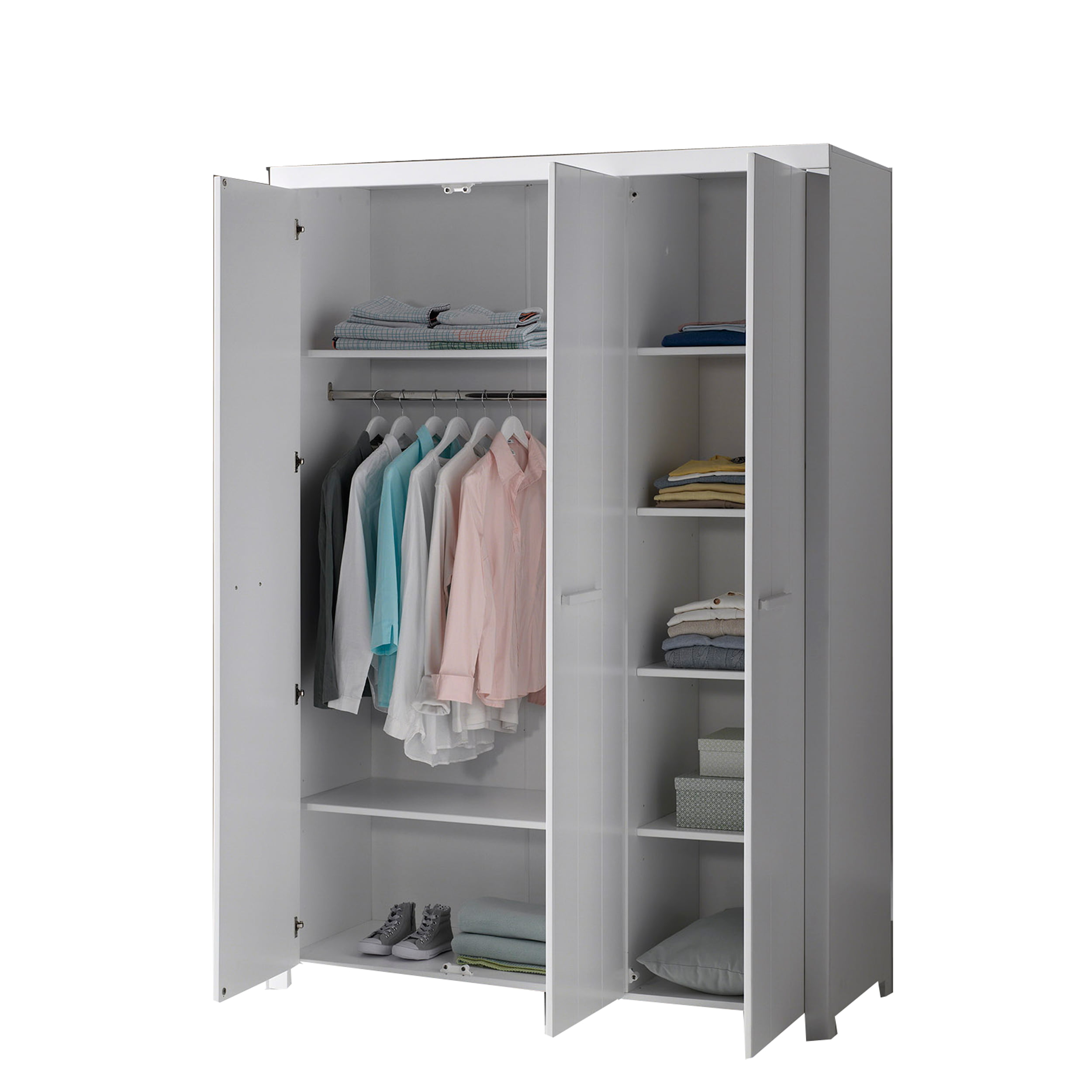 Deze 3-deurs-linnenkast heeft achter de 2 linkse deuren met verticale handgrepen over de volle breedte boven een legpank, waaronder een kledingroede en daaronder beneden nog een legplank. Achter de rechtse deur zijn maar liefst 5 legvakken voor al je kleding etc. Dit schept een zee aan bergruimte.