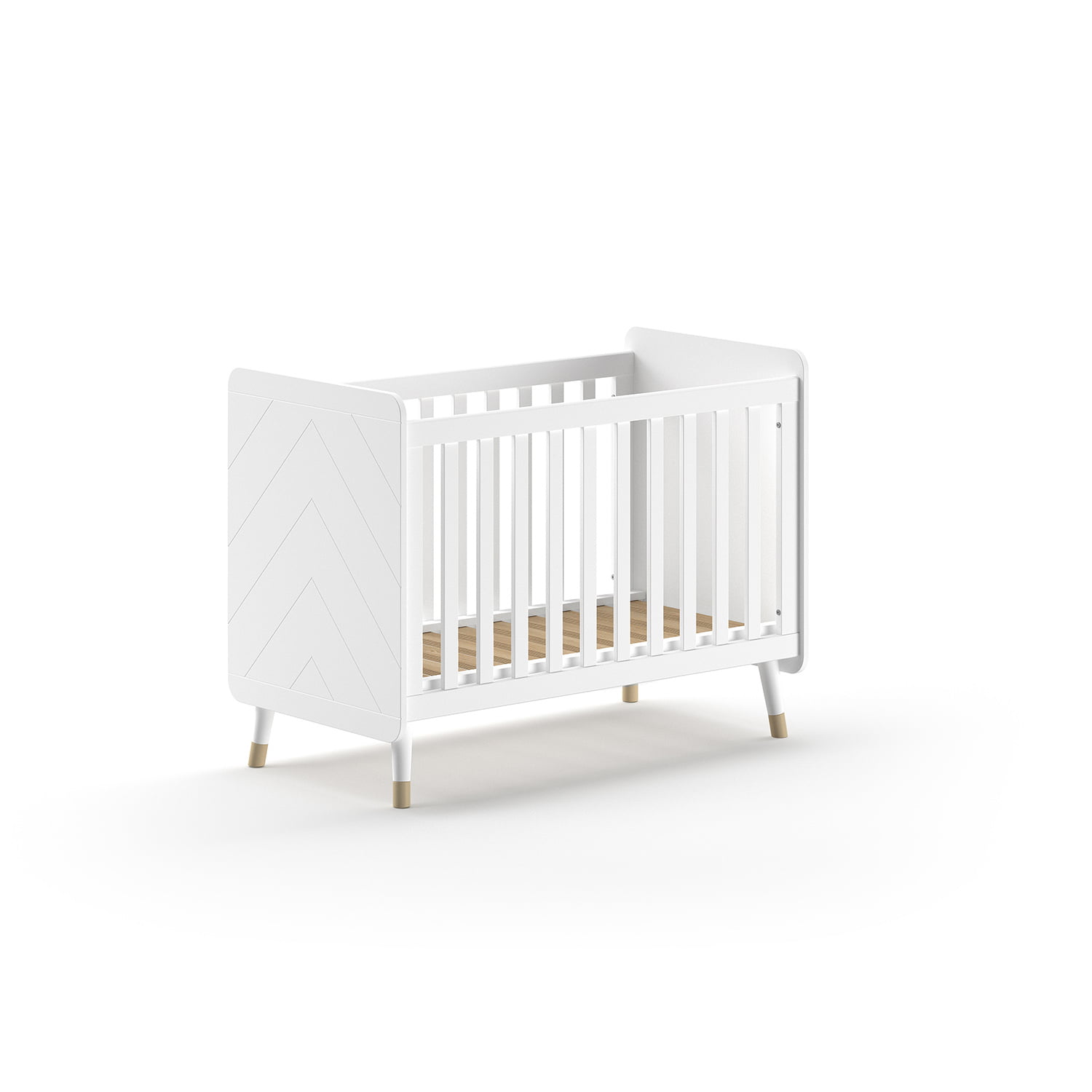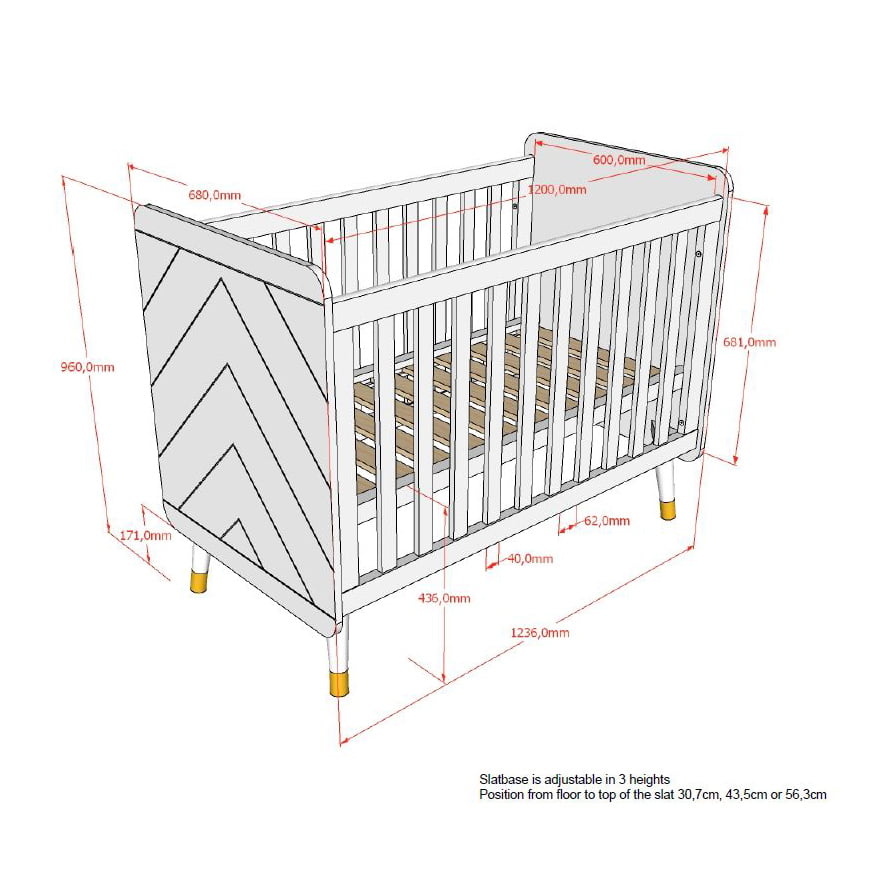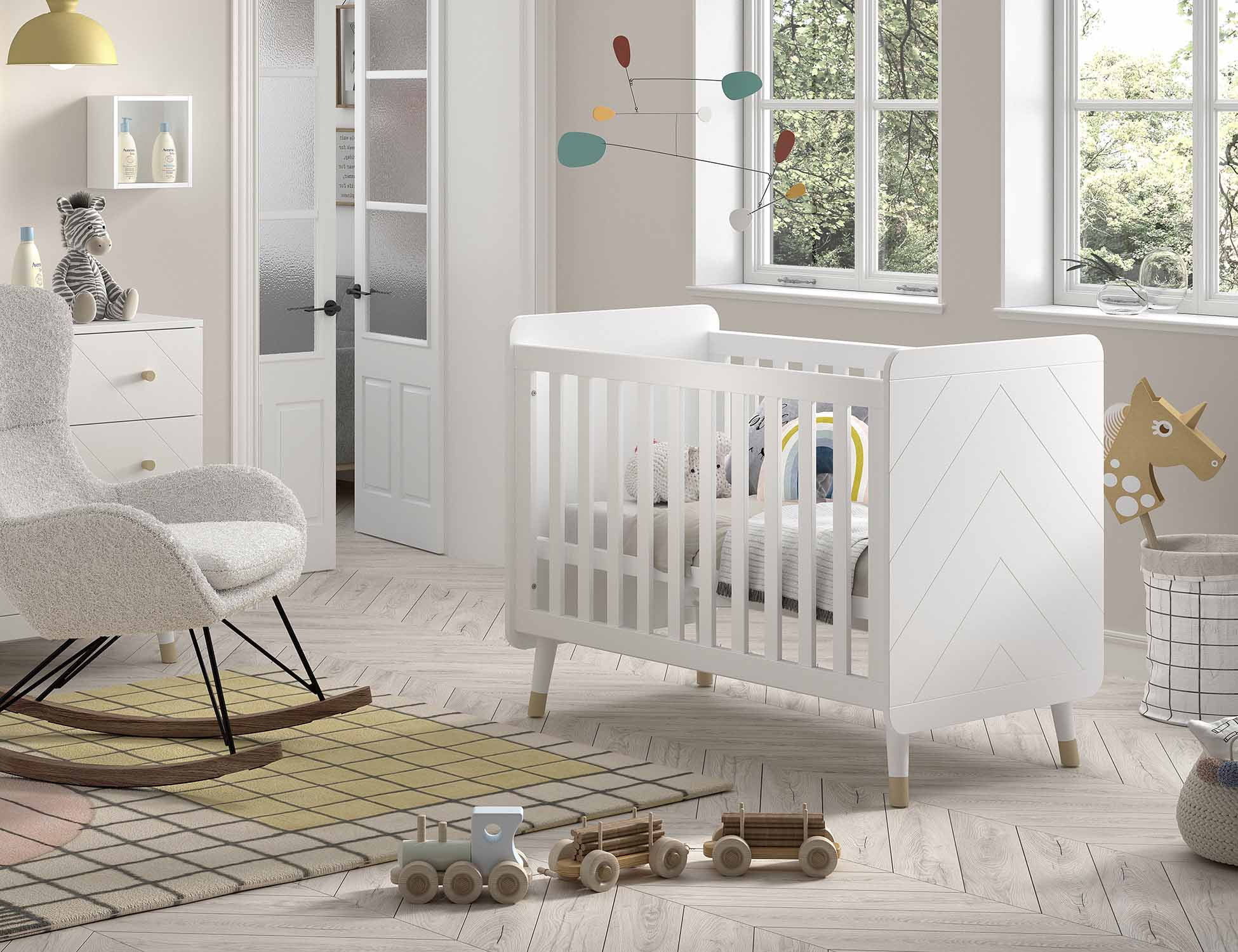 Ontdek het prachtige witte babybed, een stijlvol en comfortabel pronkstuk voor de babykamer. Gemaakt van hoogwaardig hout en met gouden omranding rond de pootjes, past dit tijdloze ontwerp naadloos in elke babykamerinrichting.
