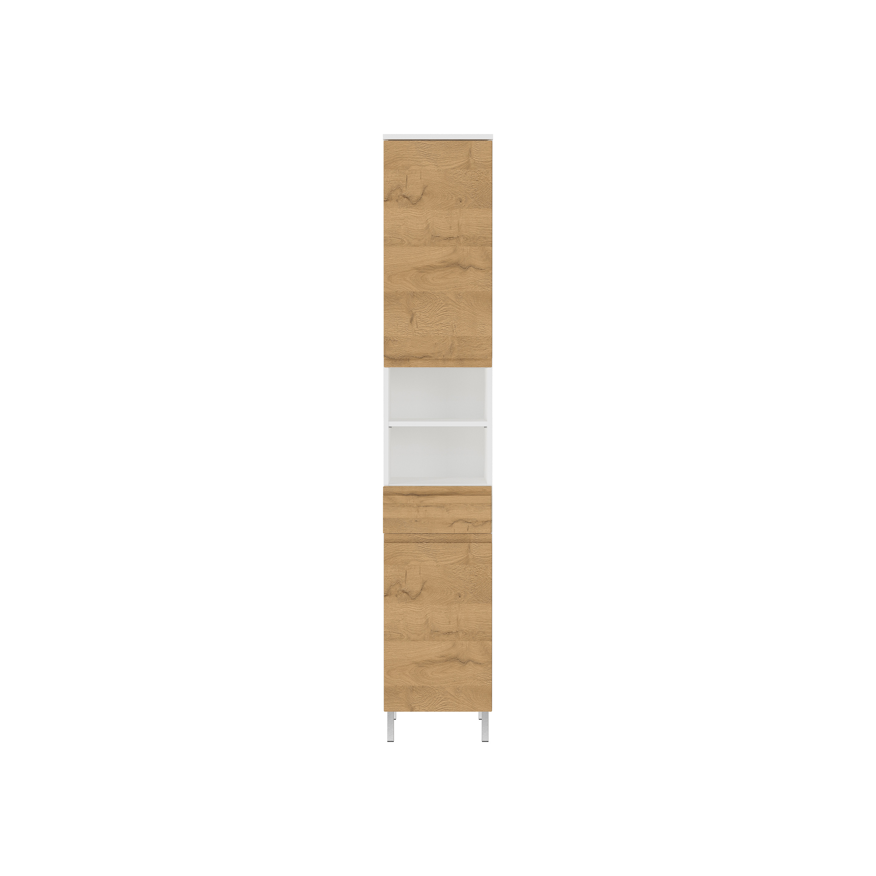 Deze kolomkast heeft een tijdloos ontwerp met een witte body en eiken fronten, waardoor hij naadloos past bij verschillende badkamerstijlen. De metalen voeten in chroomkleur zorgen voor stabiliteit en een moderne uitstraling. Dankzij het handgreeploze ontwerp sluiten de laden en deuren zacht en geruisloos.