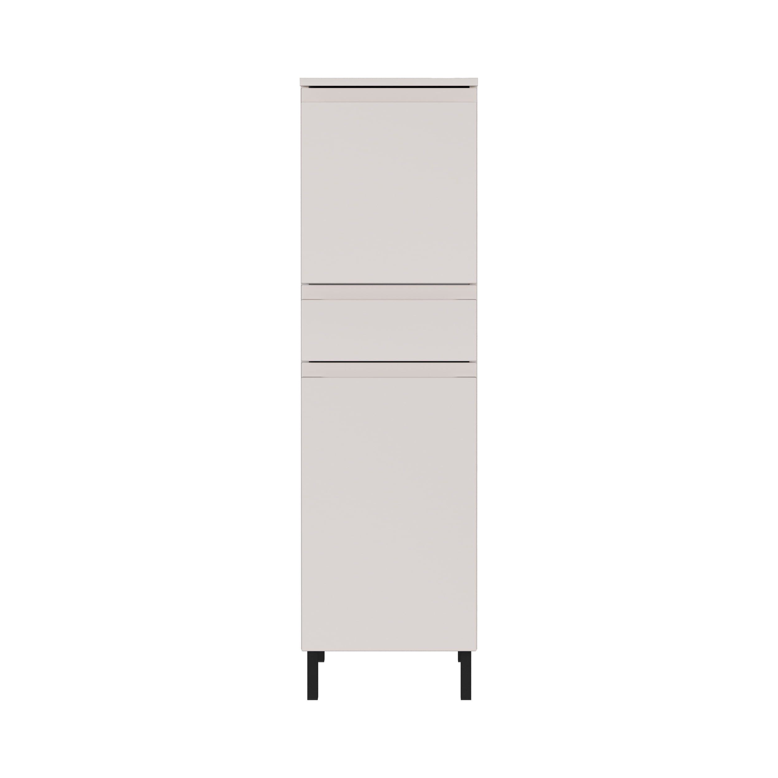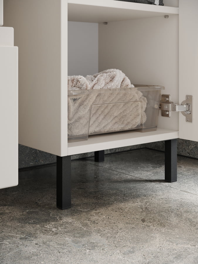 De kast heeft één lade (tot 10 kg) en twee deuren. Achter de deuren zitten twee verstelbare planken, elk belastbaar tot 10 kg. Het onderste deel kan tot 10 kg dragen. De lade is zelfsluitend en de deuren sluiten zacht dankzij demping. De deur kan links of rechts gemonteerd worden en de grepen zijn netjes gefreesd in het front.