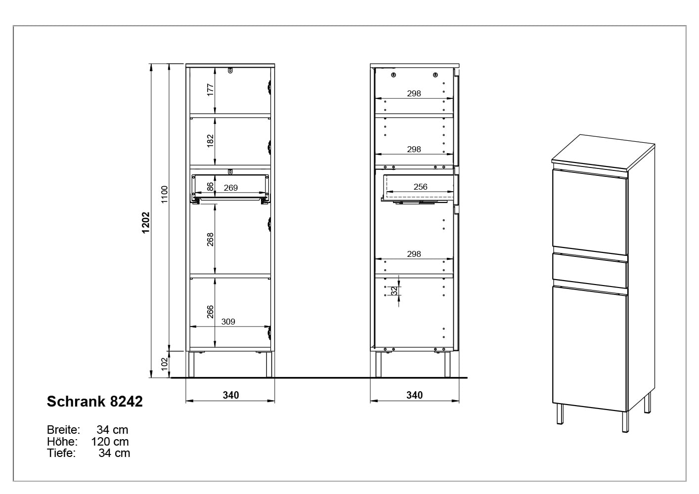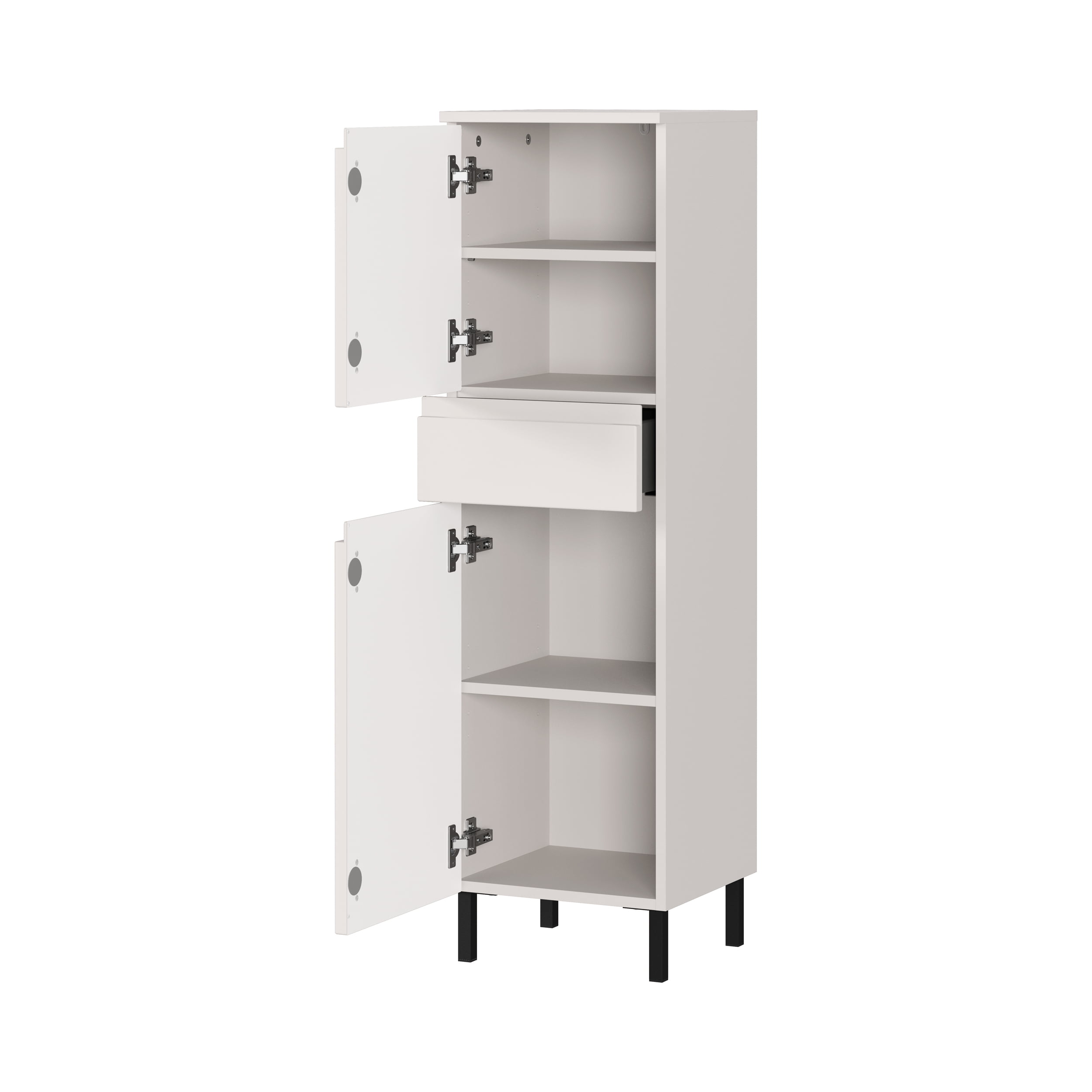 Met 34 cm breedte, 120 cm hoogte en 34 cm diepte is deze badkamerkast ideaal als je extra opbergruimte wilt, maar geen grote kast kwijt kunt. De hoge zwarte metalen poten geven het meubel een moderne, luchtige look.