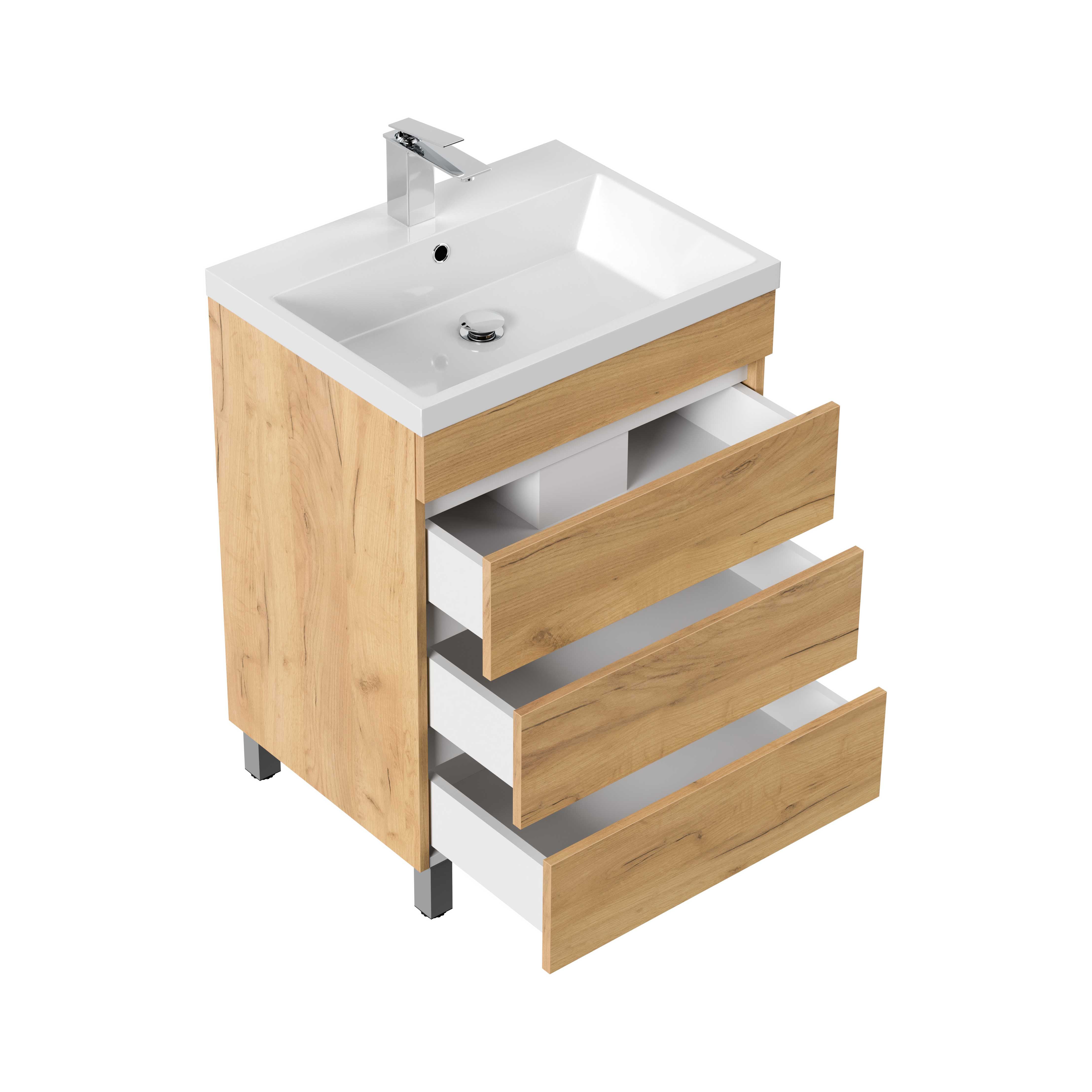 Het Badmeubel Dallas Eiken 70 cm brengt een warme, natuurlijke sfeer in je badkamer. Dit meubel, ontworpen in Duitsland en gemaakt van hoogwaardig spaanplaat, is afgewerkt in een realistische eiken Gold-look die een authentieke houtstructuur nabootst. De kast beschikt over drie griffloze laden met soft-close, en de wastafel, vervaardigd uit gegoten mineraal, is eenvoudig te onderhouden.