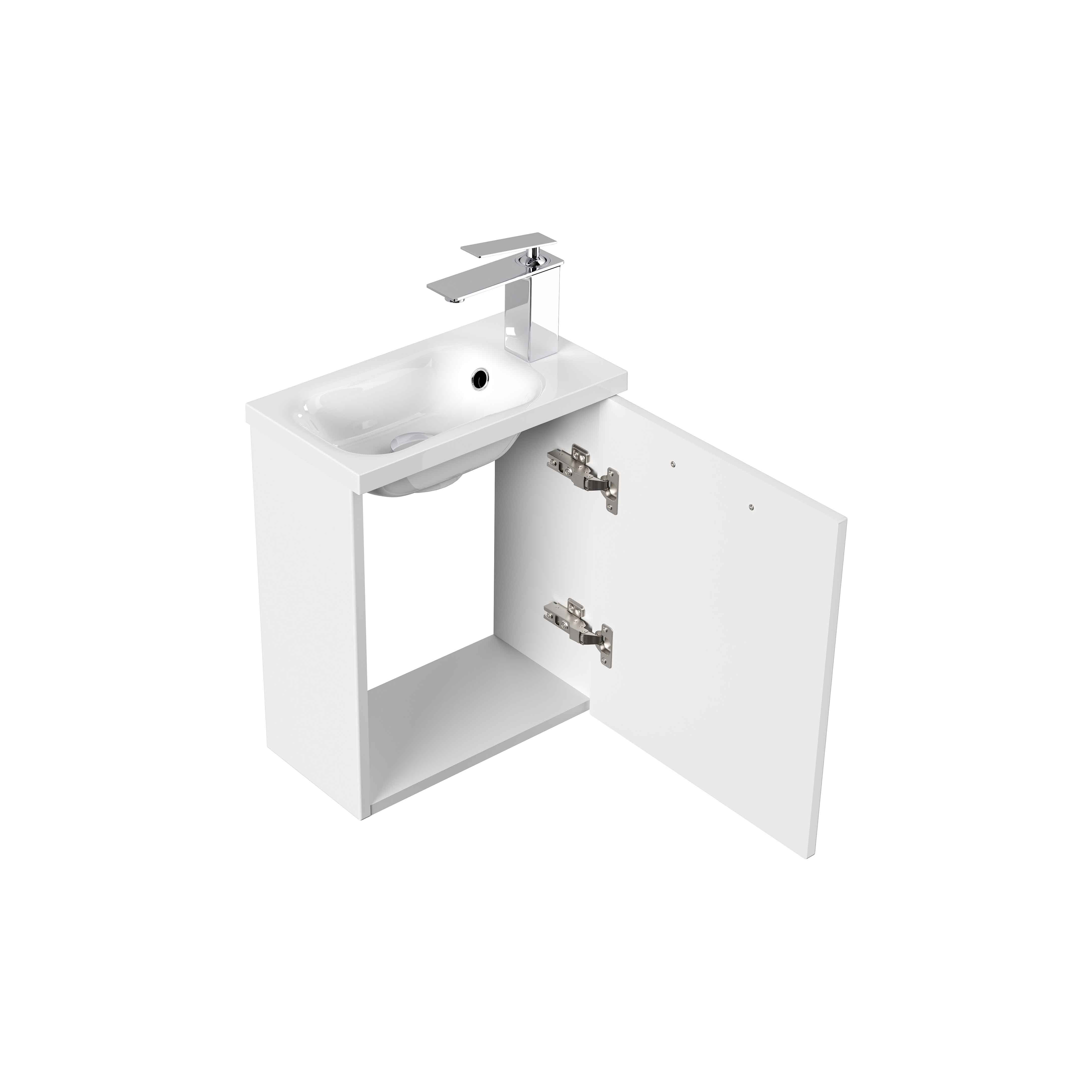 Dit degelijke wastafelmeubel vindt gemakkelijk zijn weg in elk interieur. Voldoende opbergruimte voor al je badkamer benodigdheden. De deur sluit geruisloos dankzij het soft-close systeem. De panelen van de meubels zijn vervaardigd uit een stevig spaanplaat-materiaal en afgewerkt met een sterke hoogglans melamine, hierdoor is deze kast gemakkelijk schoon te houden en langer beschermd tegen stof, vuil en krassen. De wastafelkast wordt geleverd exclusief kraan, toevoerleidingen naar de kraan, afvoerplug en zwanenhals.