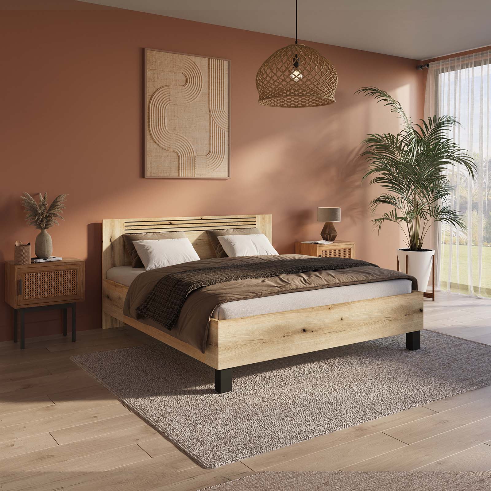 Geniet van extra ruimte met het Mekong bed in eiken (140×200 cm). Dit compacte tweepersoonsbed combineert stevigheid en stijl met een solide constructie en een luxe eiken afwerking. Het hoofdbord geeft het bed een verfijnde uitstraling, terwijl de melamine-coating zorgt voor een onderhoudsvriendelijke en krasbestendige afwerking.