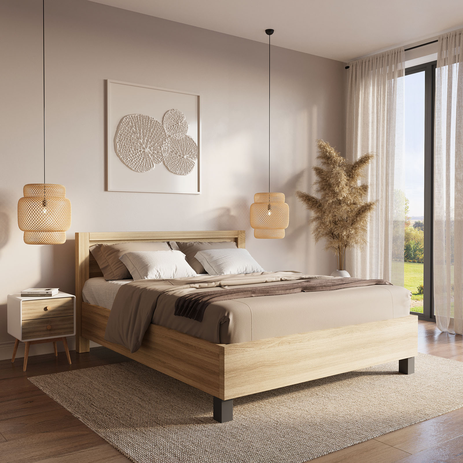 Geniet van een goede nachtrust in het bed Yumi in eiken met een breedte van 140 cm. Het stevige frame en het stijlvolle hoofdbord geven dit bed een moderne uitstraling. Perfect voor wie op zoek is naar comfort en een tijdloos design.