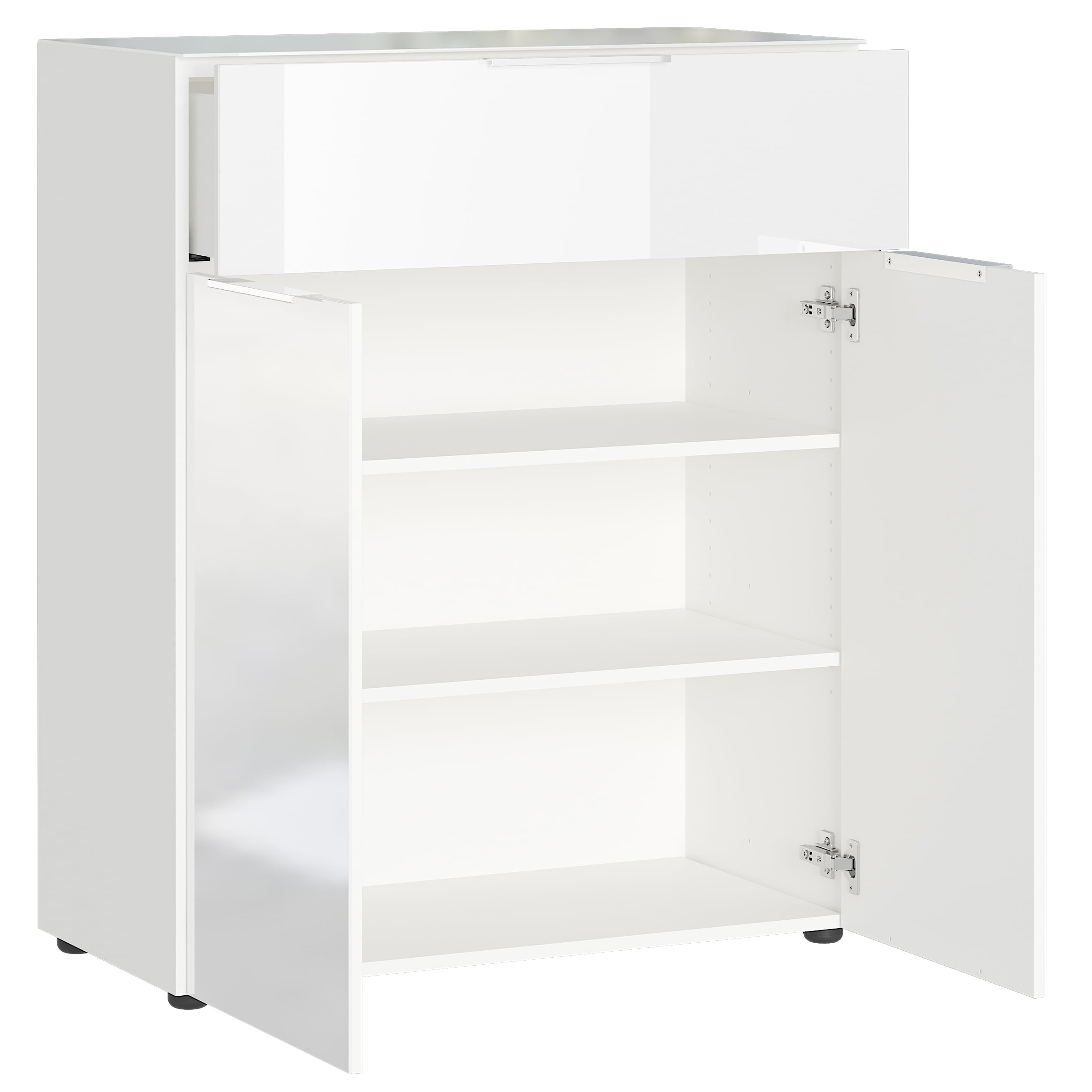 Deze bergkast heeft een combinatie van een deur en een lade. Achter de deuren met softclose-systeem liggen 2 legplanken zodat je 3 opbergvakken hebt.