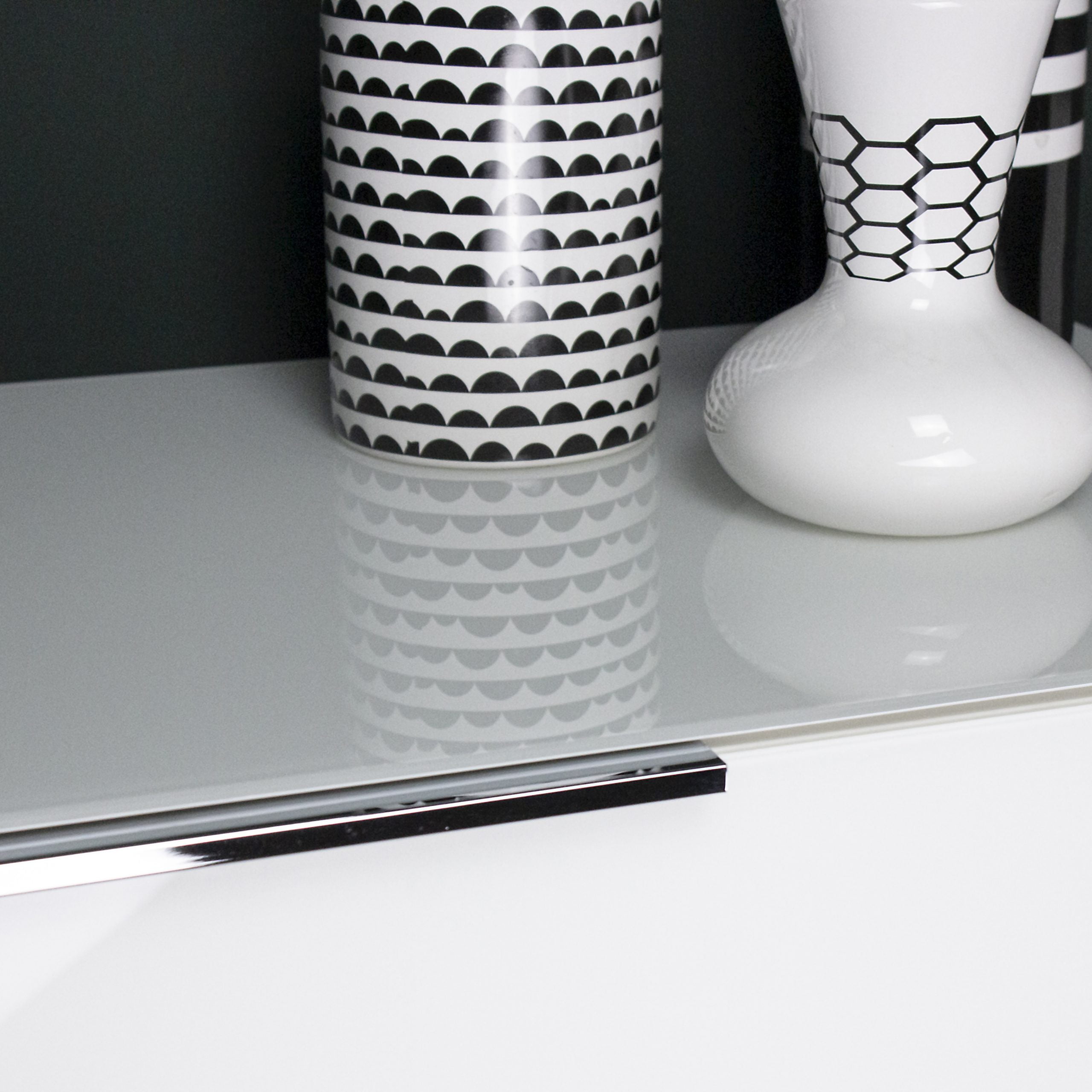 Een egale kleurstelling met alukleurige grepen in combinatie met de gekleurde panelen in veiligheidglas op de deuren en bovenblad geven deze meubelen zijn eigen uitstraling en klasse.