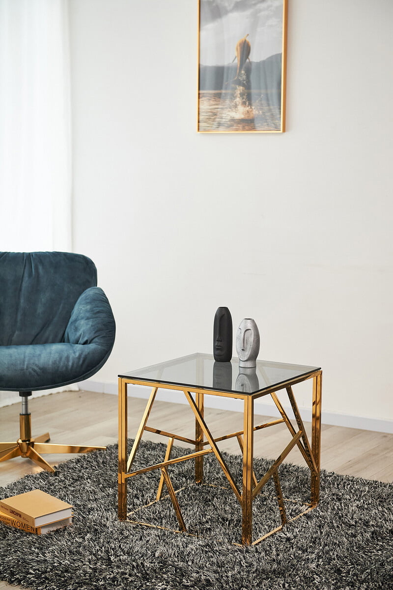 Een luxueuze bijzettafel met een stijlvol design en een gouden roestvrijstalen frame.