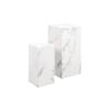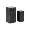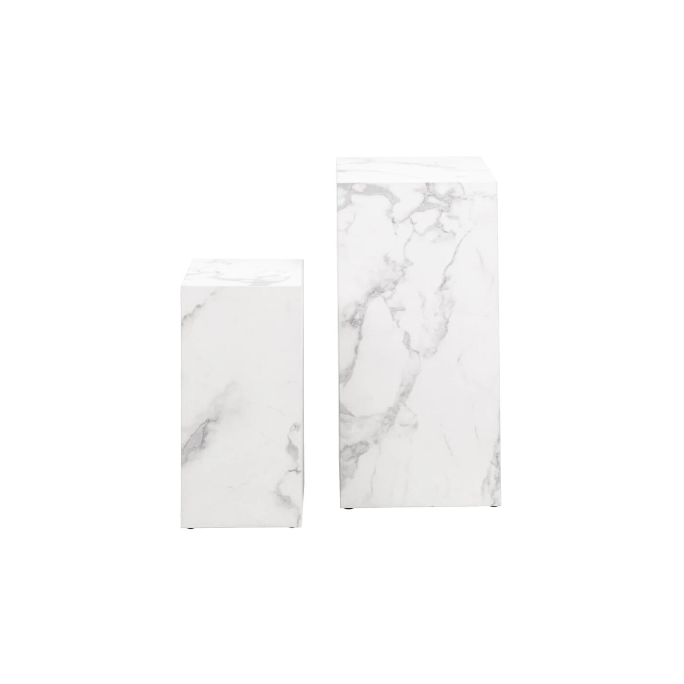 De verschillende hoogtes bieden flexibiliteit bij het stylen en plaatsen in de woonruimte. Afmetingen: Grote tafel – B35 x D35 x H70 cm, Kleine tafel – B25 x D25 x H50 cm. Beplakt met melaminefolie in marmerlook voor een tijdloze uitstraling.