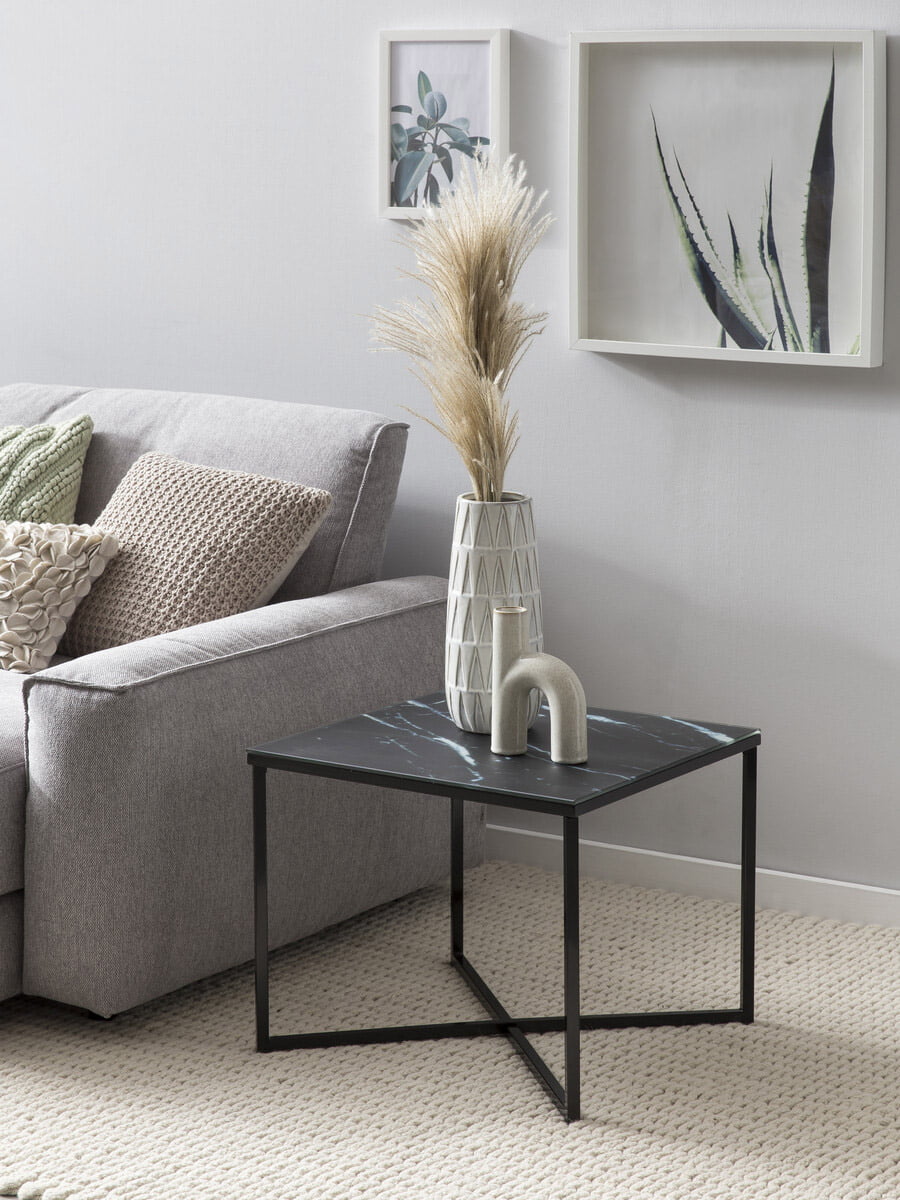 Deze vierkante bijzettafel is gemakkelijk te plaatsen in de woonkamer als salon- of bijzettafel. De tafel heeft een glazen platen van 6 mm met daaronder een mooie marmer look afwerking. Op de tafel kun je gemakkelijk een kopje koffie of de afstandsbediening kwijt tezamen met enkele leuke accessoires.