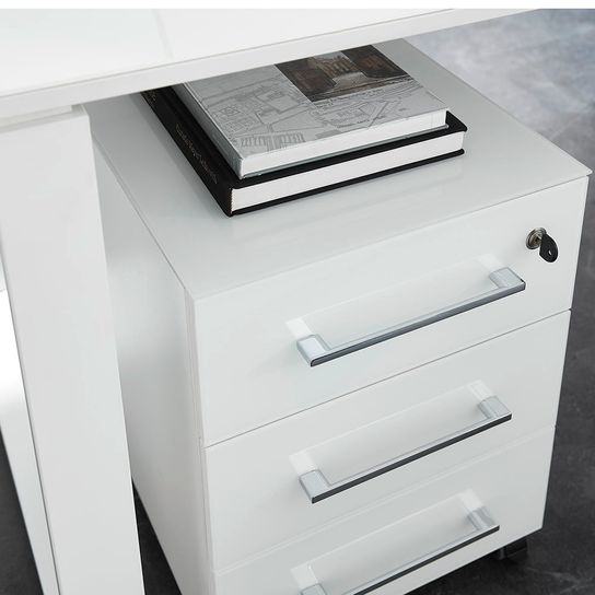 Want de bureaumeubelserie Destin is een chique lijn kantoormeubelen die helemaal geschikt is voor het thuiskantoor. Het bijzondere aan deze kantoormeubelen is dat op alle deuren en bladen een witte gehard glazen plaat is gemonteerd. Dat geeft een lichte spiegeling en diepte, maar ook een enorm cachet aan deze meubellijn.