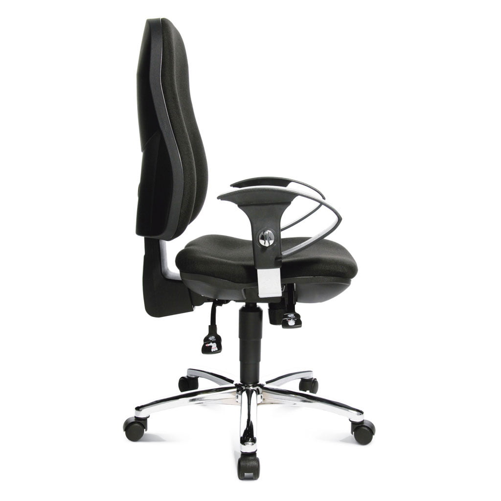 Deze bureaustoel heeft een extra hoge rug met een geïntegreerde rugwervelondersteuning. De rug is traploos in hoogte instelbaar. De zitting is geconstrueerd op een minimale belasting van de wervelschijven. Het comfort wordt extra luxe door de synchroon verstelling van de rug en zitting die traploos vastgezet kan worden. Het onderstel is van verchroomd staal. Een degelijk product voor duurzaam gebruik en voorzien van keurmerk. Deze bureaustoel is standaard uitgerust met wielen voor zachte vloeren. Wielen voor harde vloeren zijn apart te bestellen. Zie bijpassende producten voor de juiste wielen. Armleuningen zijn optioneel. Zie hiervoor onderstaande bijpassende producten.