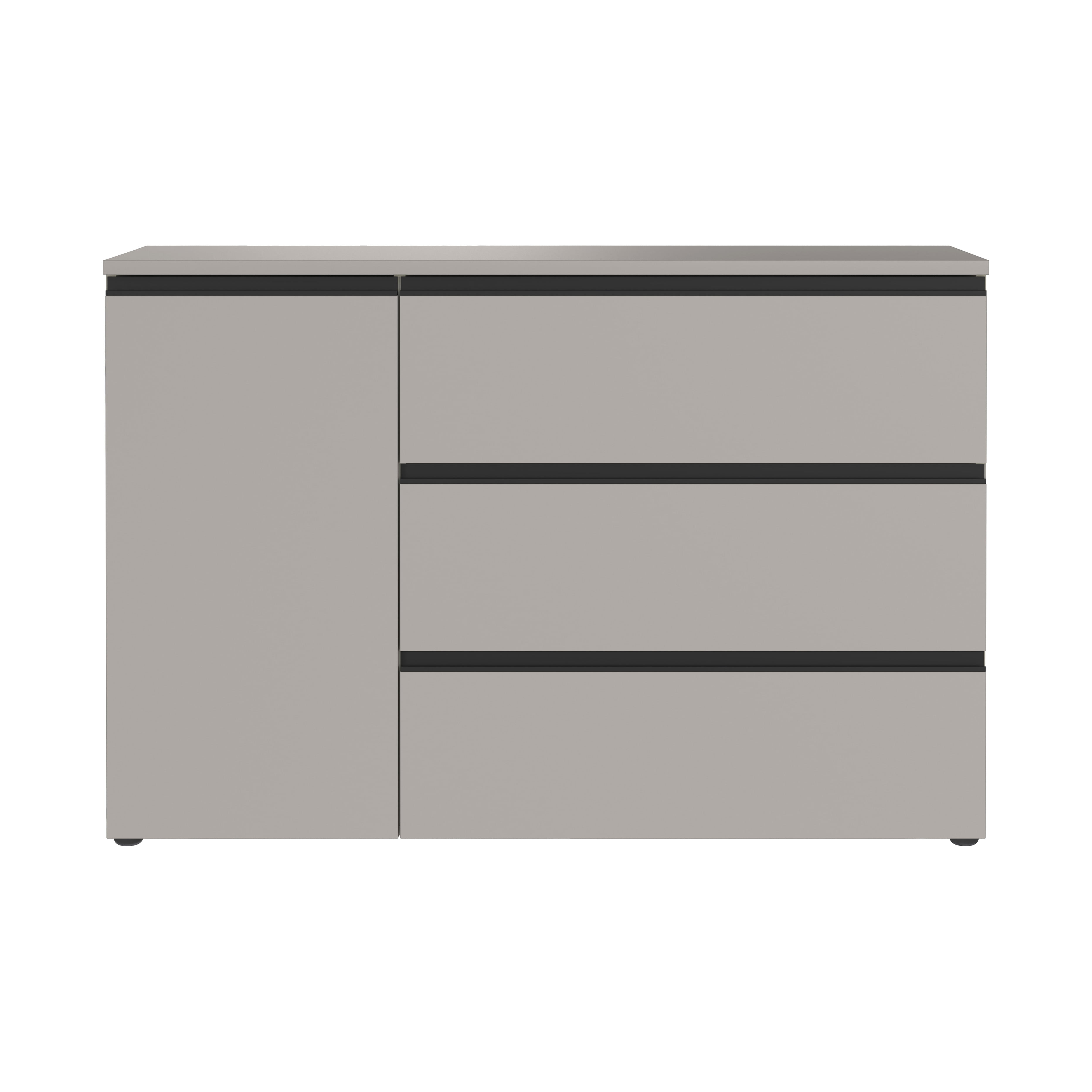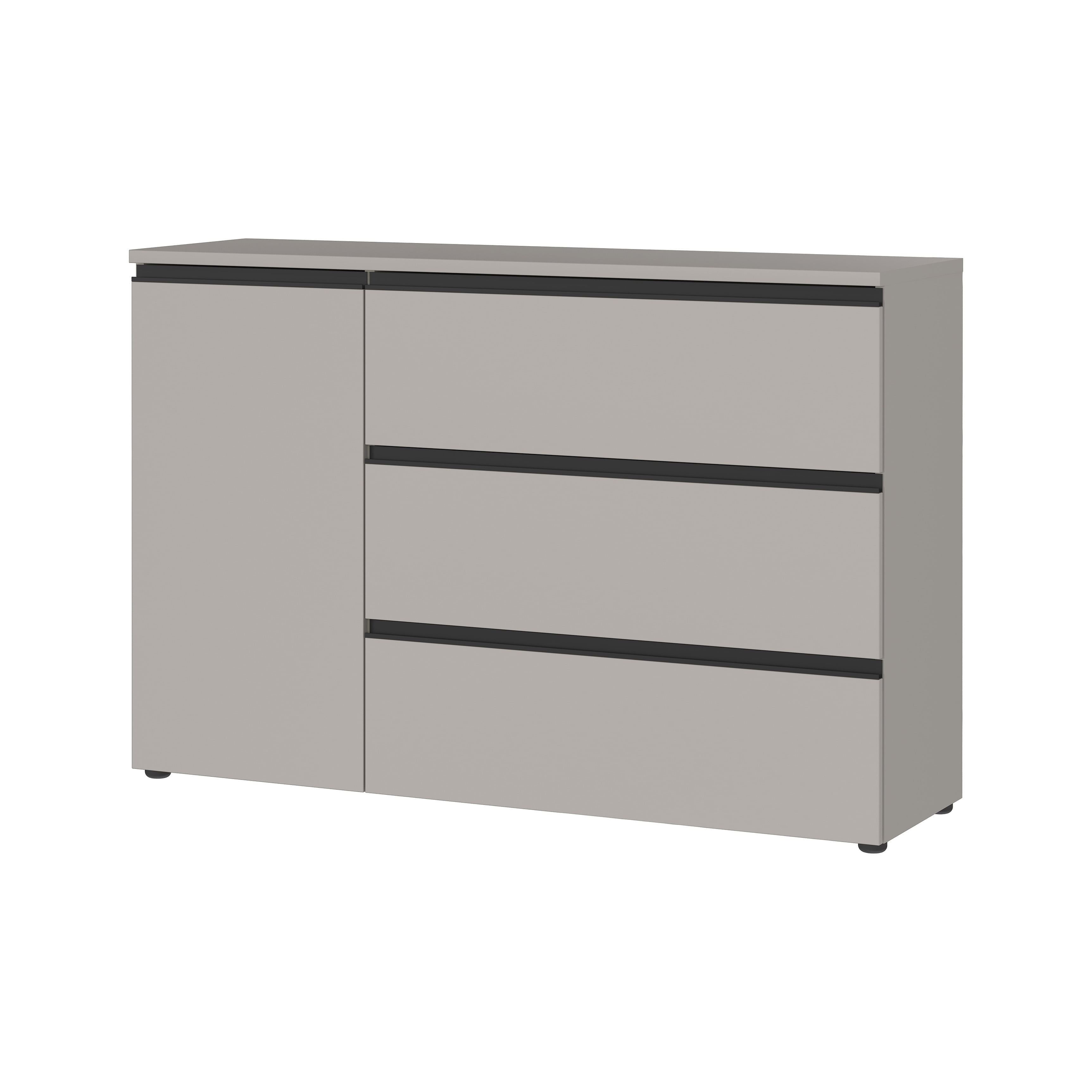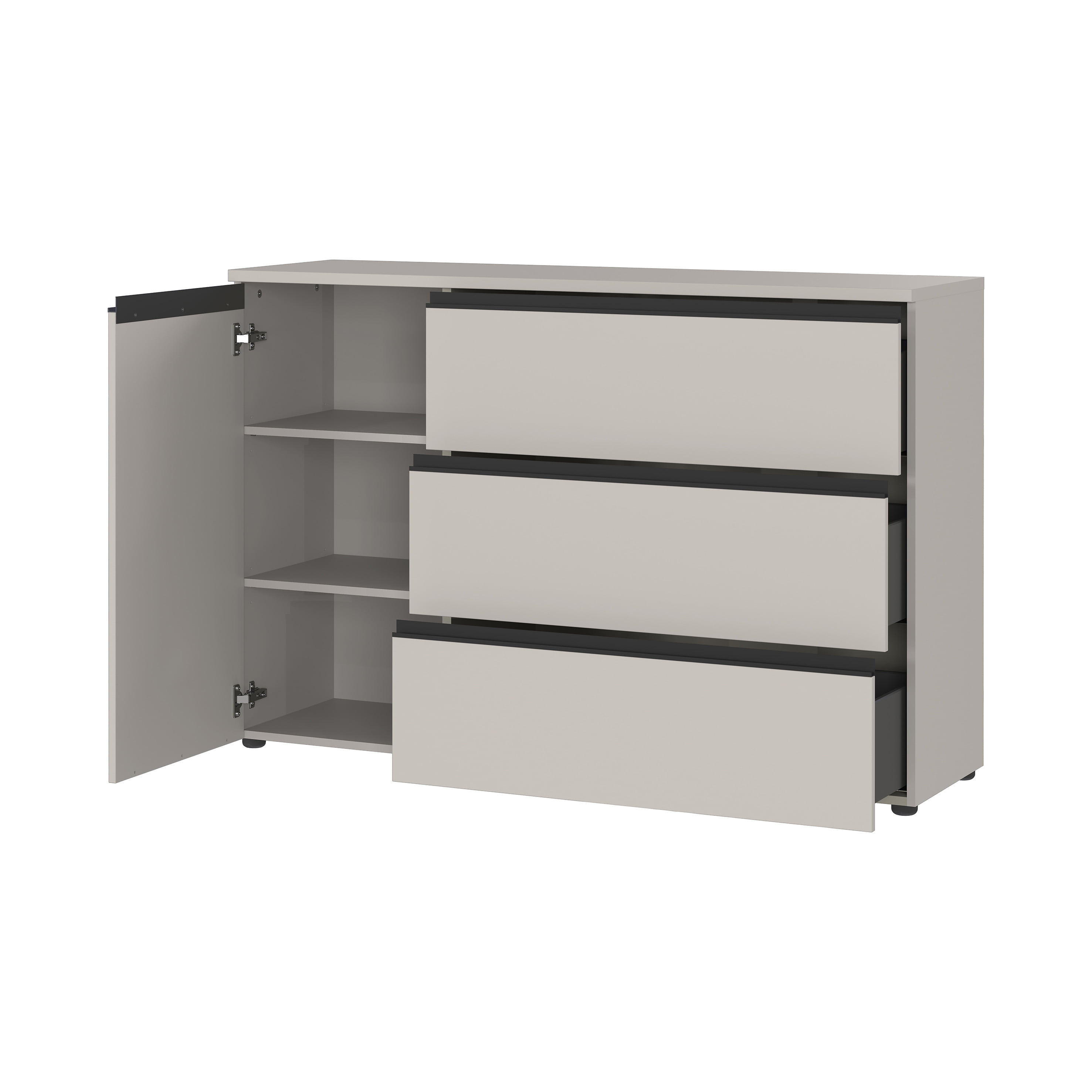 Het meubelstuk is uitgevoerd in de kleur steengrijs, met 4 handgreepstrips gemaakt van zwart poeder gecoat metaal en 6 zwarte kunststof meubelglijders. Het is voorzien van een krasbestendige en duurzame oppervlaktecoating, evenals schok- en stootbestendige randen. De deuren en laden sluiten langzaam, zacht en geruisloos vanwege geïntegreerde dempers, wat zorgt voor een rustige gebruikerservaring. Het dressoir is milieuvriendelijk verpakt en geproduceerd in Duitsland.