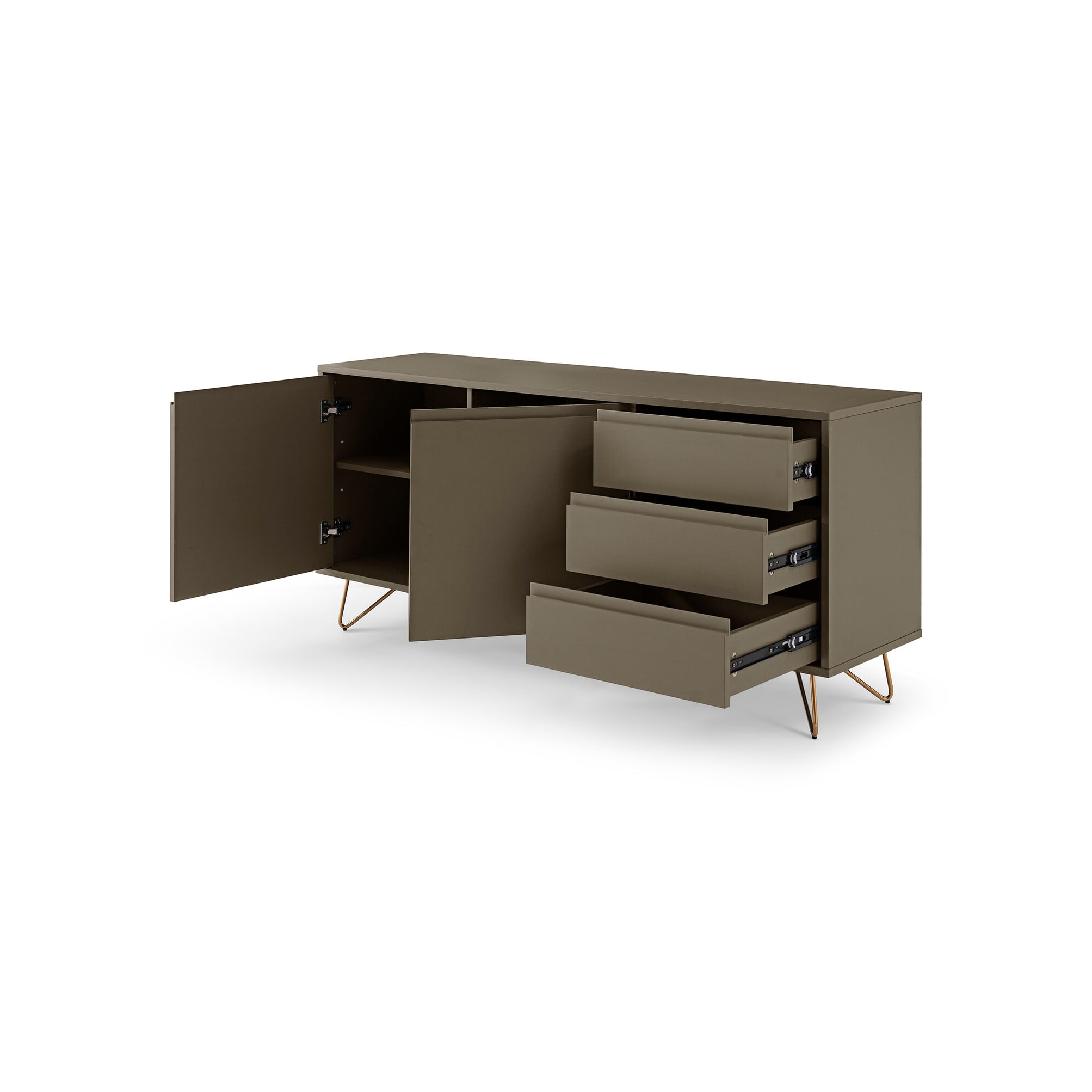 Dit stijlvolle dressoir biedt voldoende ruimte voor al je spullen, bovenop het dressoir is ruimte voor enkele accessoires. Het dressoir is vervaardigd uit een stevige MDF en heeft een matte afwerking. Achter elke deur bevindt zich 1 verstelbare legplank. Door de combinatie met zijn gouden metalen poten een echte eyecatcher in je interieur. Gemakkelijk te monteren doormiddel van bijgeleverde montagehandleiding. Bekijk ook de andere elementen uit deze serie.