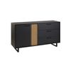 Achter de linkerdeur bevindt zich een handige legplank, ideaal voor het opbergen van grotere items of het organiseren van je spullen. Aan de rechterkant van het dressoir bevinden zich drie laden, perfect voor het opbergen van kleinere voorwerpen zoals accessoires, kleding of andere benodigdheden.