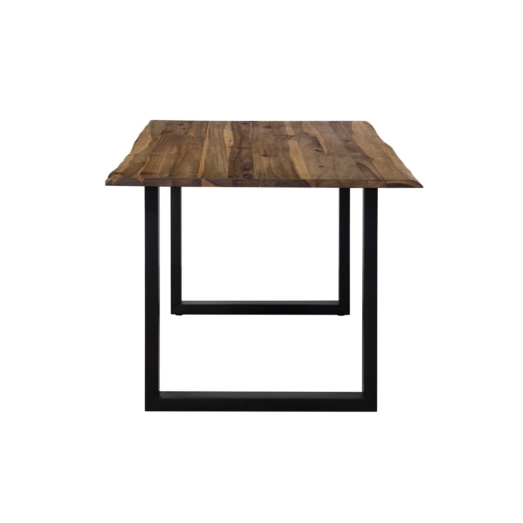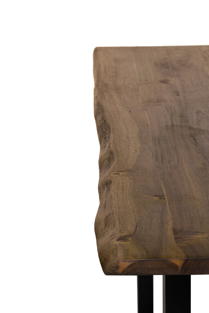 Deze stevige eetkamertafel heeft een massief blad van acaciahout met een dikte van ongeveer 2,6 centimeter. De lange zijden van de tafel zijn origineel. Het blad is behandeld met een hard wax meubelolie in zijdeglans, waardoor deze is bescherm tegen water, vuil en slijtage. Door zijn sterke metalen frame staat deze tafel goed op de grond. Gemakkelijk te monteren doormiddel van bijgeleverde montagehandleiding. Verkrijgbaar in verschillende afmetingen.