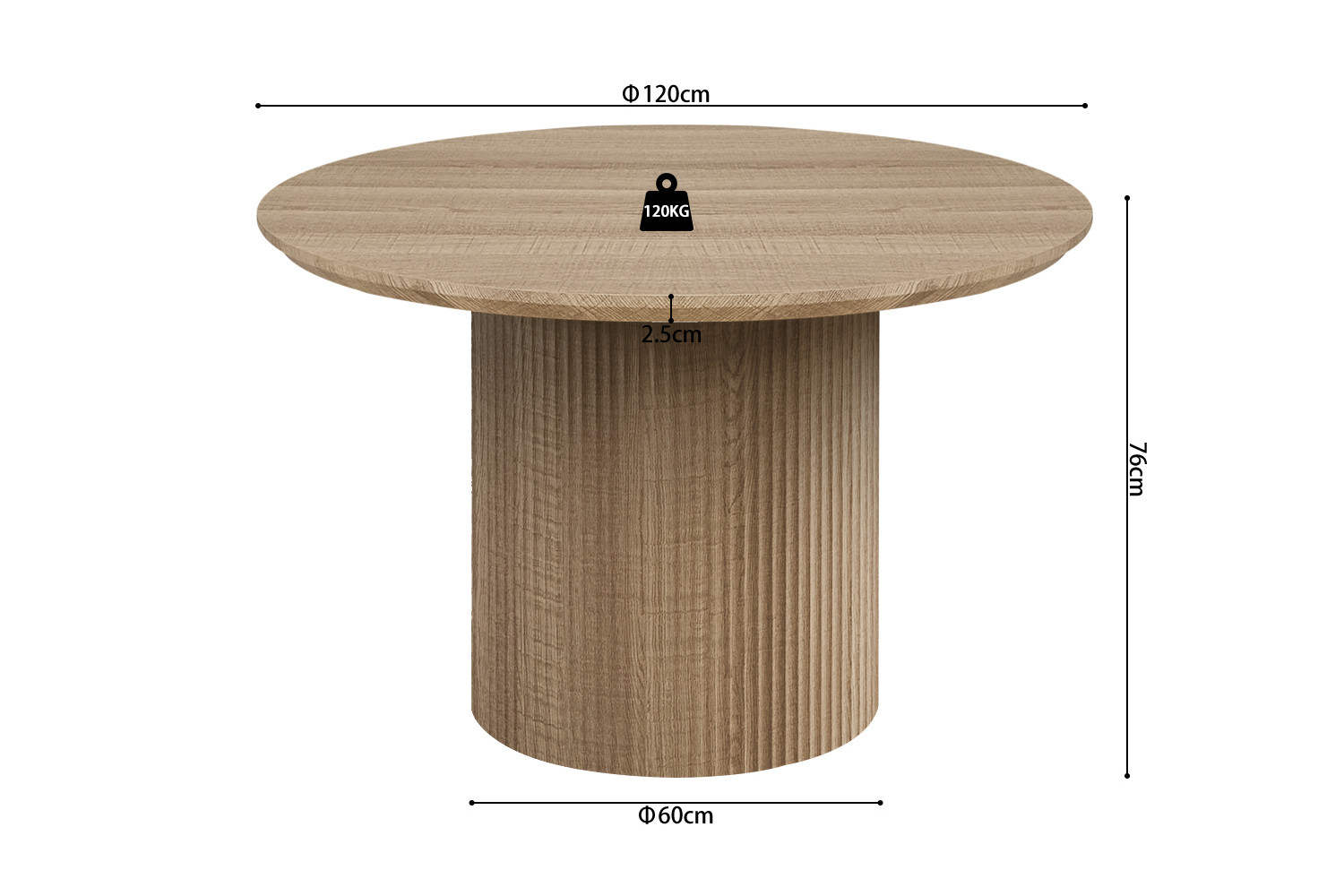 Met een diameter van 120 cm en een hoogte van 76 cm is deze eettafel een praktische keuze voor dagelijks gebruik. De ronde vorm zorgt voor een speels effect en maakt het eenvoudig om de tafel in verschillende ruimtes te plaatsen.