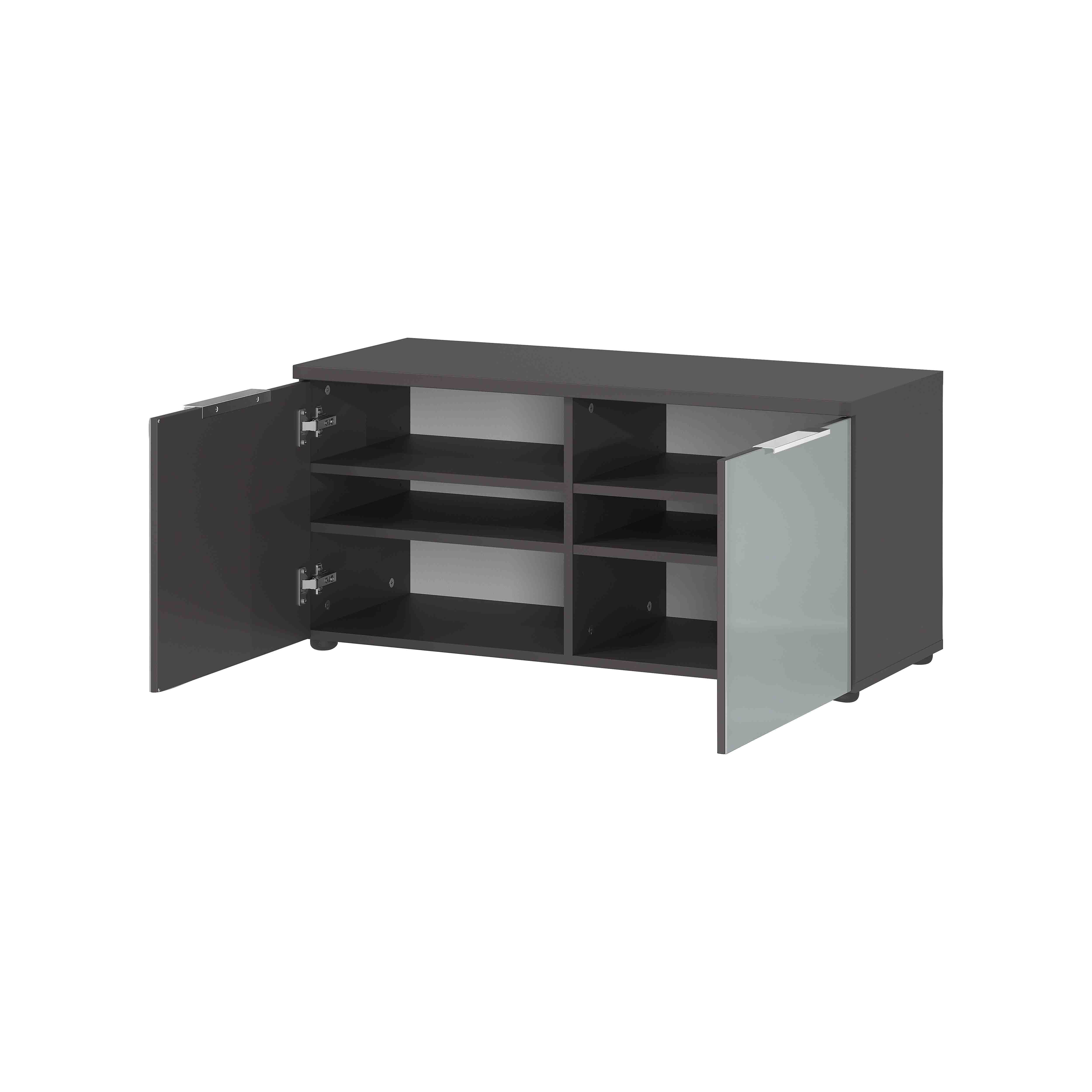 De glazen fronten in combinatie met de metalen handgrepen en de zilvergrijze grafiet kleur maakt deze serie net even anders. Alle elementen in deze serie zijn voorzien van verstelbare legplanken en geruisloos sluitende deuren. De meubelen worden geproduceerd in Duitsland waarmee je verzekerd bent van goede kwaliteit en lange levensduur. De meubelen zijn voorzien van een ABS-kantafwerking waardoor deze extra stevig zijn en tegen een stootje kunnen. Gemakkelijk te monteren doormiddel van bijgeleverde montagehandleiding. Combineer de verschillende meubelen uit deze serie en richt je entree in één keer helemaal in!