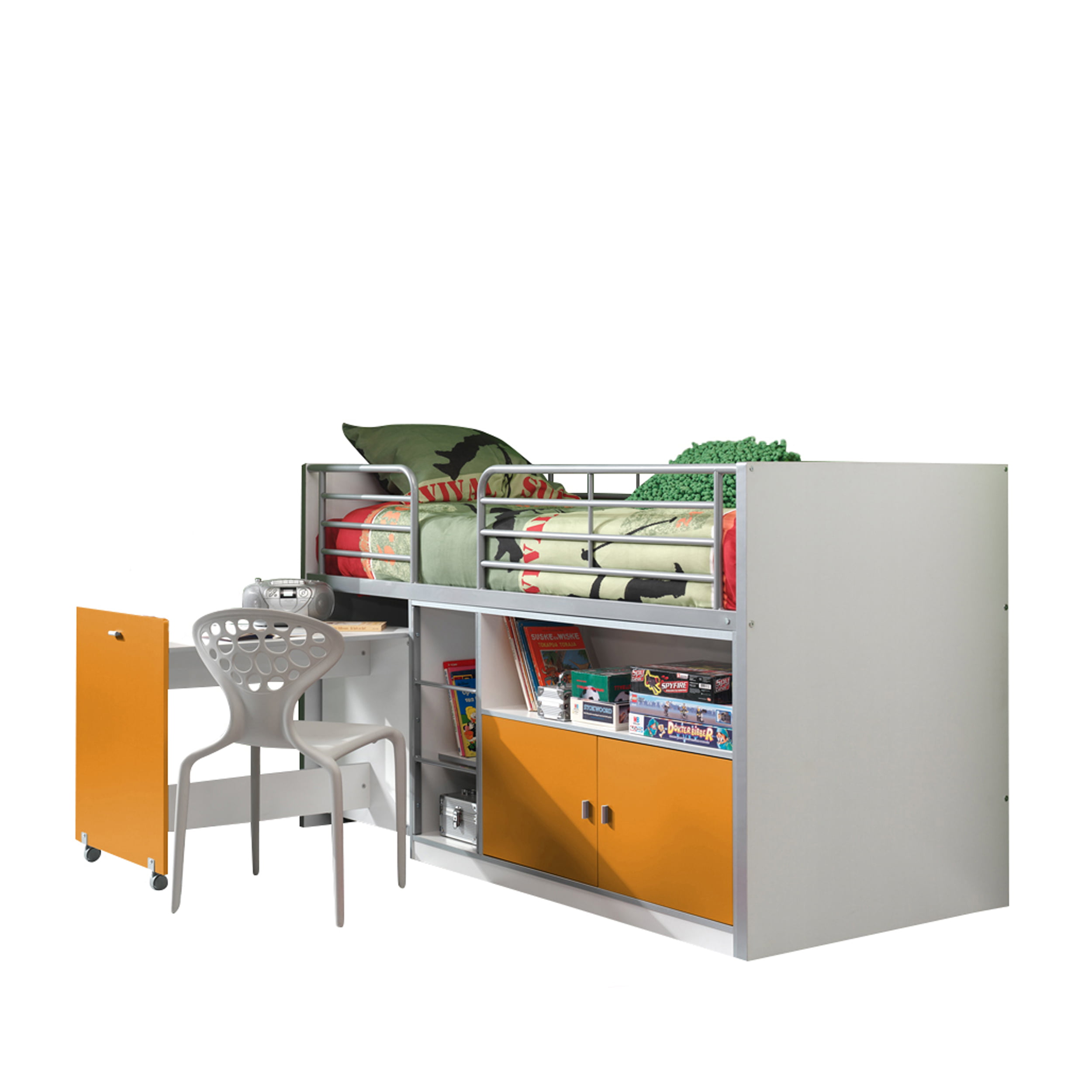 De halfhoogslaper Evi-USB is de ideale ruimtewinner als je in een kleurrijke omgeving wakker wilt worden en daarna aan het uitschuibare bureau nog wat studeerwerk wil doen. De halfhoogslaper heeft bovendien nog heel wat bergruimte achter de deuren en in de open vakken.