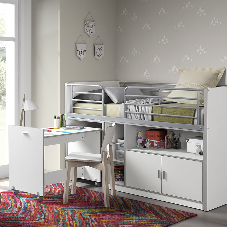 Deze strak gevormde halfhoogslaper met wit gelakte voorfronten heeft links een handig uitschuifbaar volwaardig bureau, middenin 3 open vakken en rechts 2 wit gelakte deuren met daarboven nog een breed open vak. De 2 metalen uitvalhekken zorgen voor een prima bescherming. Het bed is inclusief een houten lattenbodem, maar een matras van 90×200 cm. dien je wel los bij te bestellen. In de collectie van huisenthuis.nl heb je hierin een prima assortiment.