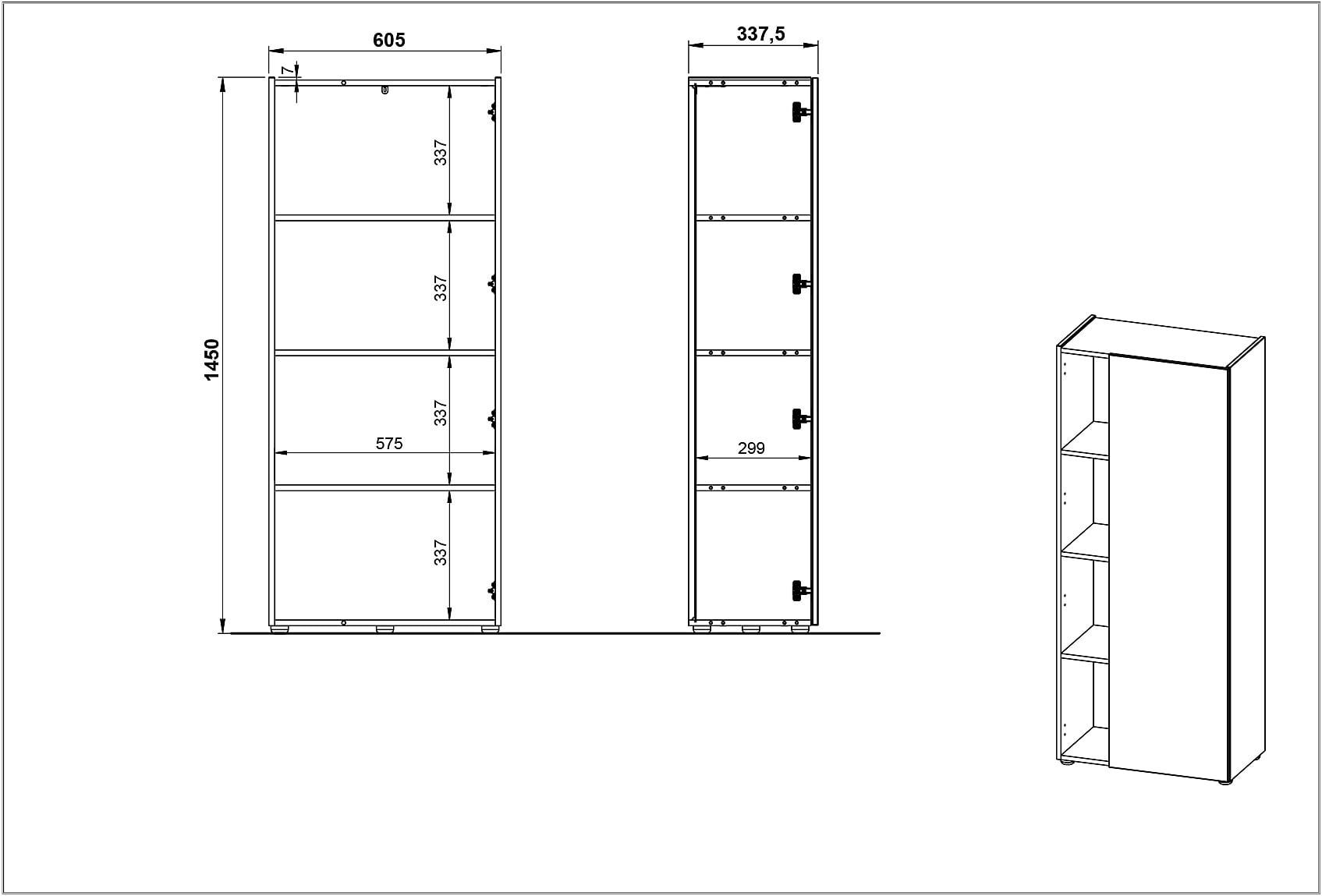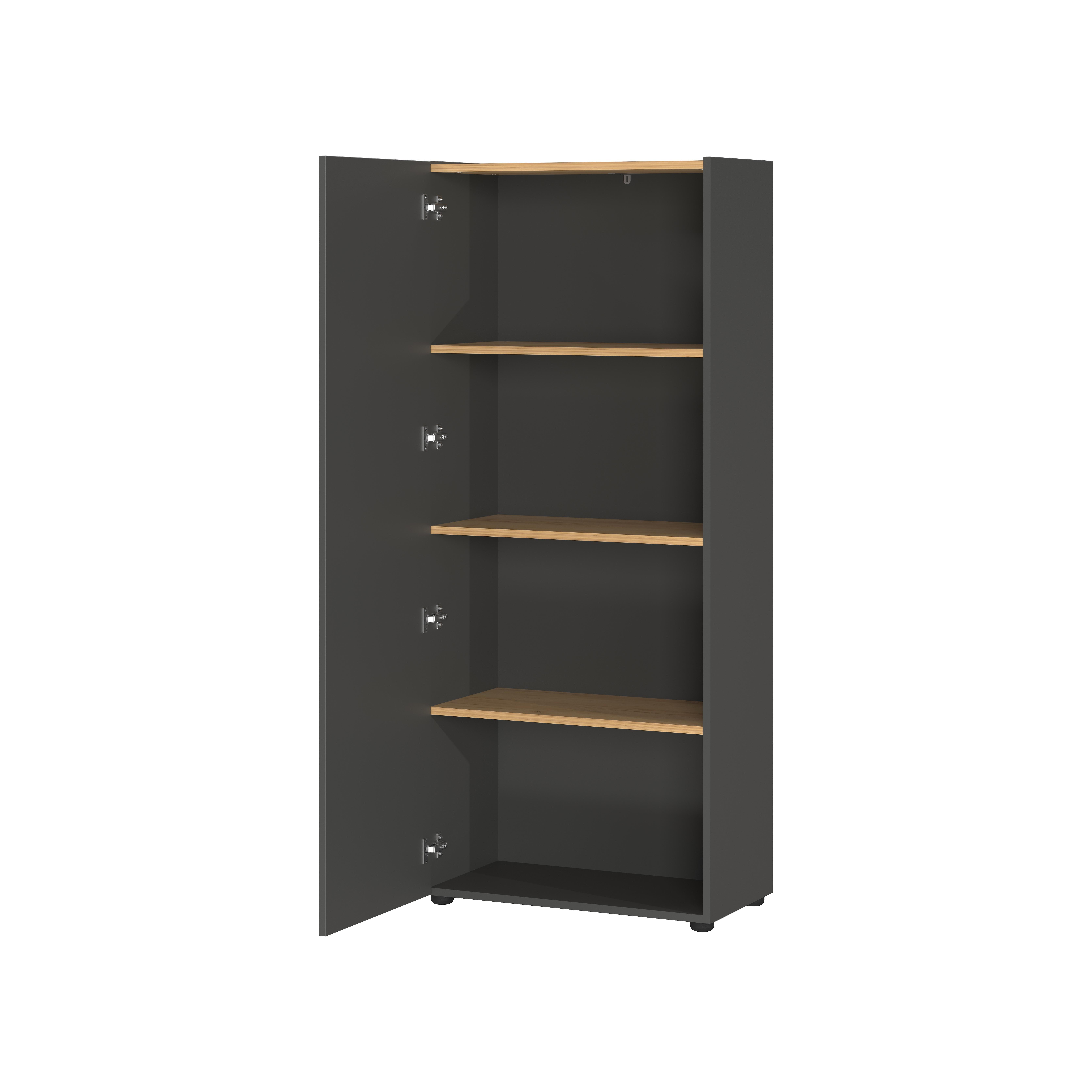 De hoge kantoorkast Orlando Grafiet 145 cm biedt veel opbergruimte in een compact ontwerp. De kast heeft een 2/3-deur en vier vakken op ordnerhoogte. De planken zijn belastbaar tot 10 kg, terwijl de onderste plank tot 25 kg kan dragen. De kast heeft een krasbestendige afwerking en kan zowel links als rechts worden gemonteerd.