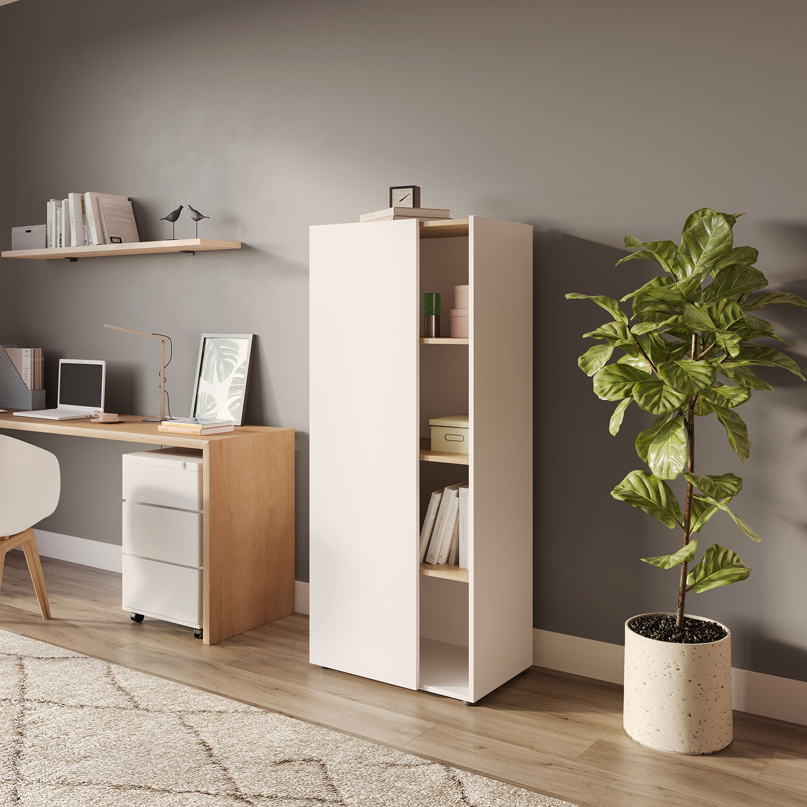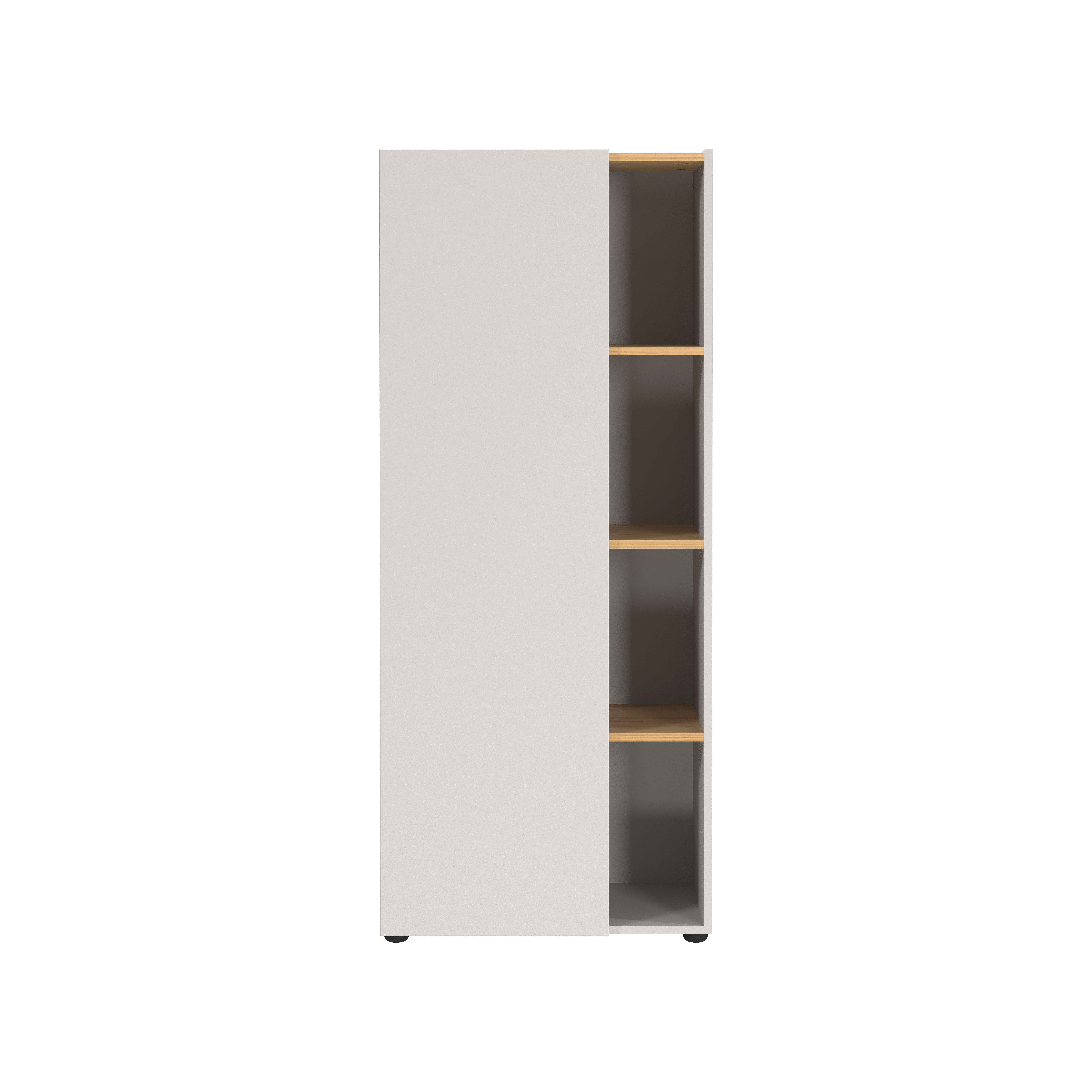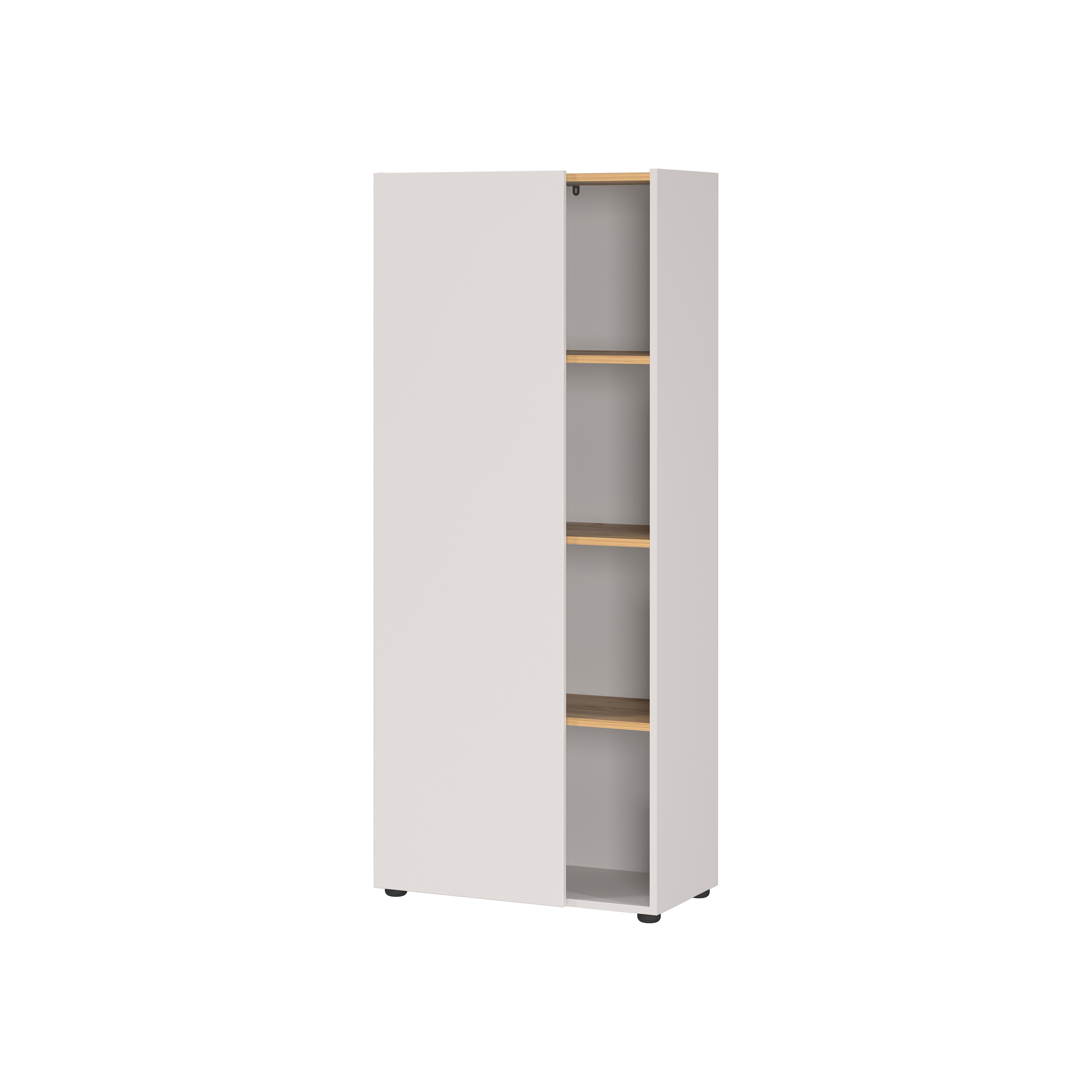 De hoge kantoorkast Orlando Kasjmier 145 cm combineert een strak design met veel opbergruimte. De kast heeft vier opbergvakken en een 2/3-deur, waardoor er zowel open als gesloten ruimte ontstaat. De planken kunnen tot 10 kg dragen, en de onderste plank tot 25 kg. De deuren kunnen links of rechts worden gemonteerd.