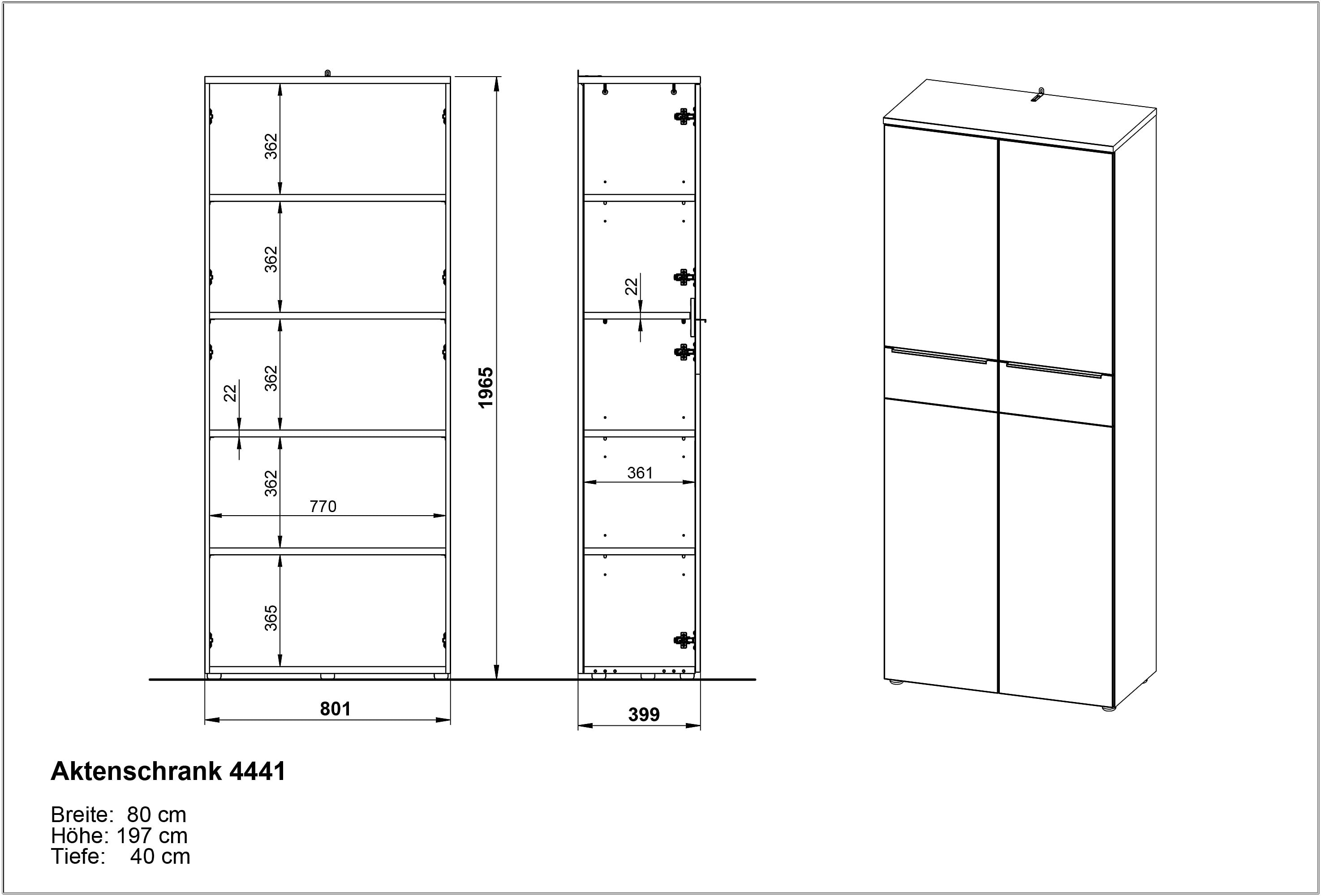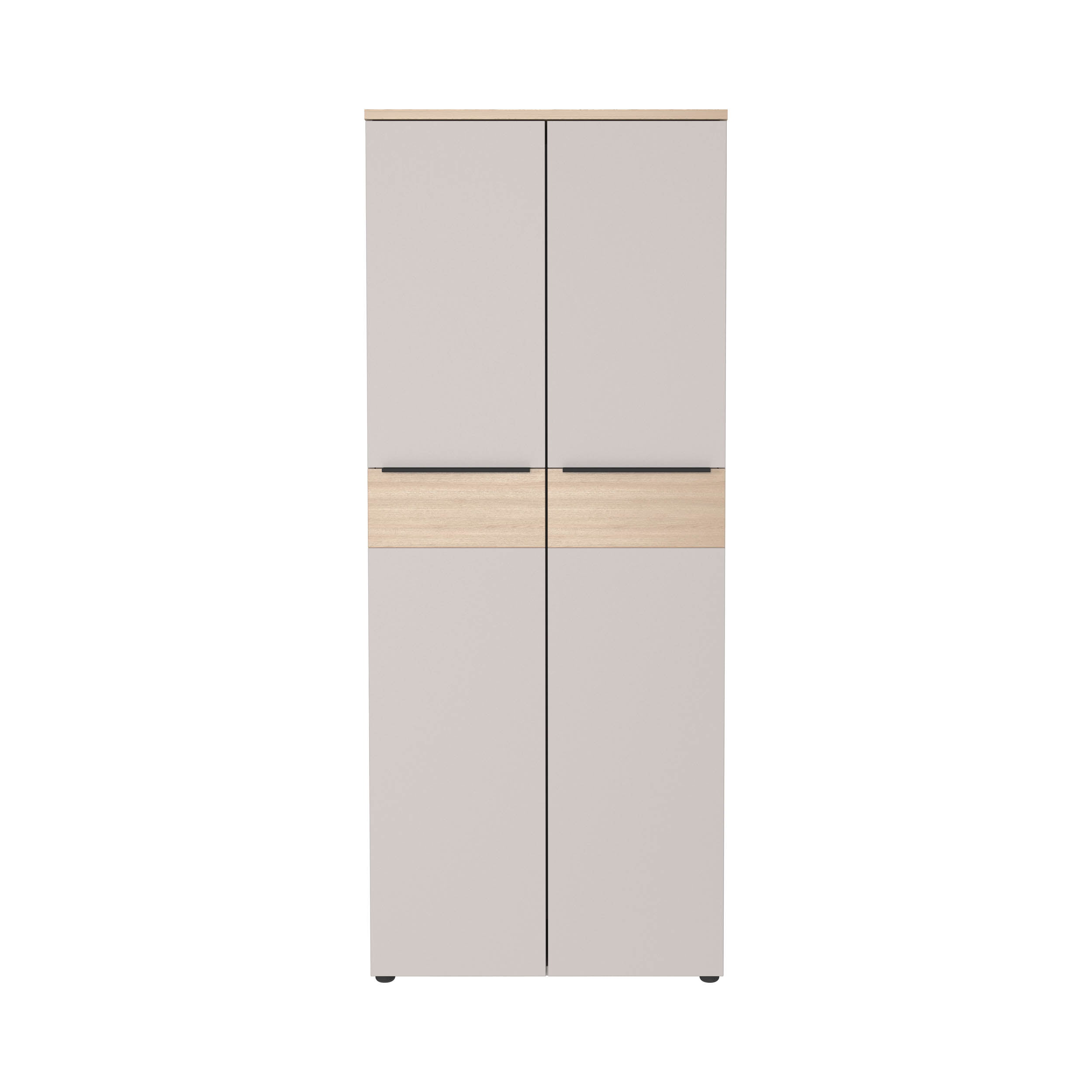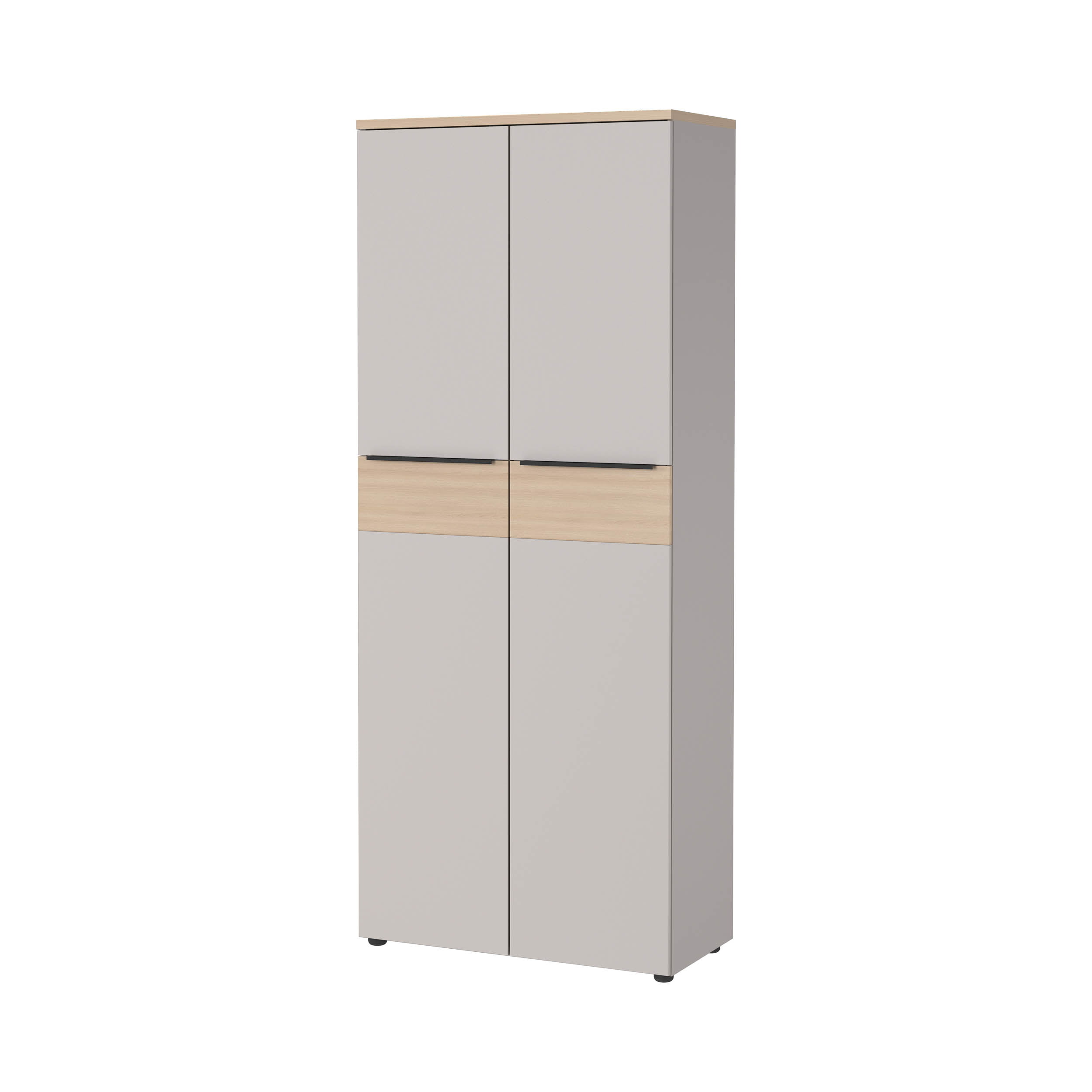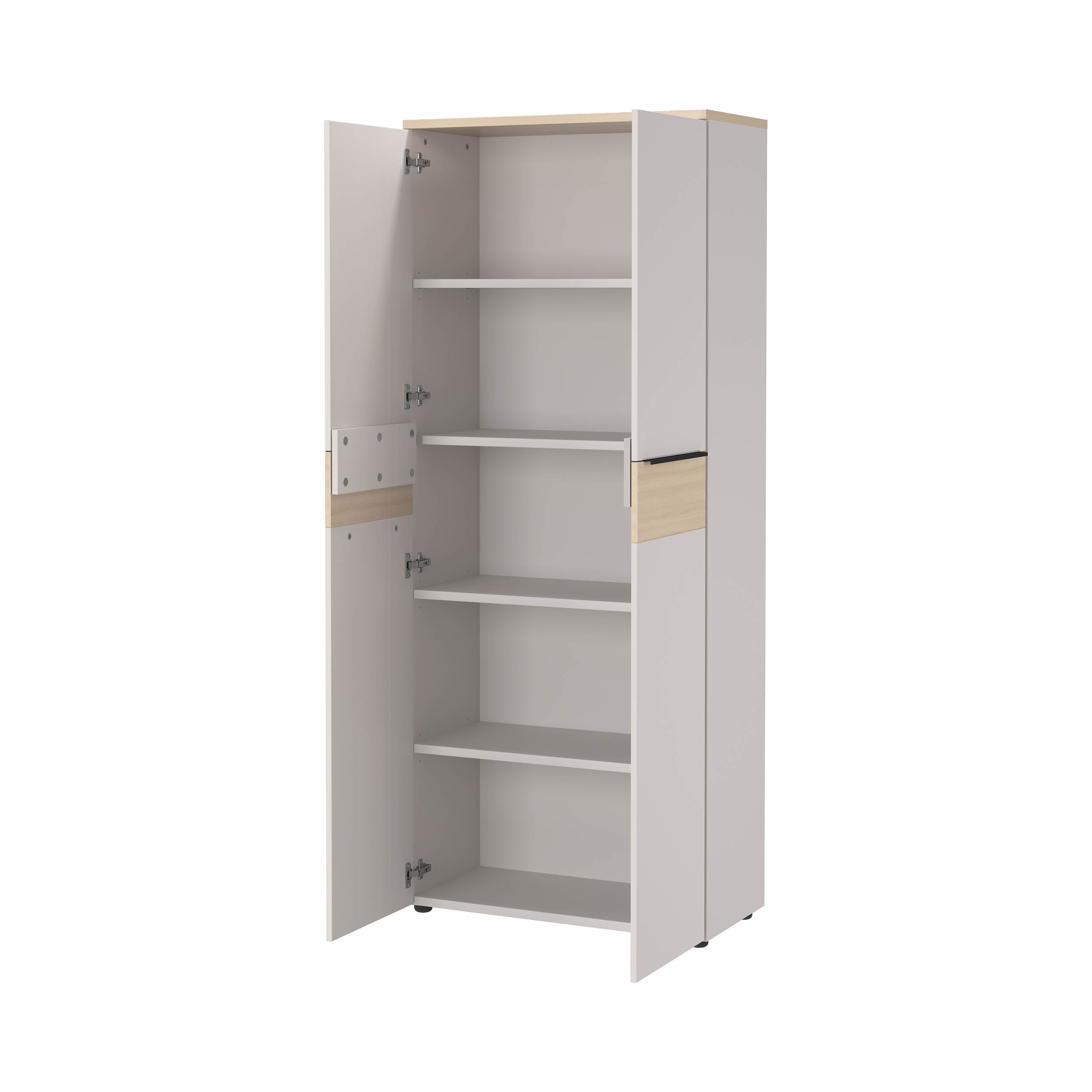 Achter de twee deuren zitten drie verstelbare planken en één vaste plank, elk belastbaar tot 22 kg. Zo creëer je vijf ordnerhoogtes. Het onderste vak kan tot 30 kg dragen. De deuren sluiten zacht dankzij geïntegreerde dempers en zijn voorzien van metalen grepen.