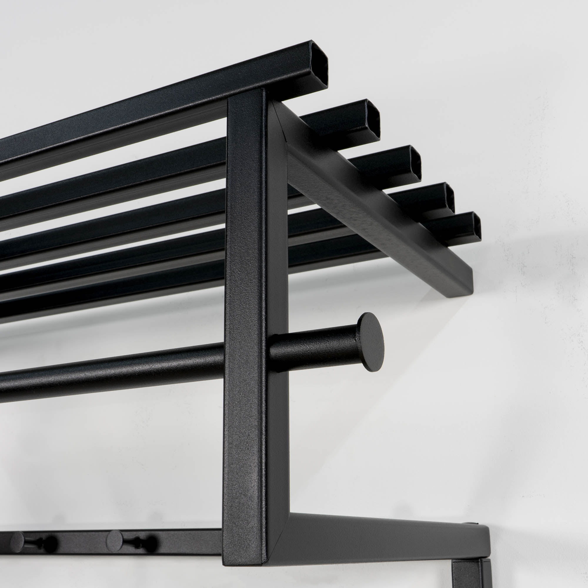 Met deze zeer stevige kapstok ben je verzekerd van een lange levensduur, volledig vervaardigd van sterk staal afgewerkt met een stevige poedercoating. Voldoende ruimte voor alle jassen, tassen en sjaals aan één van de 10 haken of aan een kledinghanger op de kledingroede. Bovenop voldoende ruimte voor petten en/of hoeden. Ook handig voor kleine kinderen die zelf hun jas op kunnen hangen. Leuk te combineren met de andere artikelen uit deze serie.
