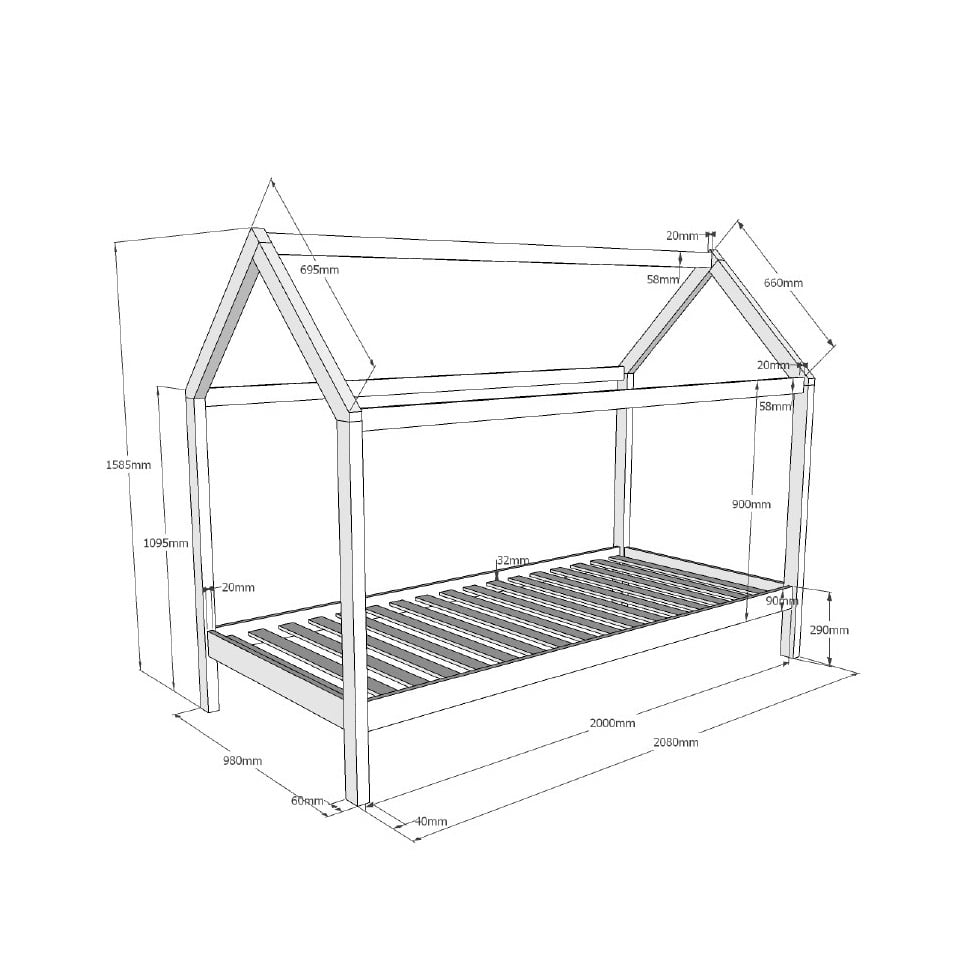 Dit huisbed is door zijn minimalistische design toepasbaar in elk interieur. Het bed is vervaardigd uit massief grenen, wit gelakt en geschikt voor elke matras van 90×200 cm. De lattenbodem is inbegrepen. Door de balken te gebruiken om slingers, vlaggetjes of lampjes aan op te hangen maak je de kinderkamer direct gezellig! Ook te combineren met een lade voor een opgeruimde kinderkamer of een slaapplaats voor alle vriendjes. Verkrijgbaar in verschillende uitvoeringen.