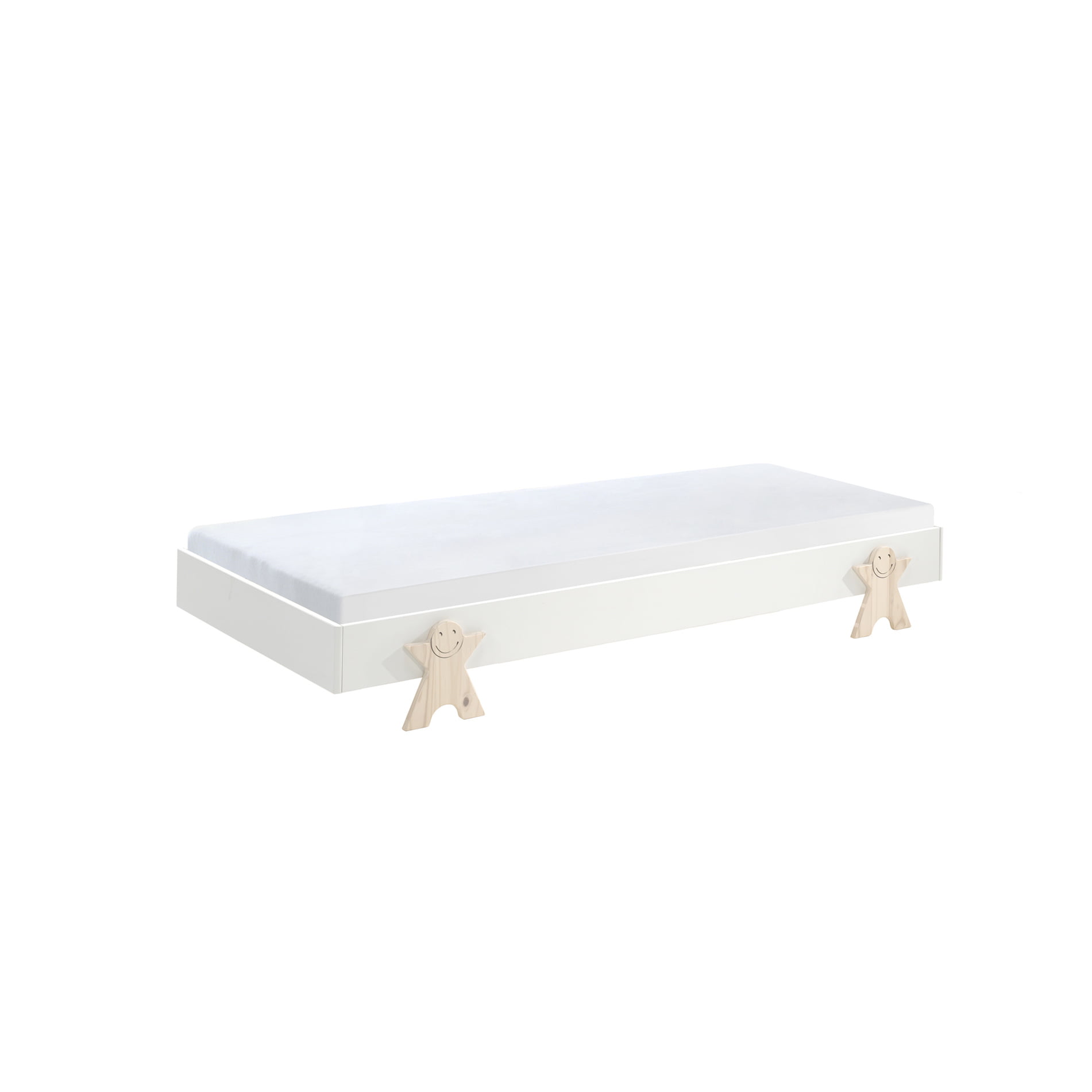 Met dit zeer handige stapelbare bed heb je altijd voldoende slaapplaatsen. Het bed is vervaardigd uit een combinatie van massief grenen en MDF en is wit gelakt. Het bed is gemakkelijk stapelbaar waarbij de matrassen kunnen blijven liggen. De bedden zijn inclusief lattenbodem. De massieve poten zijn in de vorm van een poppetje met een lach op zijn gezicht.
