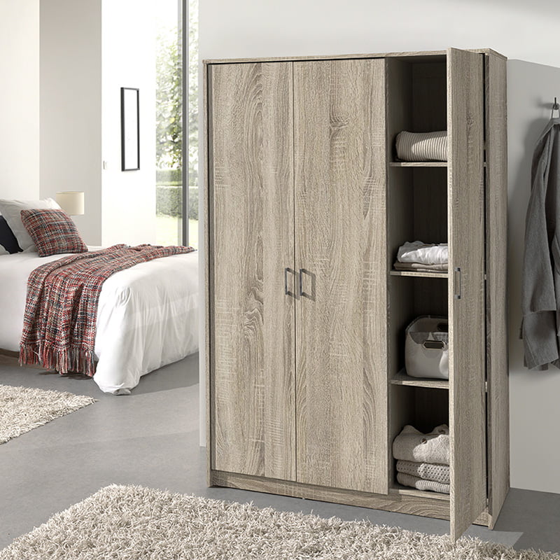 Deze handige compacte kledingkast biedt volop ruimte voor al je hangkleding aan de roede en heeft daarboven nog een opberg vak. Achter de rechterdeur bevinden zich 4 legplanken voor al je andere spullen. De kast is vervaardigd uit stevig plaatmateriaal, gemakkelijk te monteren en is door zijn eenvoud toepasbaar in elk interieur. De kast is verkrijgbaar in meerdere kleuren en afmetingen.
