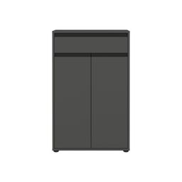 De kolomkast Pula Grafiet 181 cm is een hoge, slanke opbergoplossing met een eigentijdse uitstraling. Dit meubel beschikt over een lade, twee deuren met daarachter verstelbare planken en een open compartiment. De planken, lade en open ruimte kunnen elk tot 10 kg dragen. De kast is voorzien van drie zwarte metalen handgrepen en vier stevige kunststof meubelglijders. Dankzij de krasbestendige melamine coating en de stootvaste ABS-randen is dit meubel bestand tegen dagelijks gebruik. De deuren kunnen links of rechts worden gemonteerd voor extra flexibiliteit, terwijl de geïntegreerde demping een geruisloze sluiting garandeert.