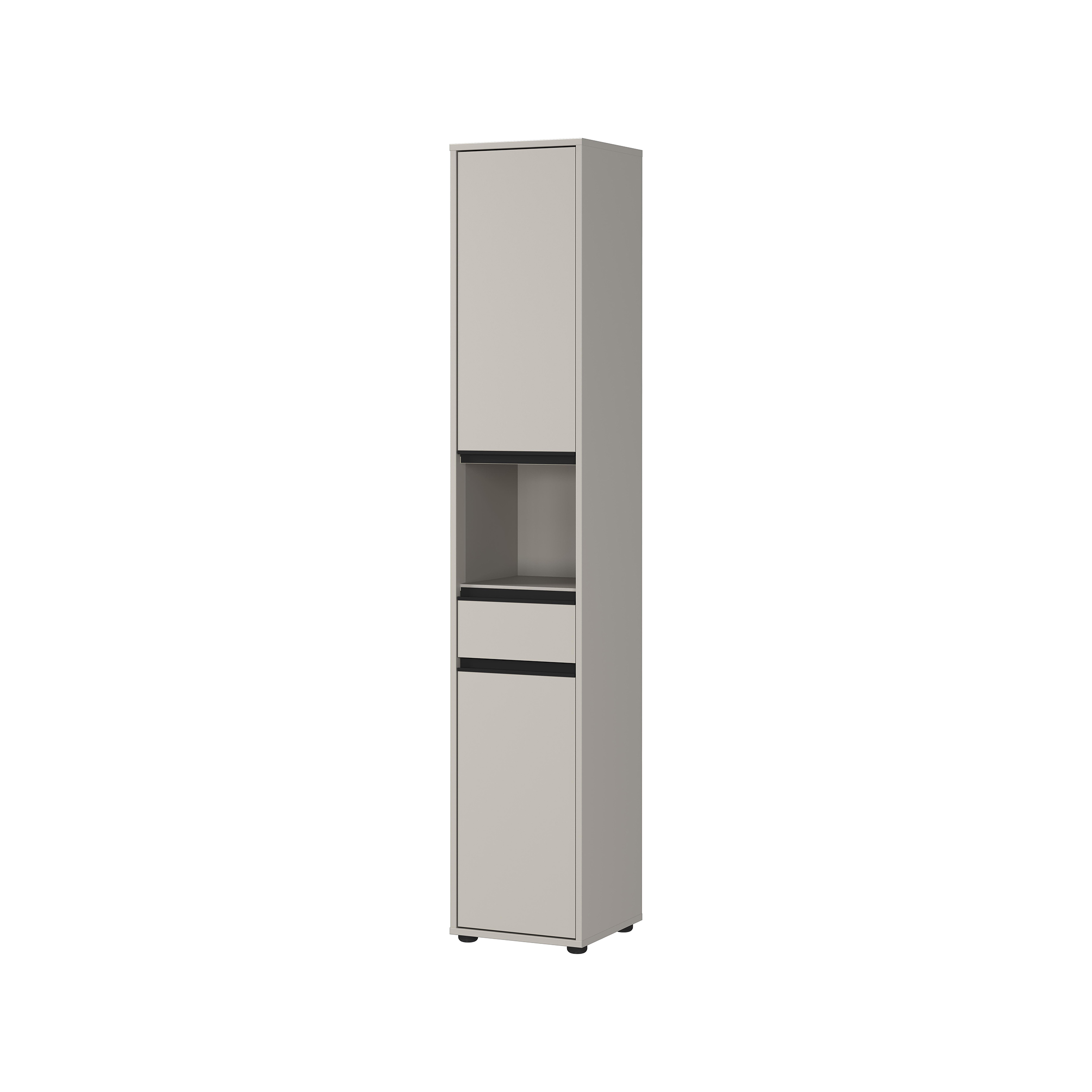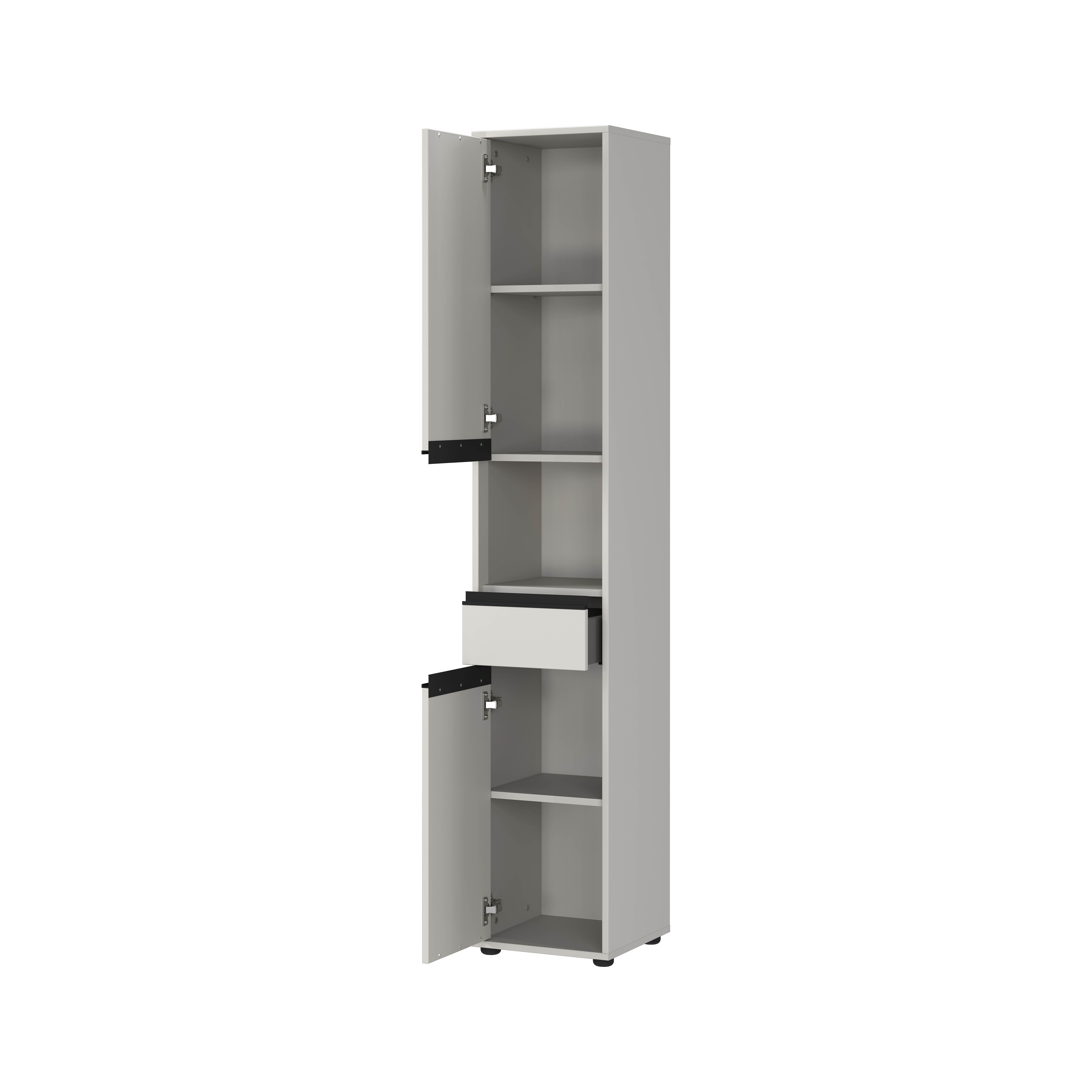 De kolomkast Pula Lichtgrijs 181 cm biedt maximale opbergruimte in een slank ontwerp. Dit meubel heeft een lade die belastbaar is tot 10 kg, twee deuren met daarachter verstelbare planken en een open compartiment, die elk tot 10 kg kunnen dragen. De kast is voorzien van drie zwarte metalen handgrepen en vier stevige kunststof meubelglijders. De krasbestendige melamine coating en de stootvaste ABS-randen zorgen voor een lange levensduur. De deuren kunnen zowel links als rechts gemonteerd worden voor meer flexibiliteit, terwijl de geïntegreerde demping een zacht en geruisloos sluitmechanisme biedt.