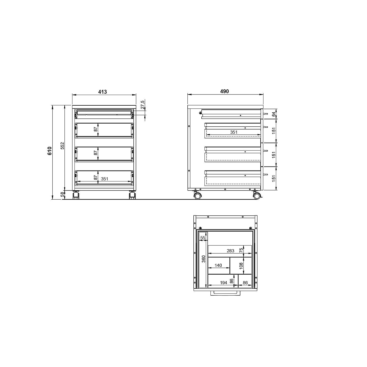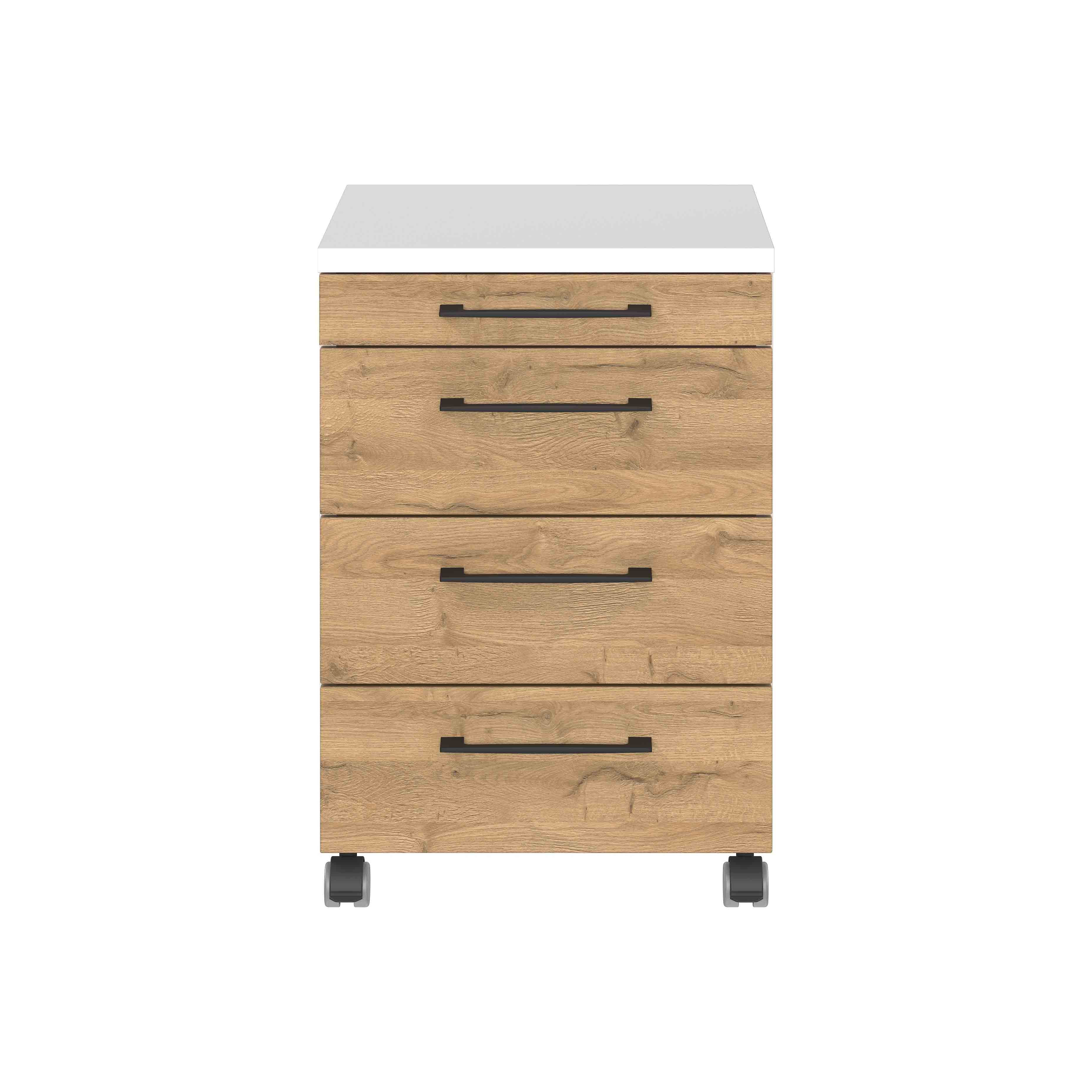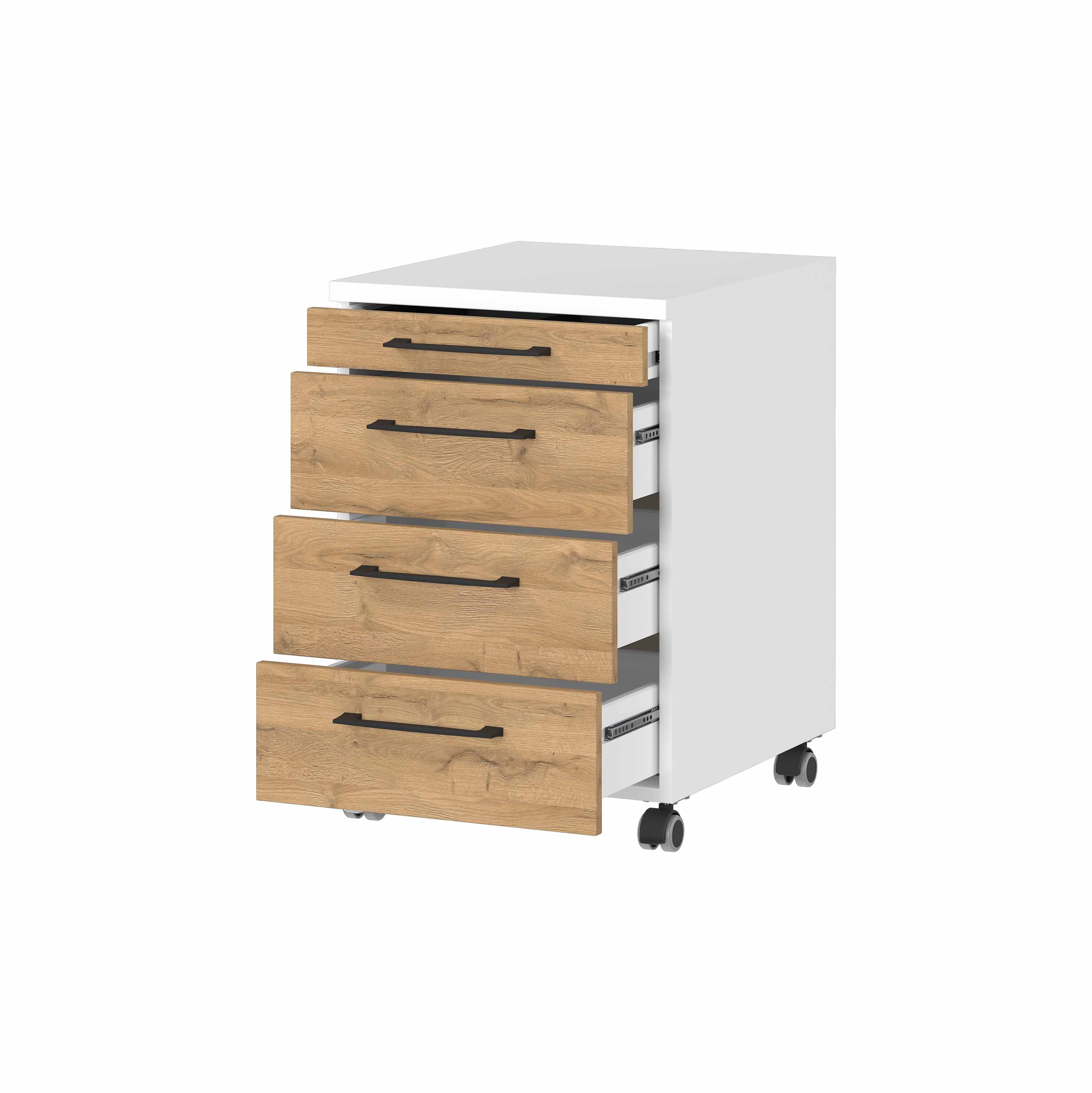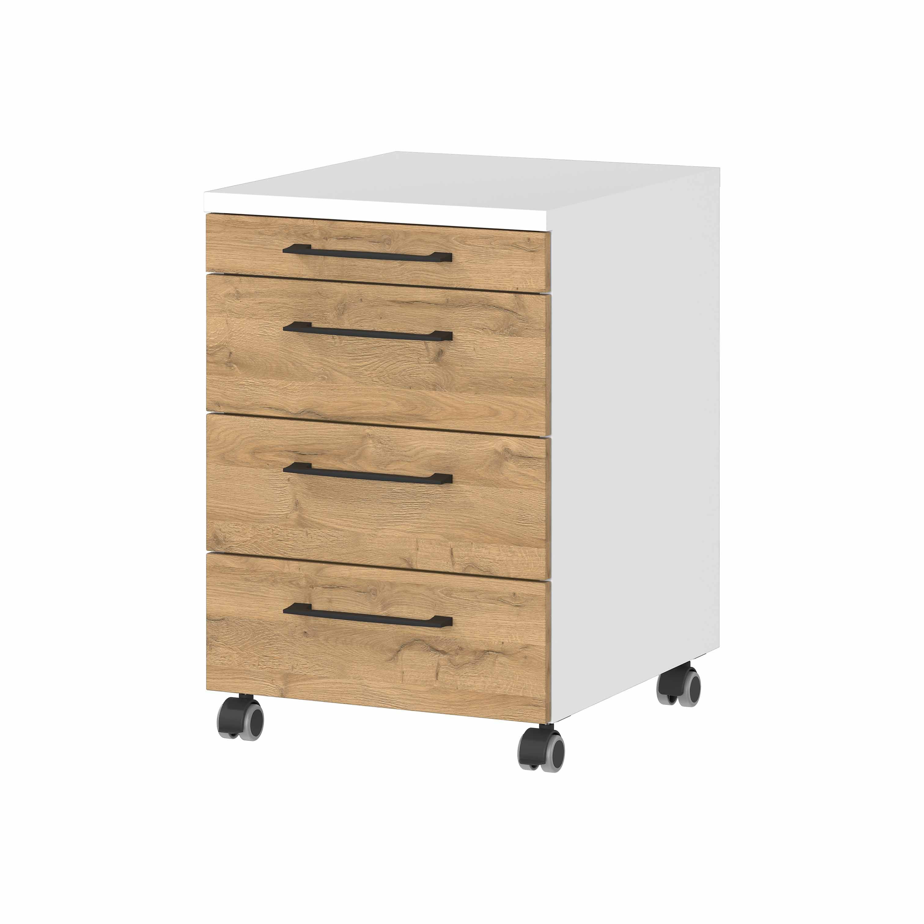 Dit verrijdbare ladeblok is ideaal als extra opbergruimte naast je bureau. Met vier lades kun je documenten, kantoorartikelen en kleine accessoires overzichtelijk kwijt. Het meubel is 42 cm breed, 61 cm hoog en 49 cm diep en heeft een witte romp met eikenrepro fronten. Dankzij de wieltjes schuif je het ladeblok moeiteloos onder je bureau of verplaats je het snel binnen de ruimte.