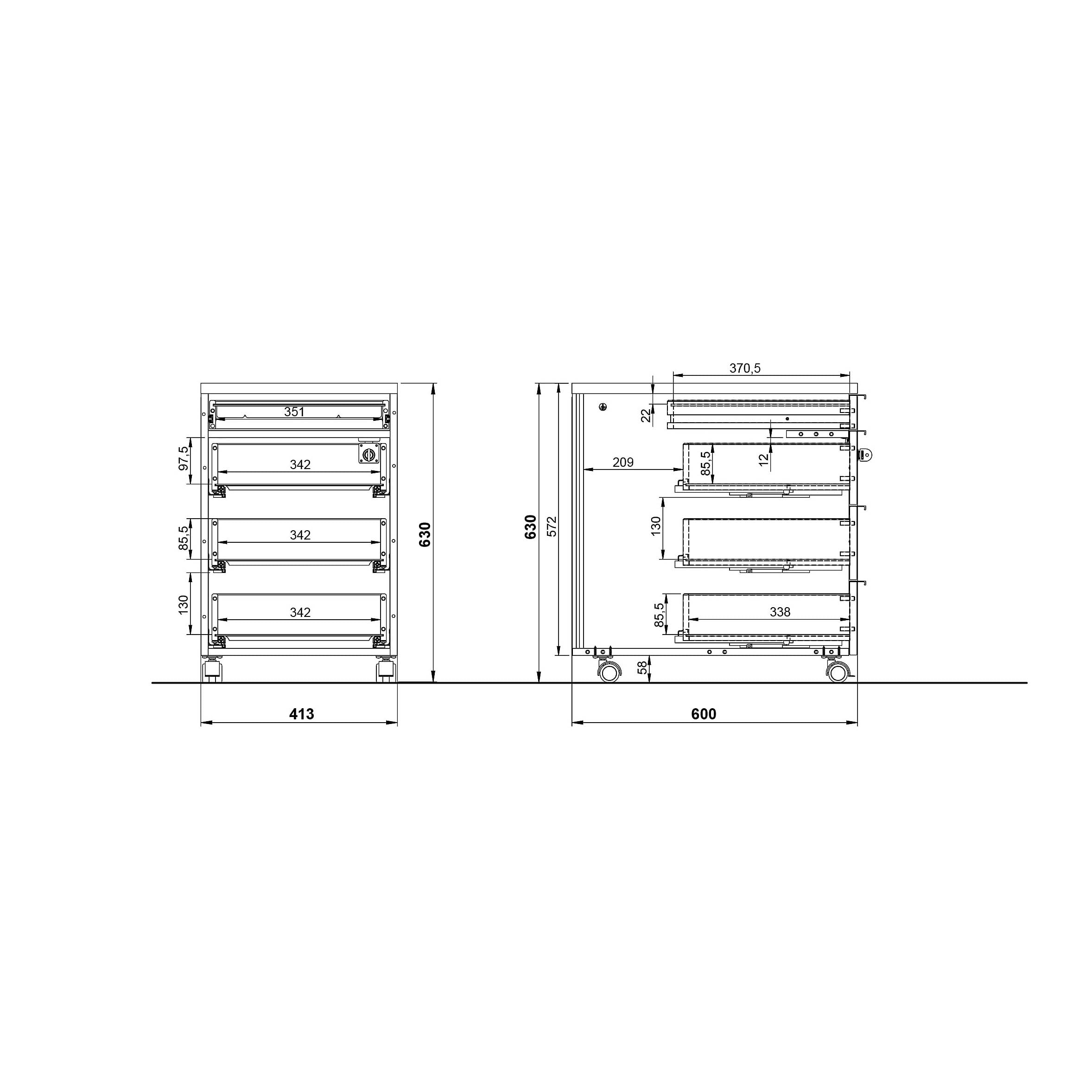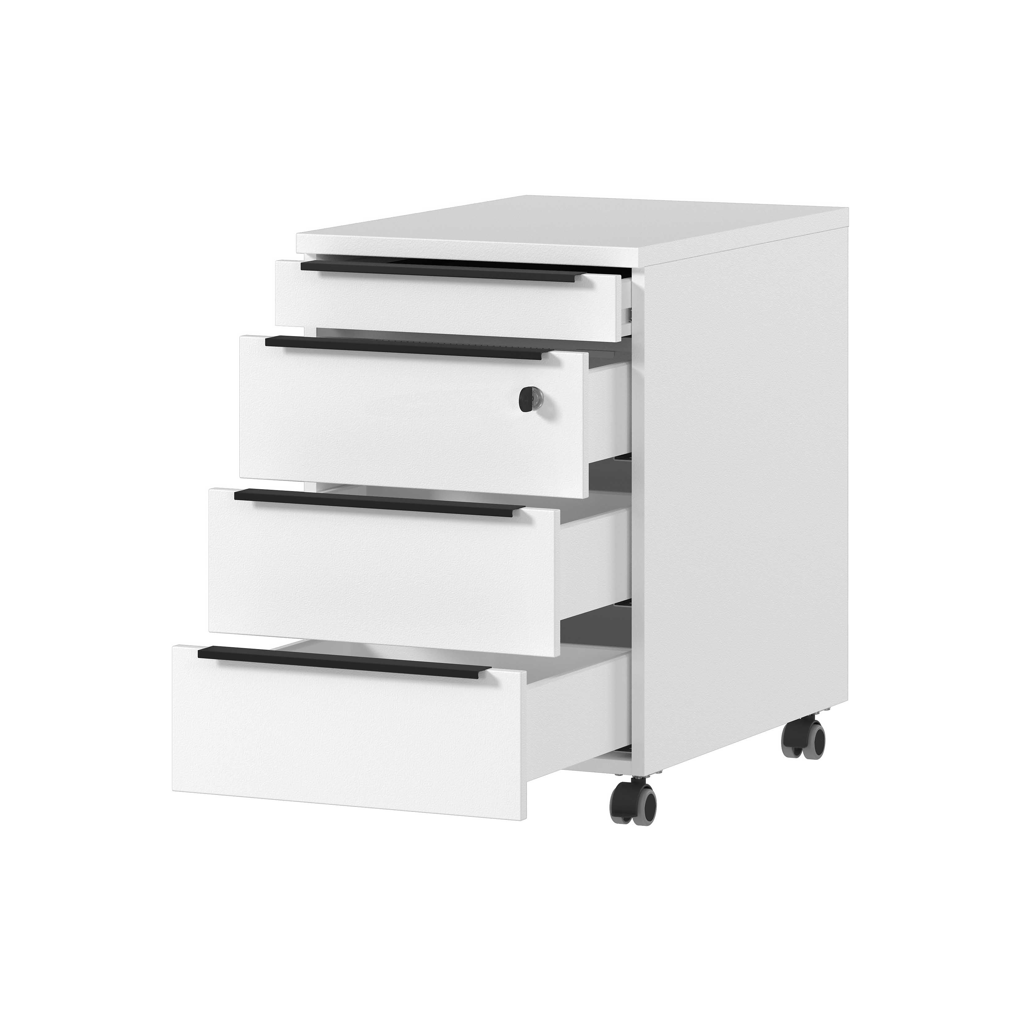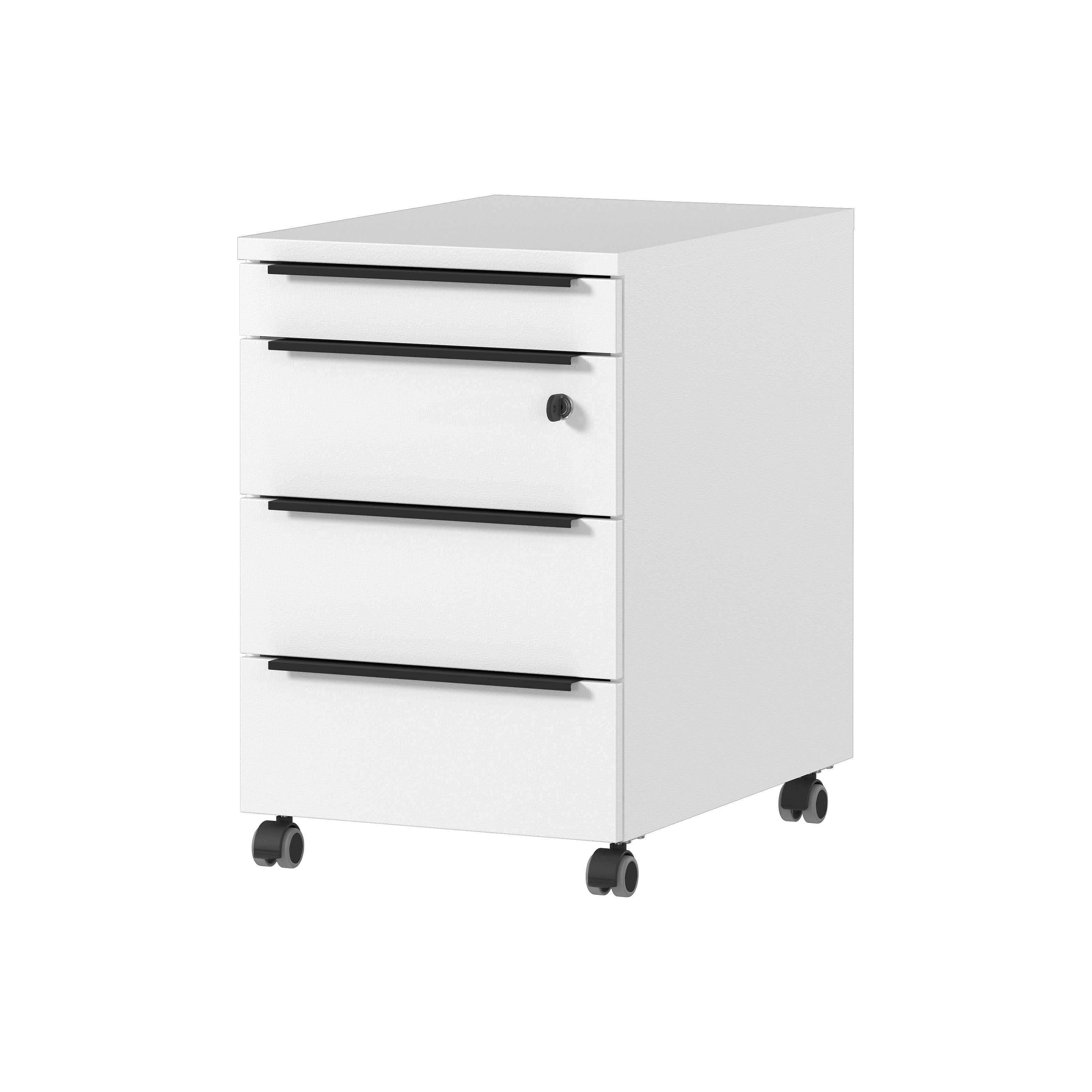 Dit ladeblok is uitgevoerd in de kleur wit en heeft vier zwarte handgrepen van poeder gecoat metaal. Dankzij de vier rubberen zwenkwielen, waarvan er twee vergrendelbaar zijn, is dit ladeblok gemakkelijk te verplaatsen en te vergrendelen.