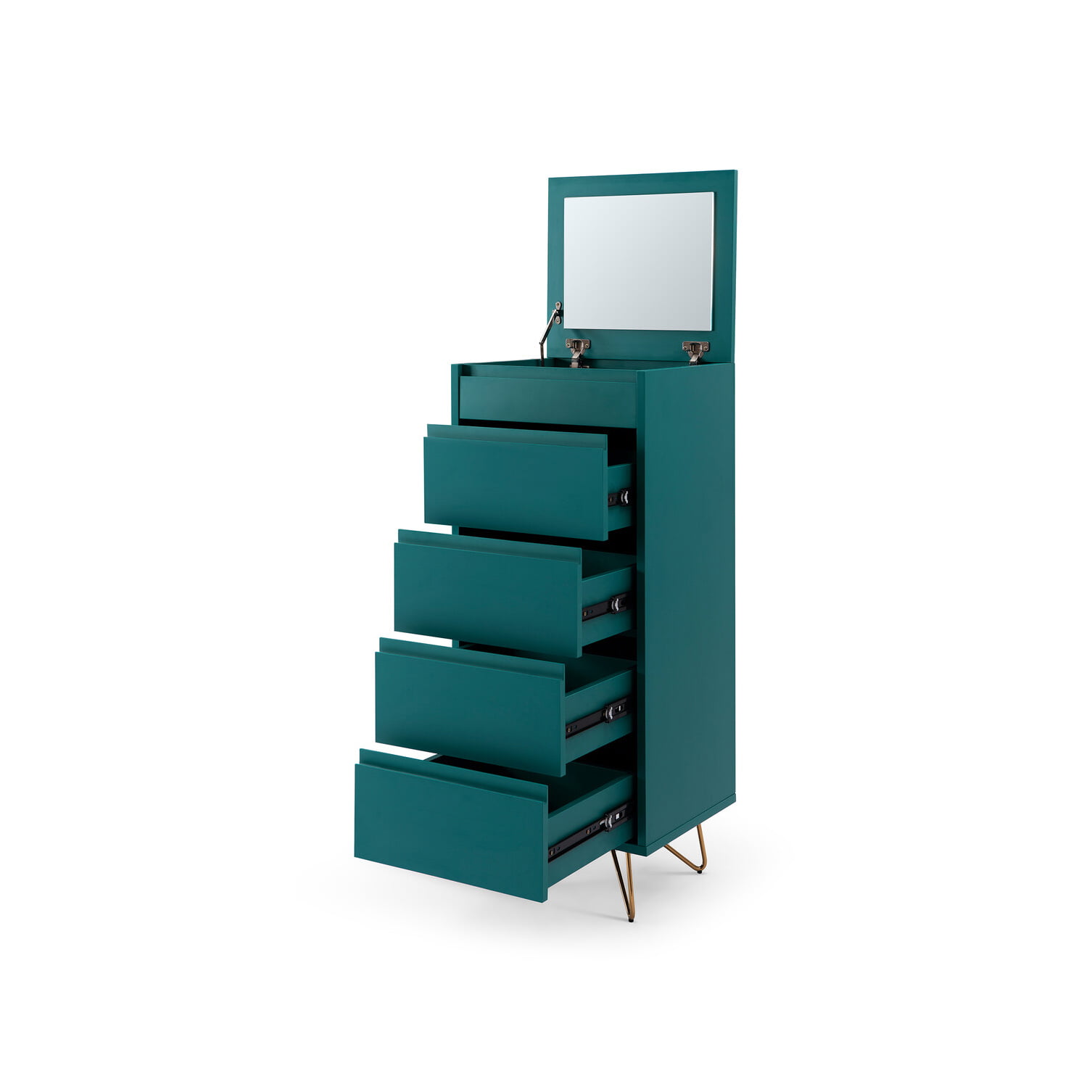 Deze stijlvolle ladekast biedt voldoende ruimte voor al je spullen, bovenop de ladekast is een uitklapbare spiegel aanwezig. De ladekast is vervaardigd uit een stevige MDF en heeft een matte afwerking. Door de combinatie met zijn gouden metalen poten een echte eyecatcher in je interieur. Gemakkelijk te monteren doormiddel van bijgeleverde montagehandleiding. Wandmontage vereist. Bekijk ook de andere elementen uit deze serie.