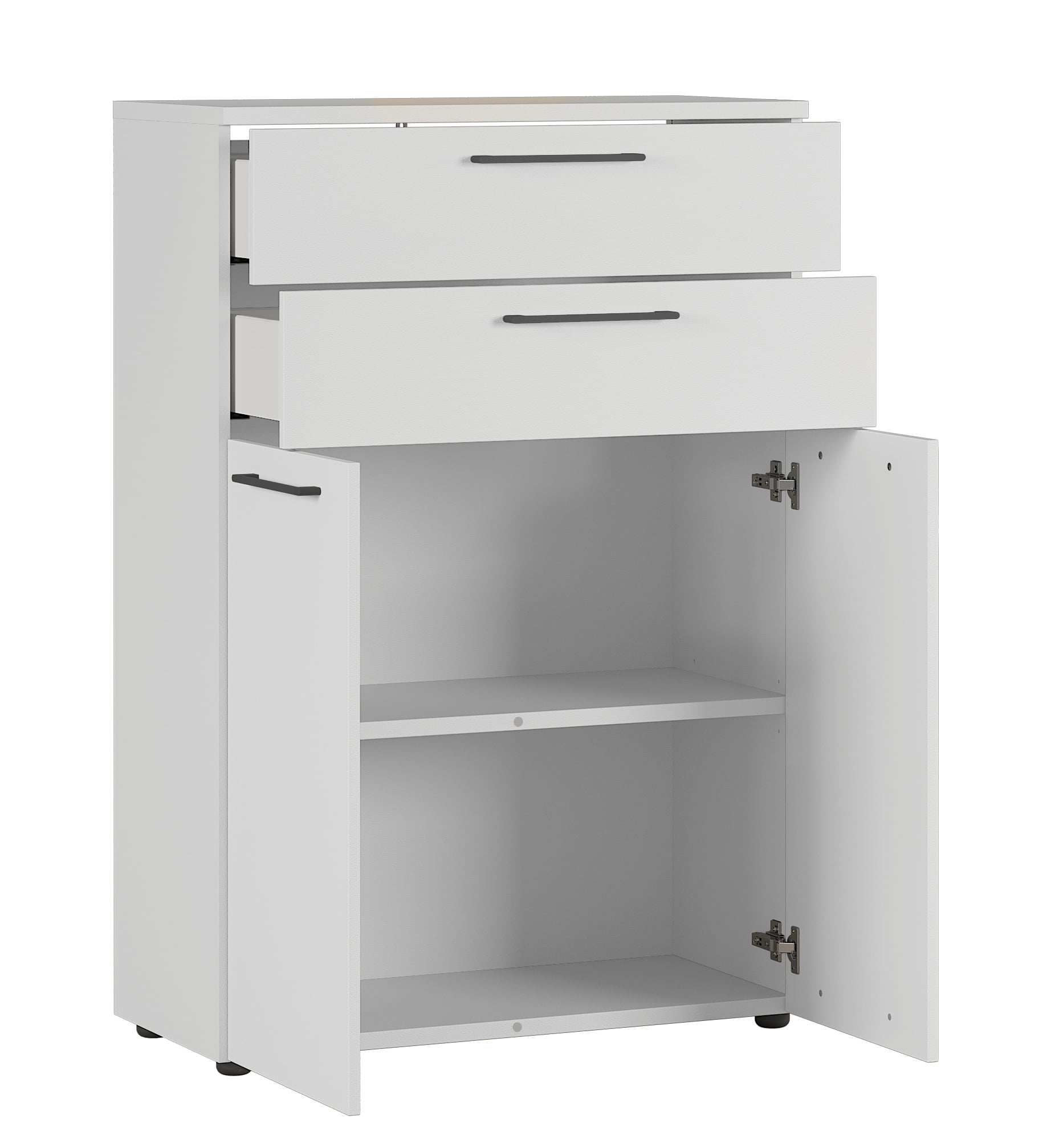 Deze lage kantoorkasten kan perfect gecombineerd worden met de andere kasten uit deze serie Ergonoma. De kast heeft 2 handige laden bovenin en 2 daaronder afsluitbare deuren. Daarachter zijn 2 vakken die in hoogte aan te passen zijn.