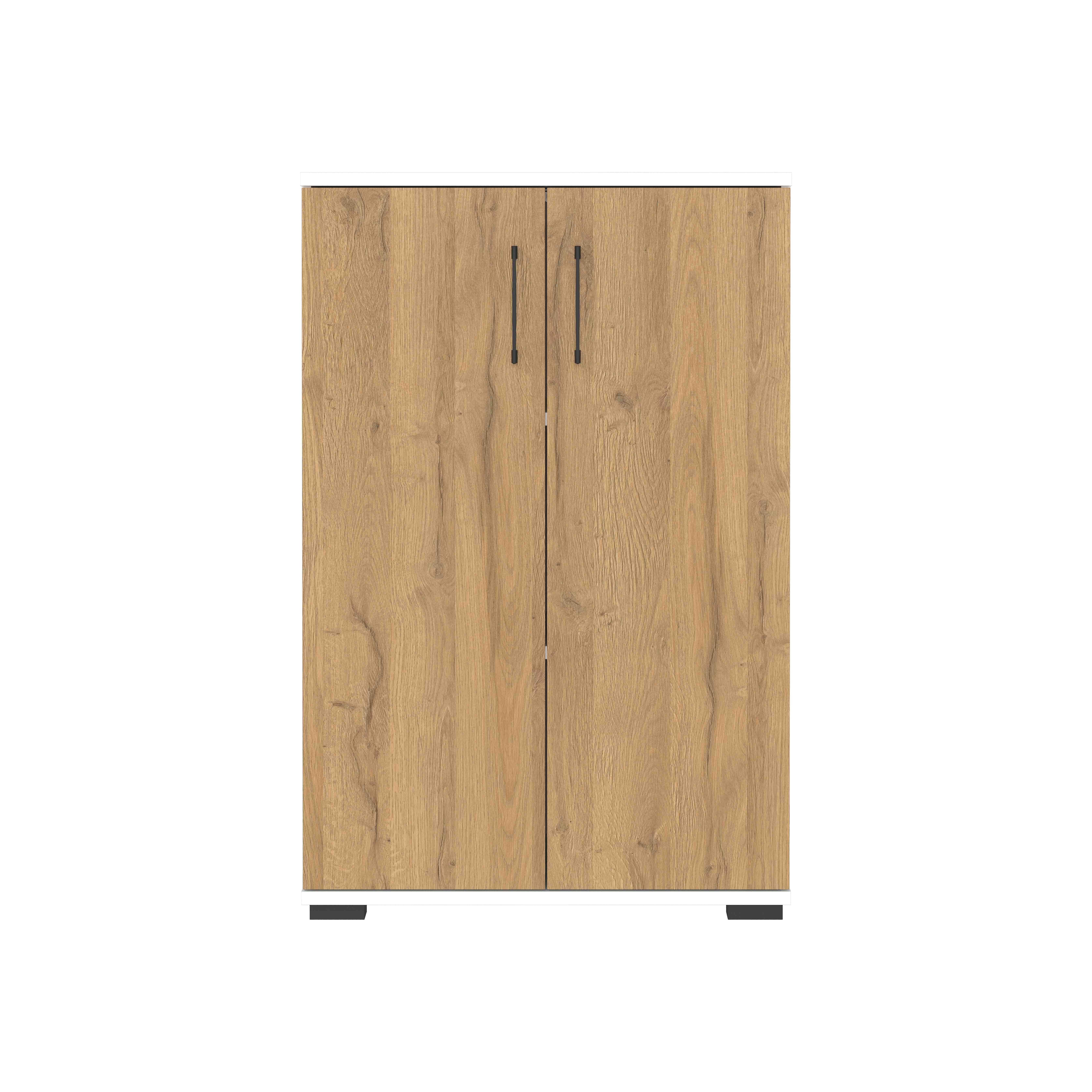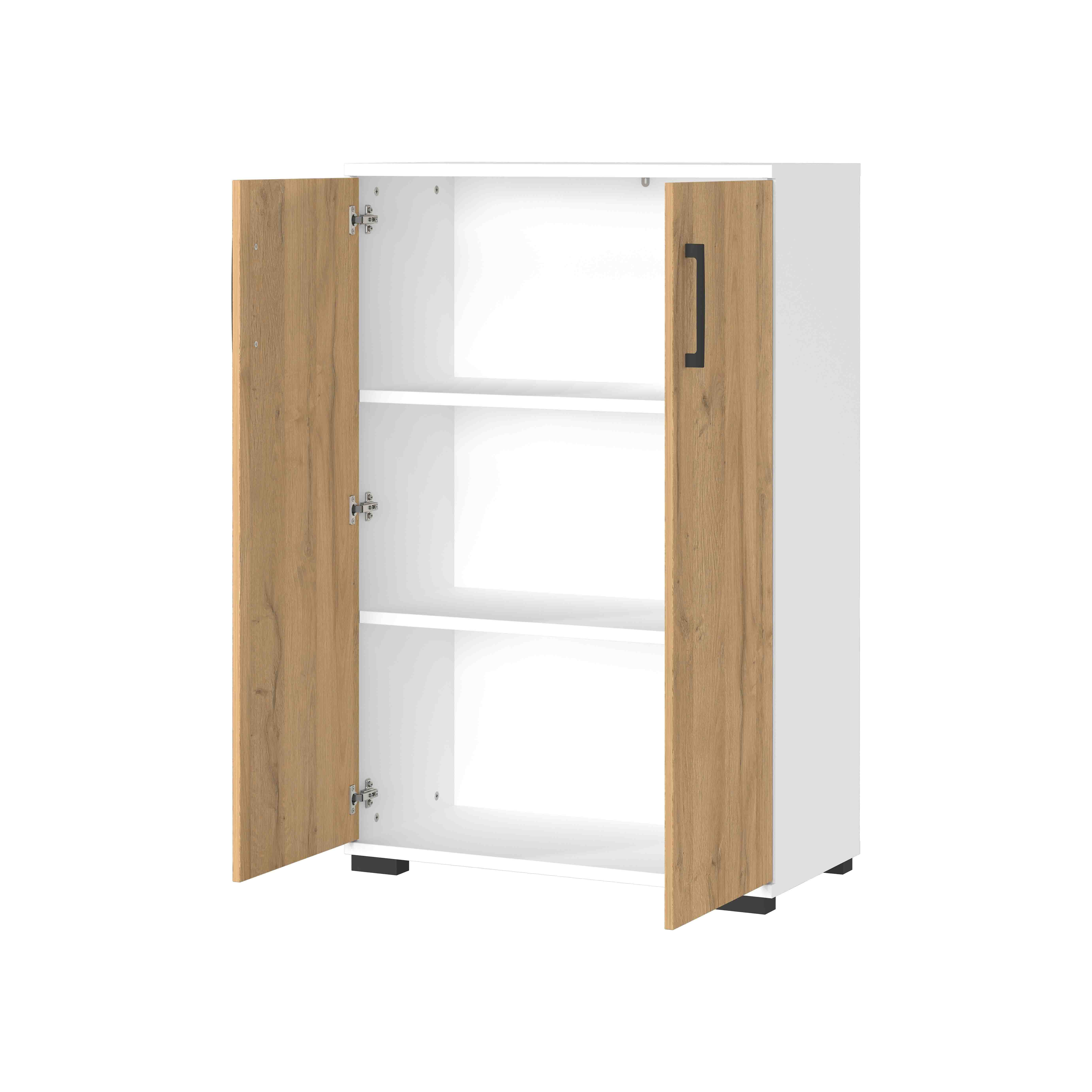 Deze lage kantoorkast biedt een praktische en overzichtelijke opbergoplossing voor ordners en kantoorspullen. Achter de twee deuren bevinden zich vaste legplanken waarmee drie compartimenten op ordnerhoogte ontstaan. De kast is 80 cm breed, 123 cm hoog en 40 cm diep. Dankzij de witte kast en deuren in eikenrepro past dit meubel perfect in een moderne werkruimte. De krasvaste en slijtbestendige afwerking zorgt ervoor dat de kast mooi blijft, zelfs bij intensief gebruik.