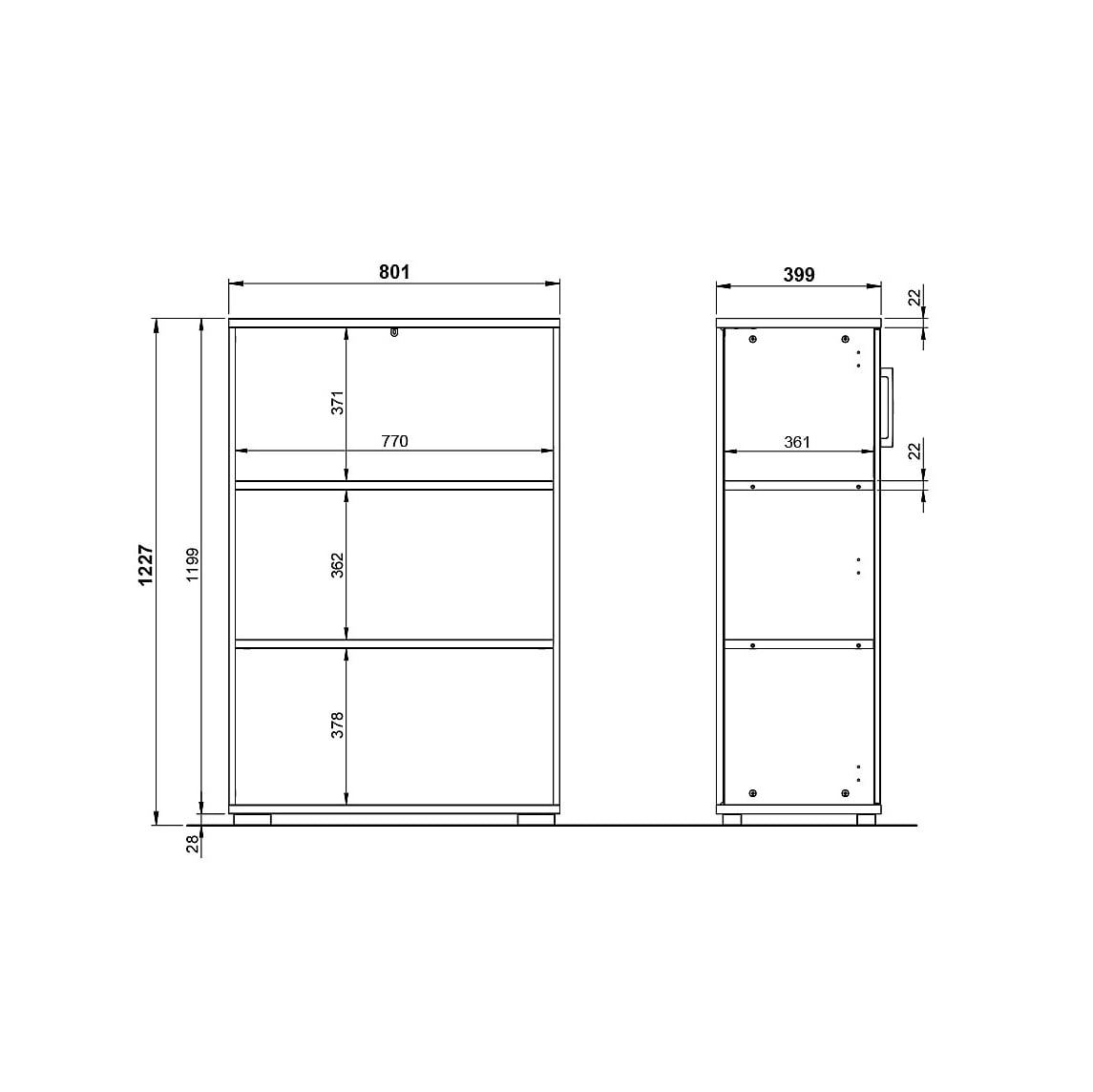- Twee deuren met vaste planken, geschikt voor ordners