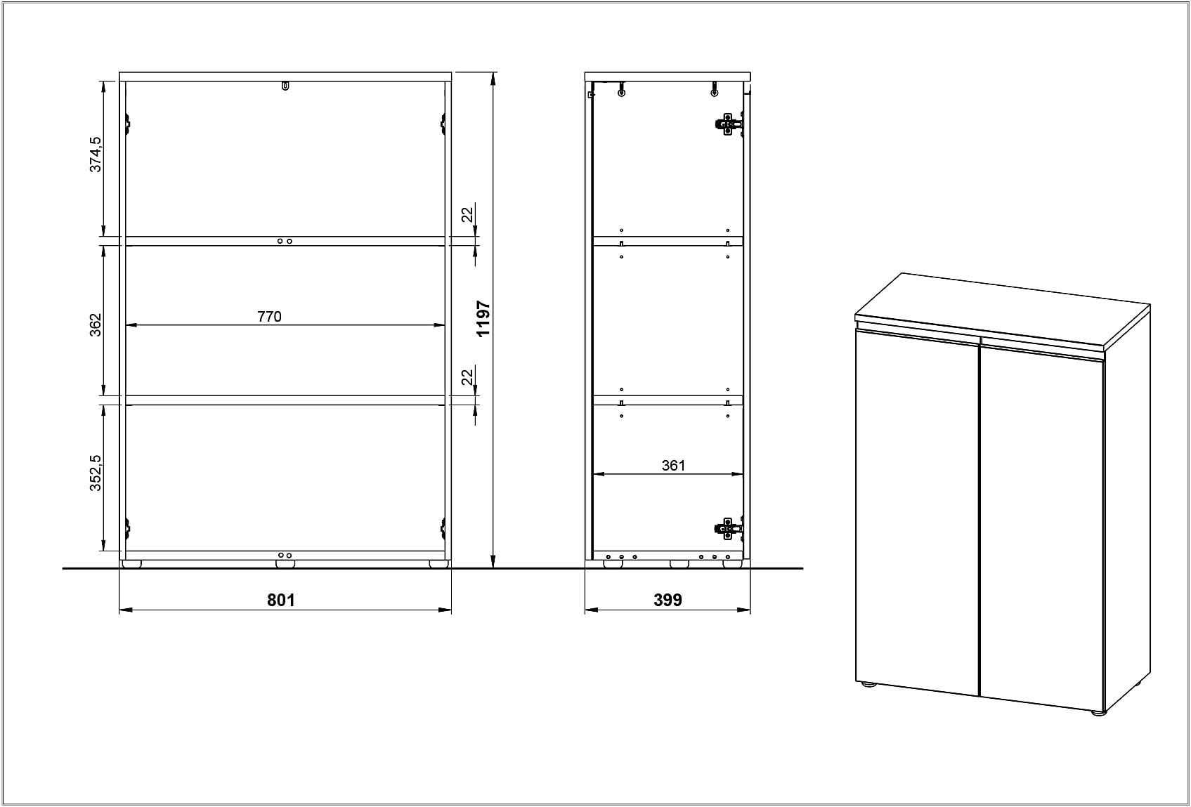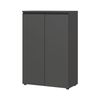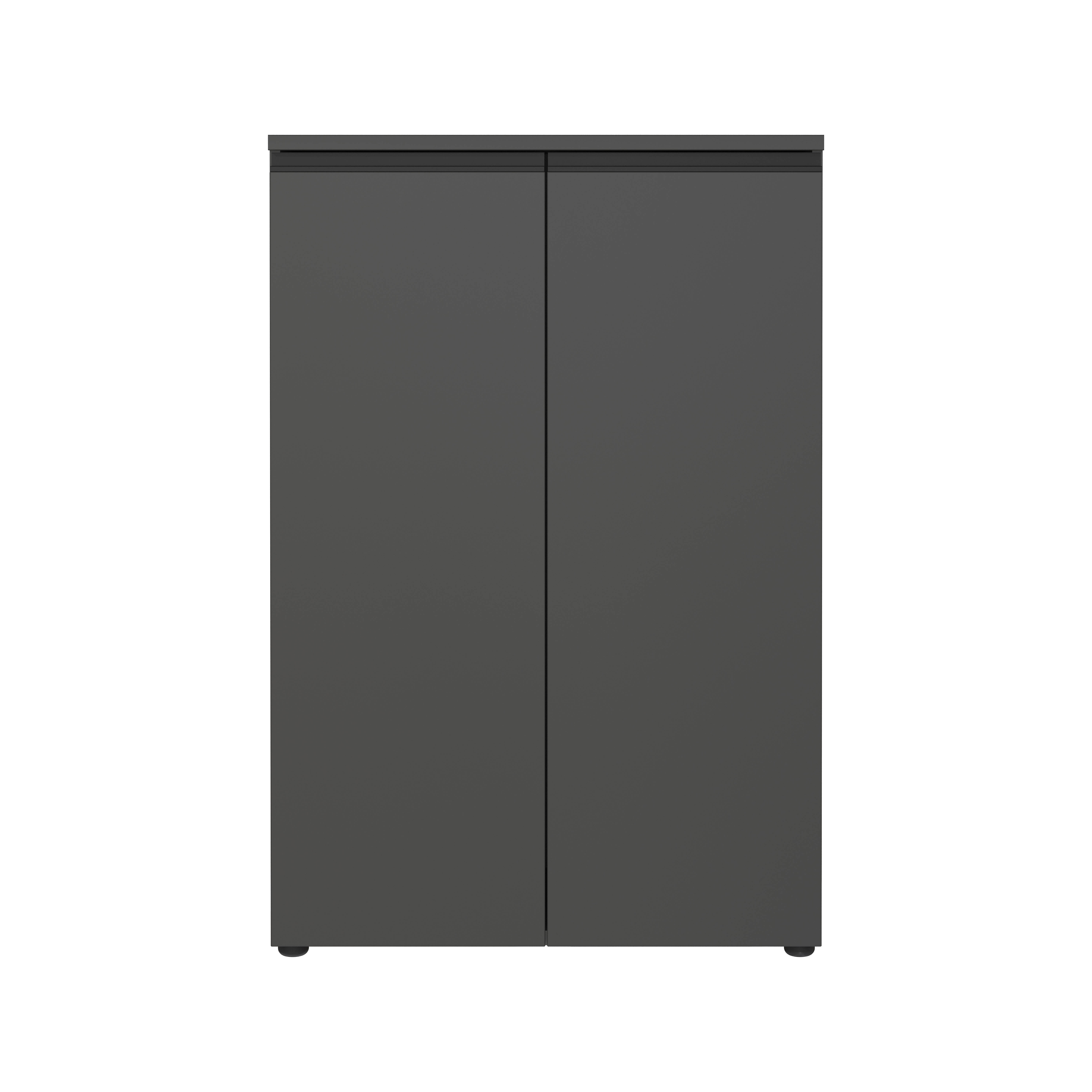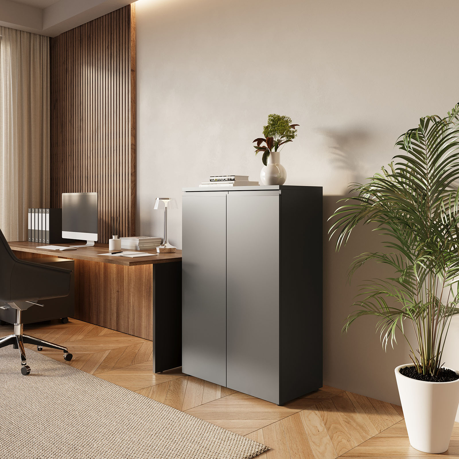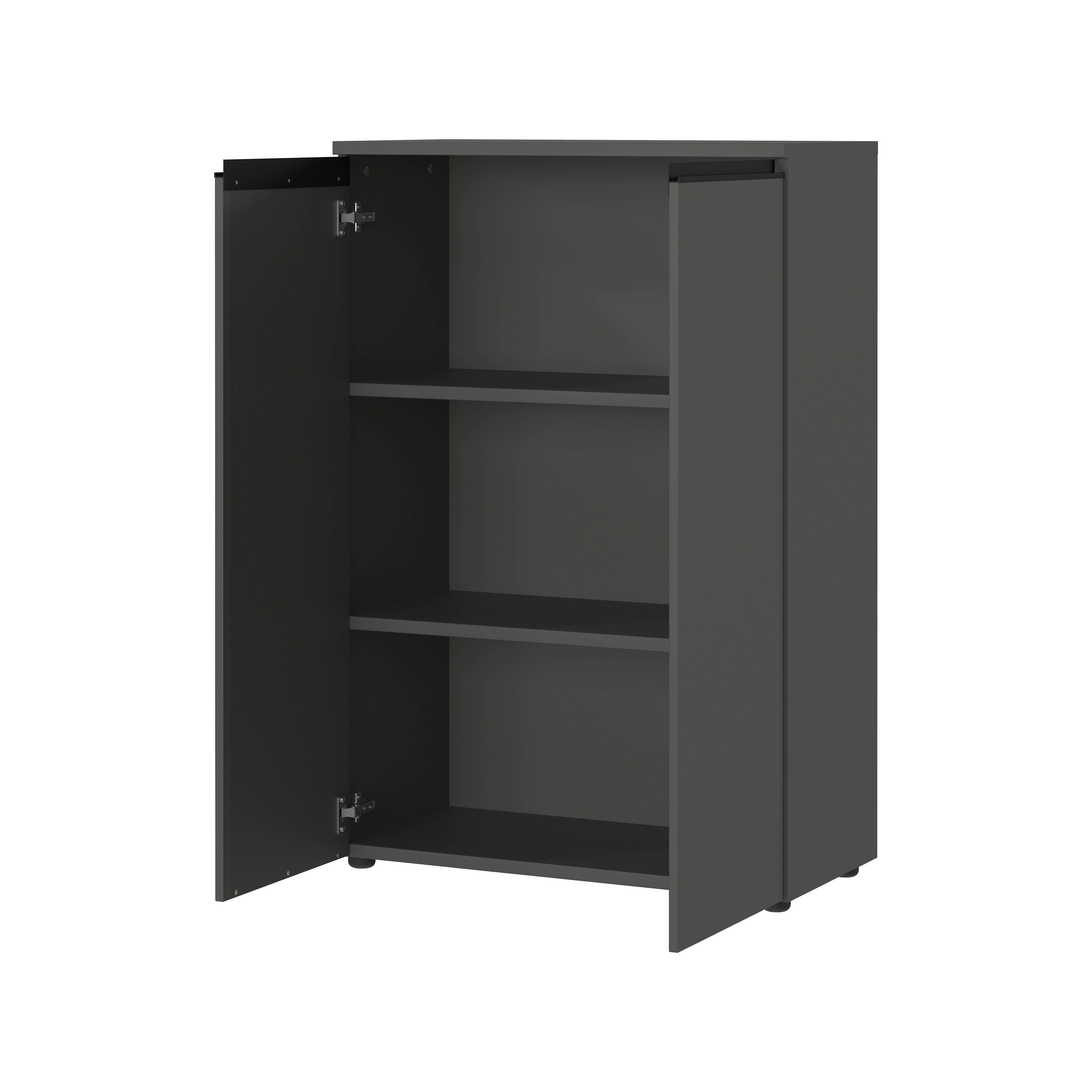 De lage kantoorkast Chicago Grafiet biedt een functionele opbergoplossing met een strak en modern design. Achter de twee deuren bevinden zich twee verstelbare legborden die elk tot 10 kg kunnen dragen. Het bovenblad kan tot 10 kg dragen, terwijl het onderste legbord een maximale belasting van 30 kg heeft. De krasbestendige afwerking en geïntegreerde soft-close deuren zorgen voor extra gebruiksgemak.