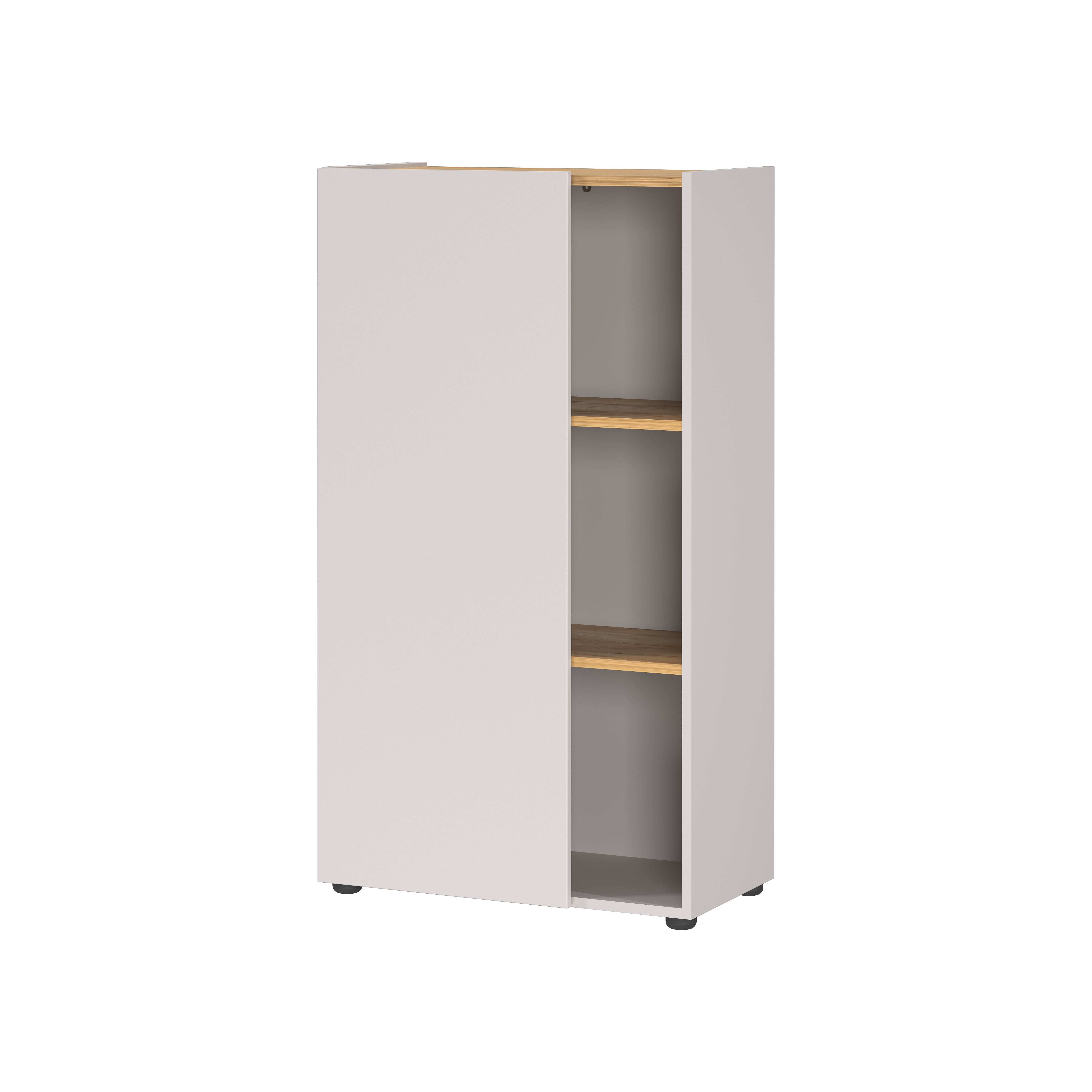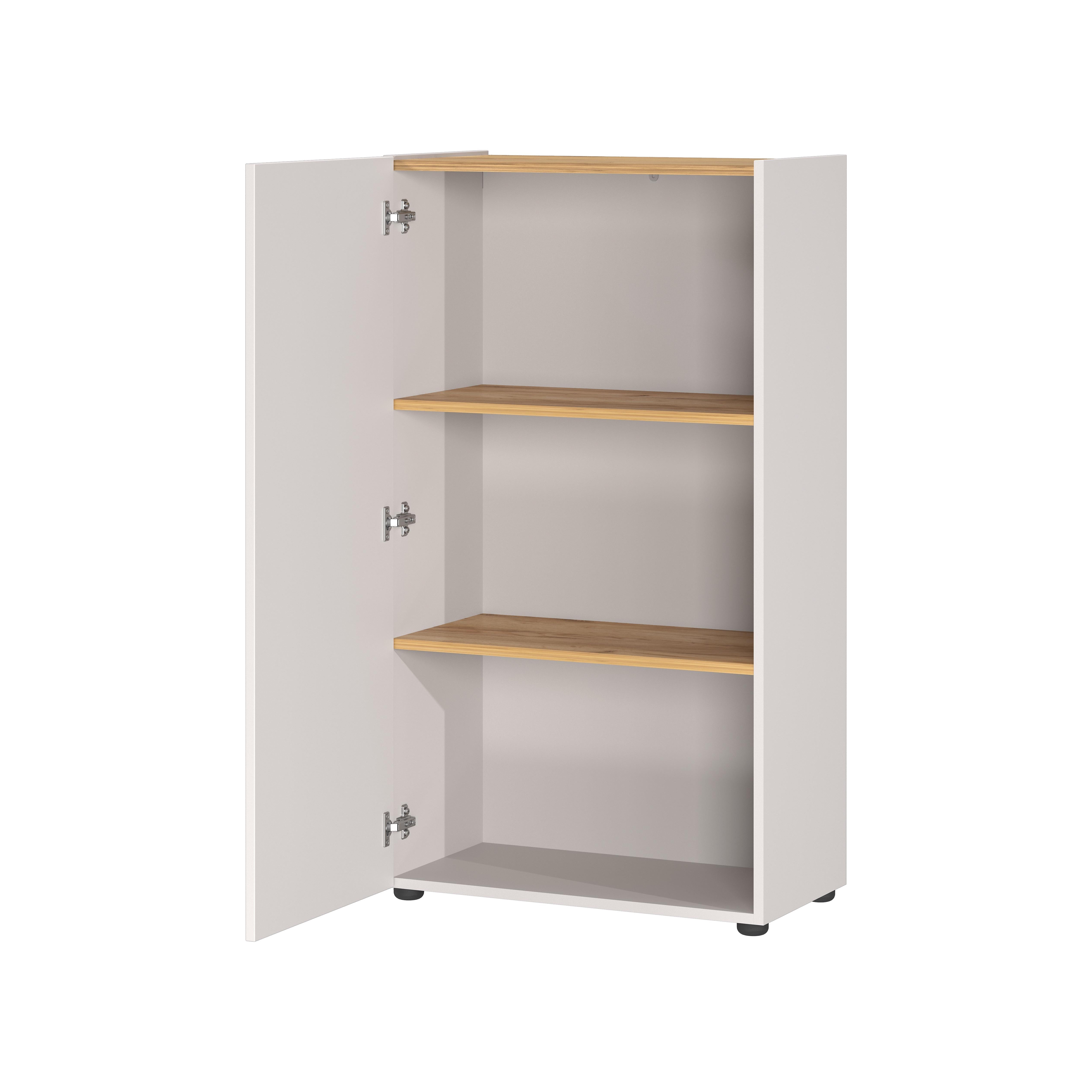 De lage kantoorkast Orlando Kasjmier 110 cm biedt een combinatie van gesloten en open opbergruimte. Het meubel heeft een 2/3-deur, drie open vakken en vaste planken. De planken kunnen elk 10 kg dragen, terwijl de onderste plank tot 25 kg belastbaar is. Dankzij de krasbestendige afwerking blijft het meubel langdurig mooi.