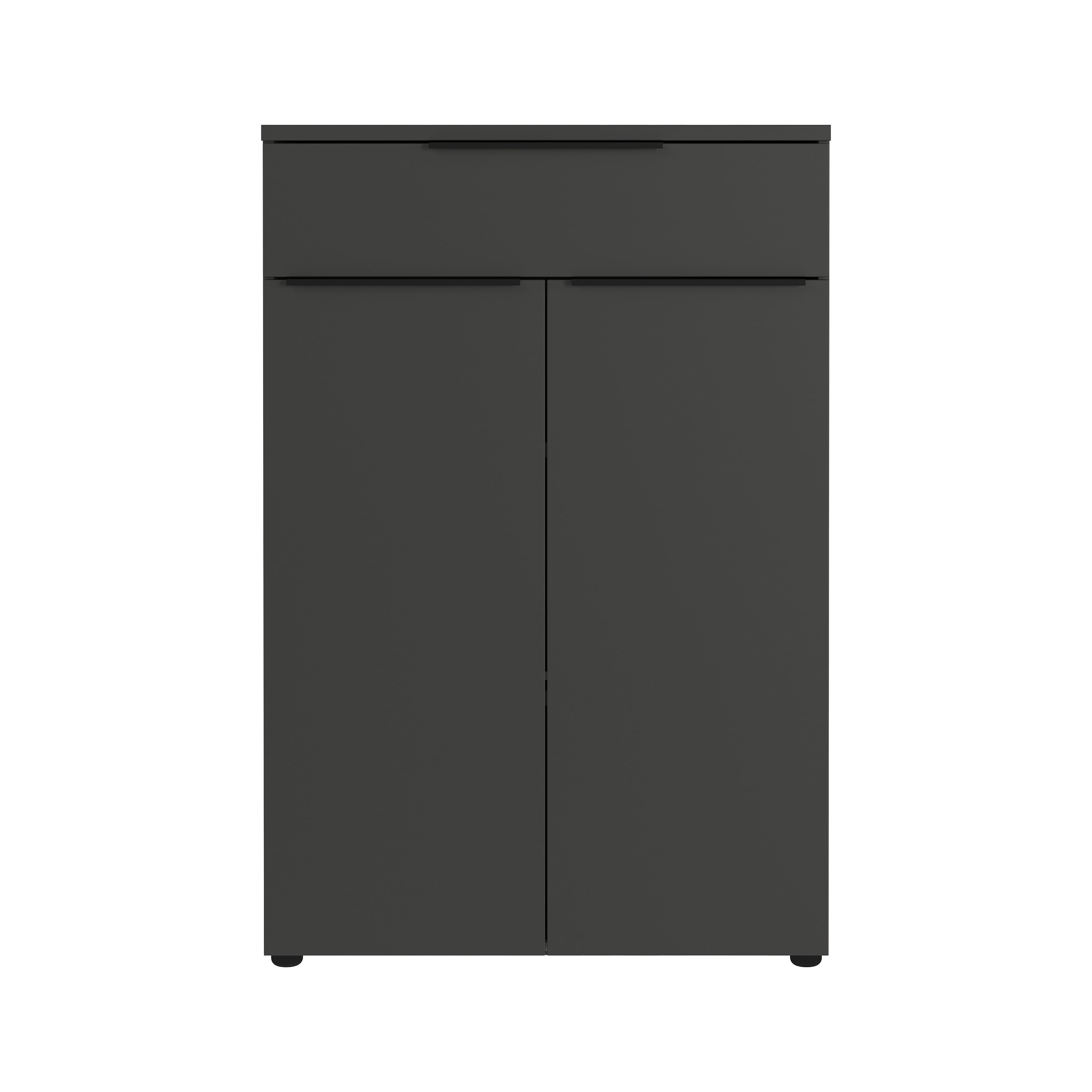 Het bovenste plankje kan tot 10 kg dragen, terwijl het onderste plankje tot 30 kg kan dragen. De kast is uitgevoerd in de kleur grafiet en heeft drie zwarte handgrepen van poeder gecoat metaal.