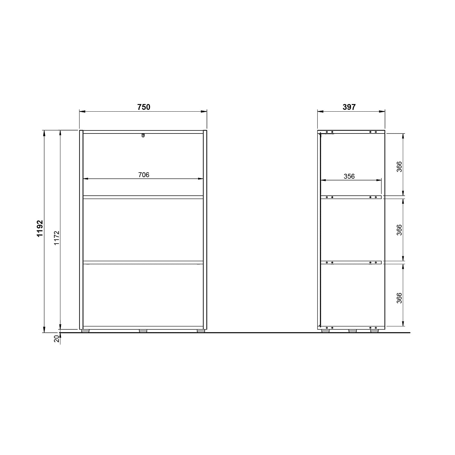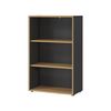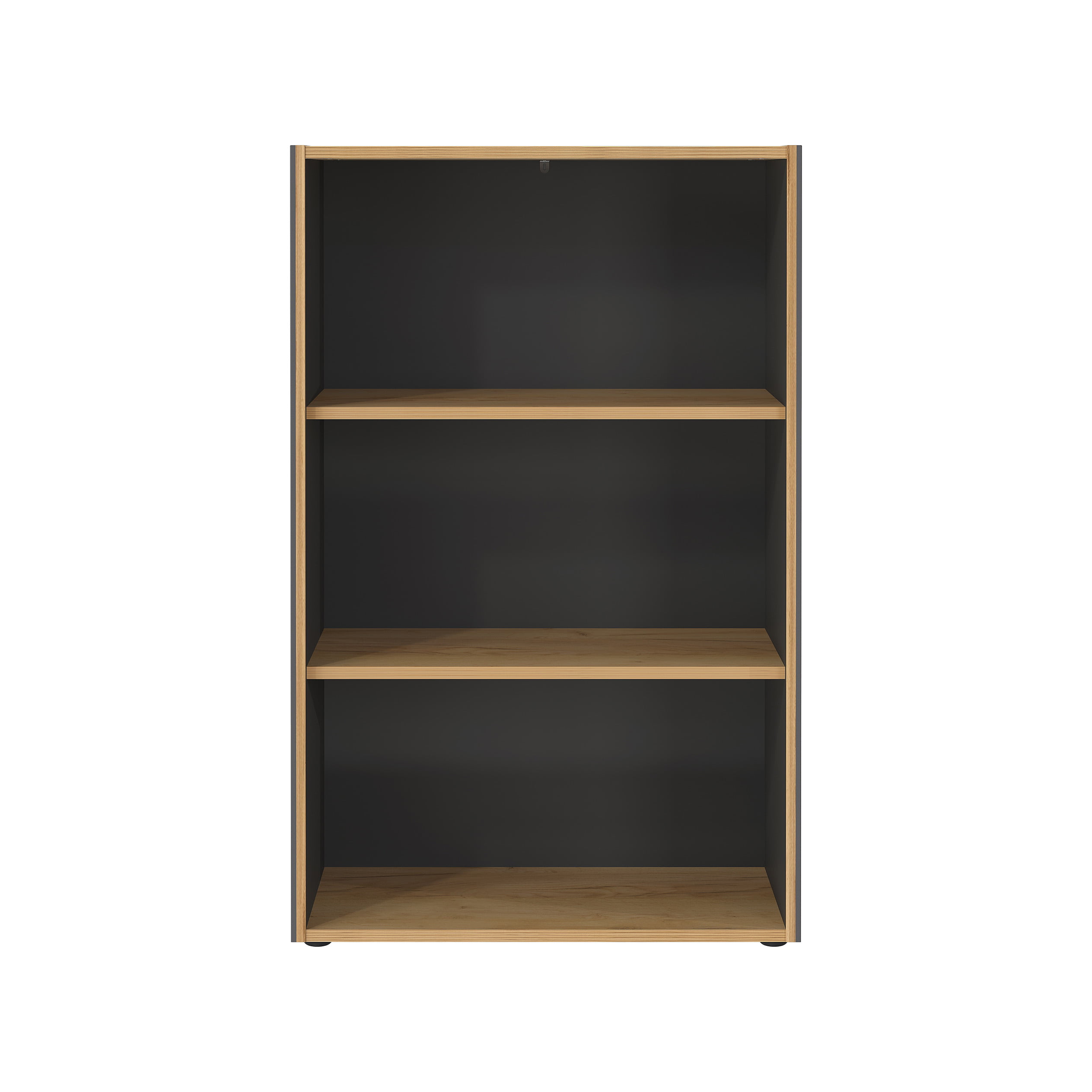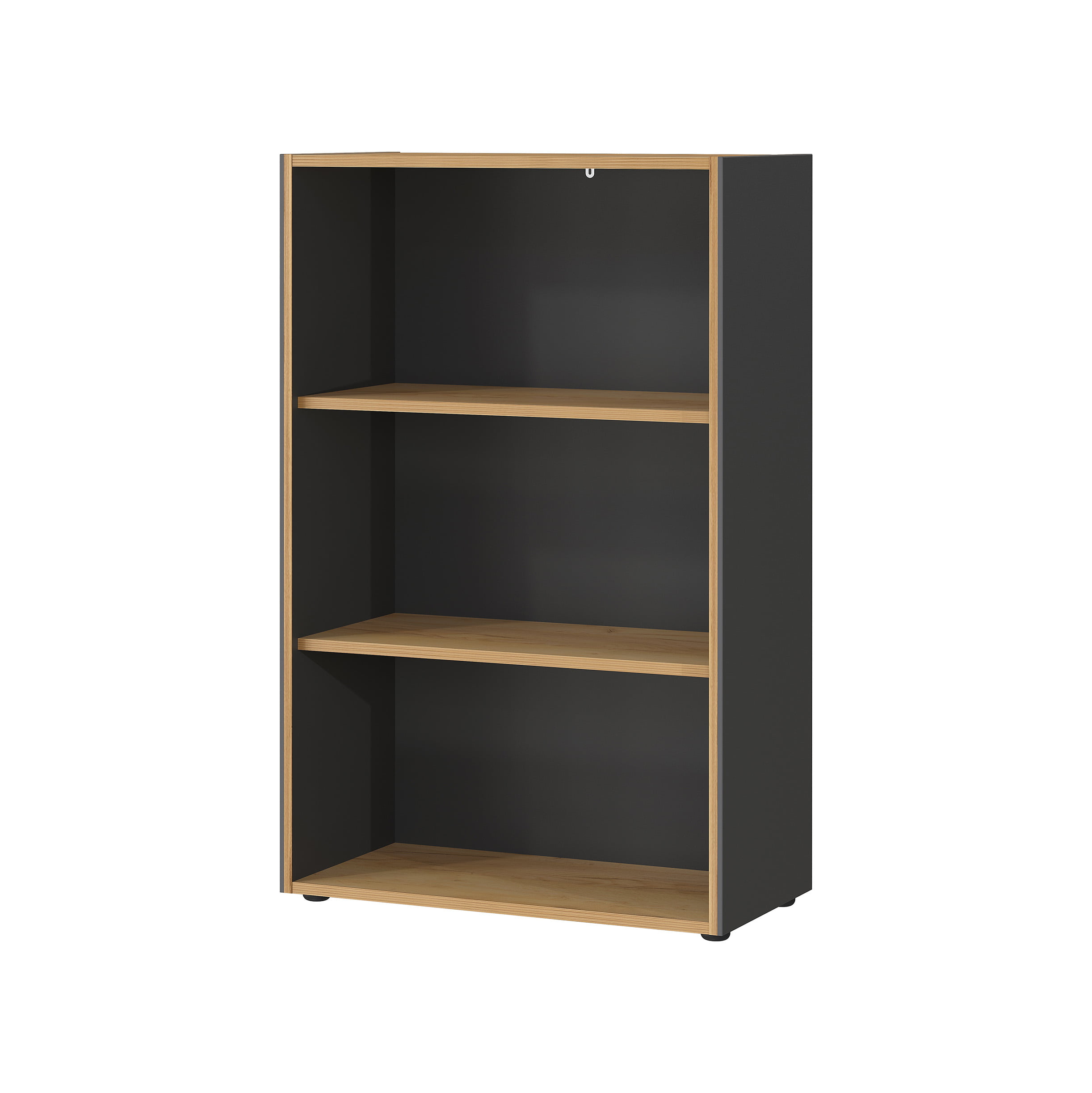 Ontdek de Lage Open Kantoorkast Pytheas Grafiet Eiken, een praktische opbergoplossing met twee vaste planken (elk belastbaar tot 22 kg).