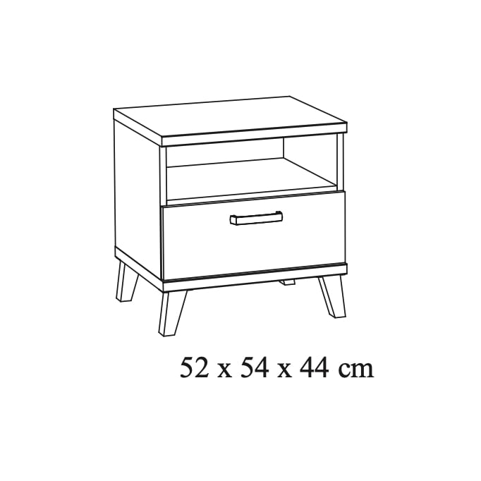 Met één handige lade biedt dit nachtkastje voldoende opbergruimte voor essentiële items. De lade glijdt soepel open en is perfect voor het bewaren van nachtelijke benodigdheden, zoals fopspenen, luiers of kleine kledingstukken. Boven de lade bevindt zich een open vak waar je gemakkelijk boeken, knuffels of andere decoratieve items kunt neerzetten.