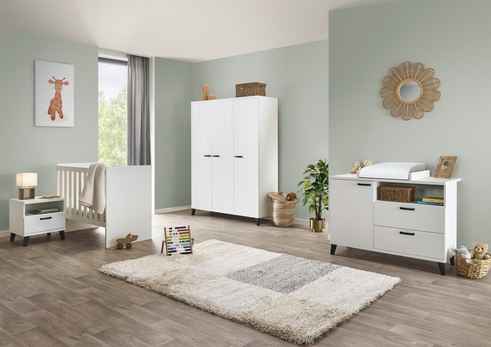 Het Nachtkastje Finn Wit is een charmante toevoeging aan de babykamer, met zijn compacte afmetingen van 52x54x44 cm en doordachte ontwerp.