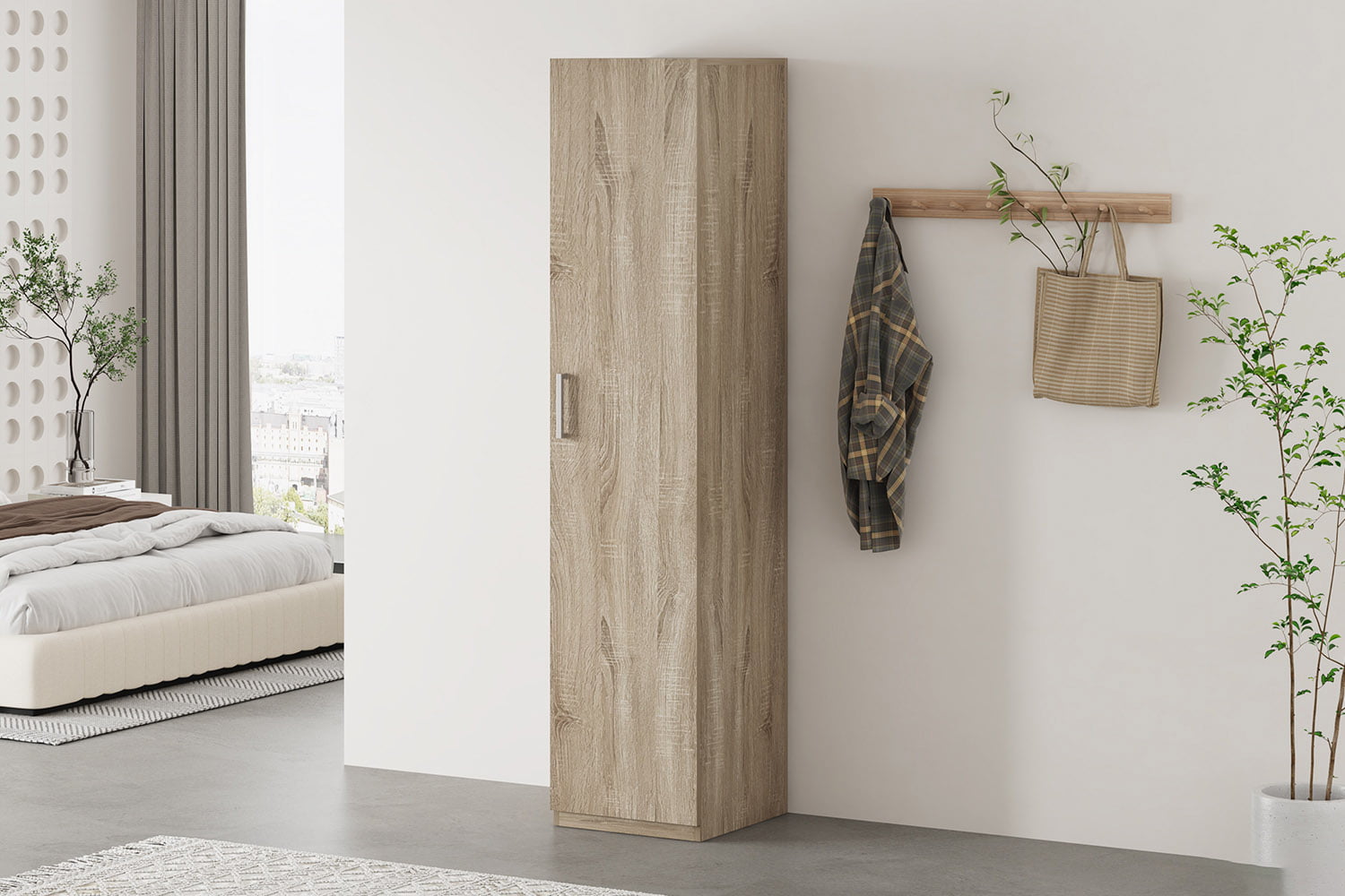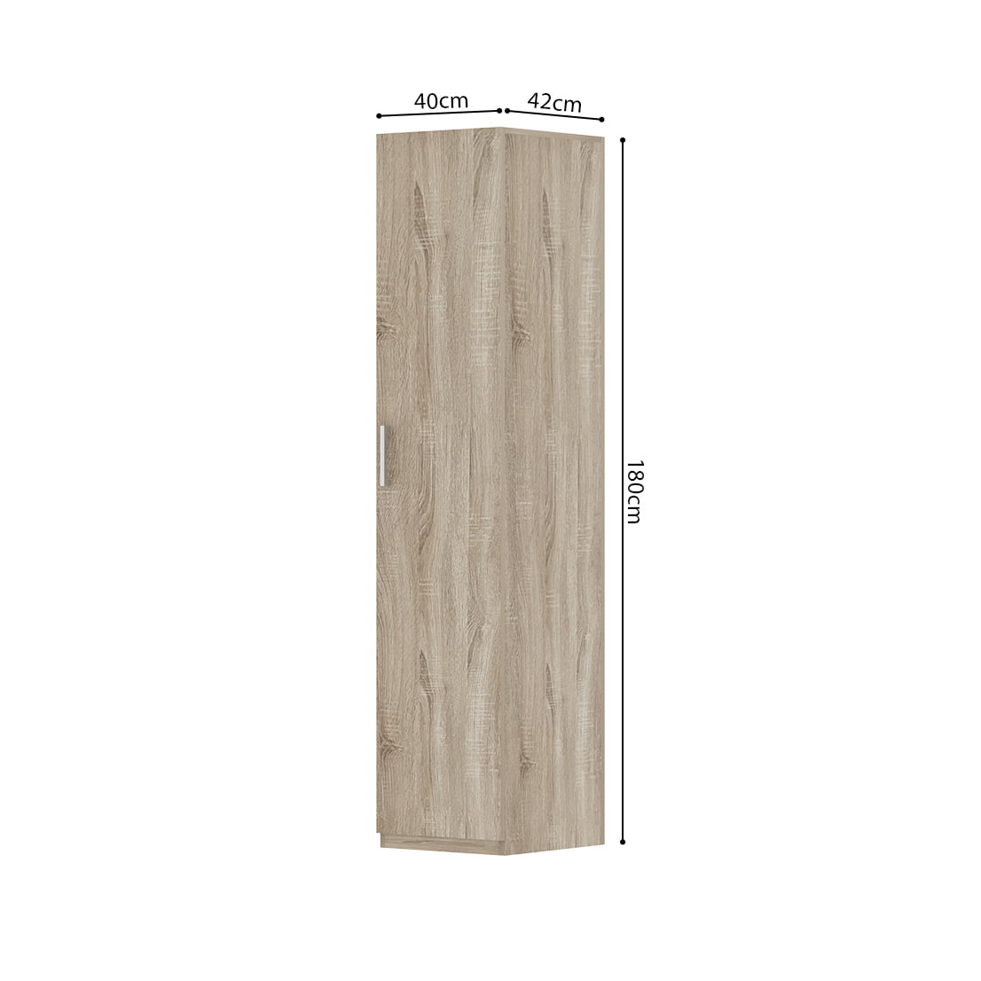 Deze handige opbergkast is enkel 40 centimeter breed waardoor deze gemakkelijk overal geplaatst kan worden. Achter de deur bevinden zich 5 legplanken waarvan 3 verstelbaar. De kast is vervaardigd van een stevige spaanplaat en afgewerkt met een sonoma decor. Verkrijgbaar in verschillende afmetingen.