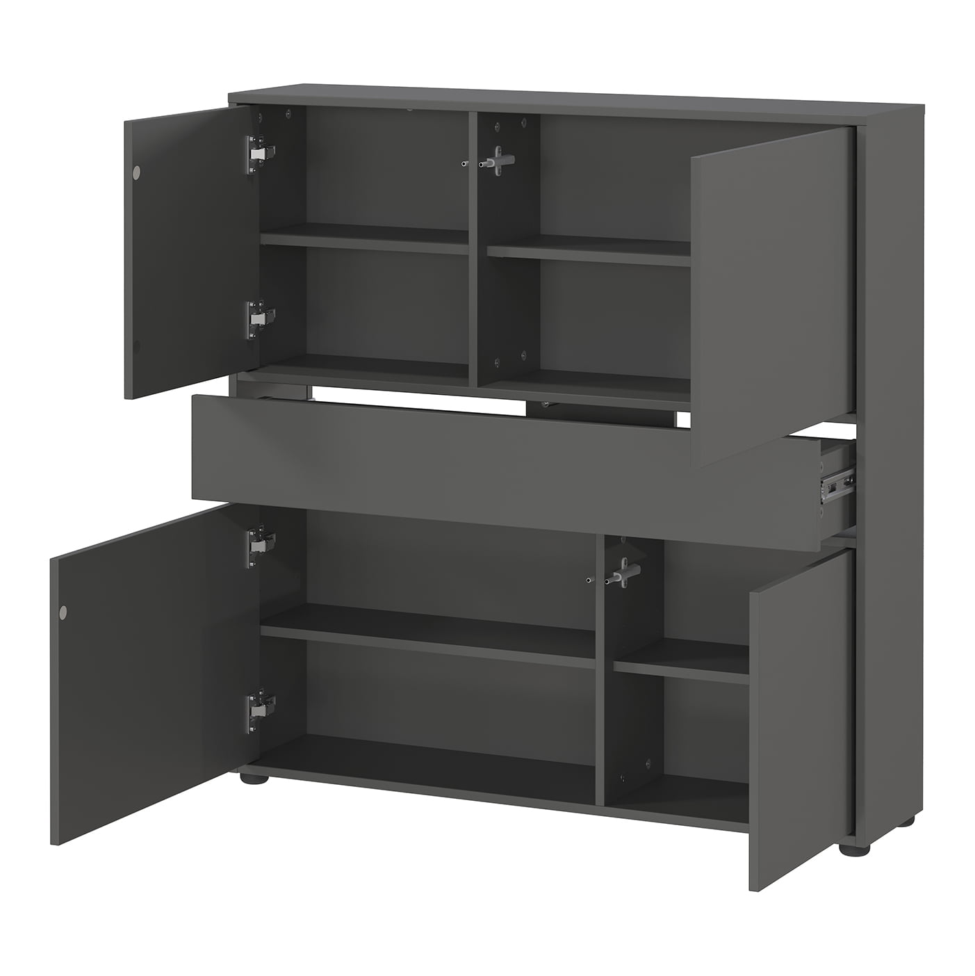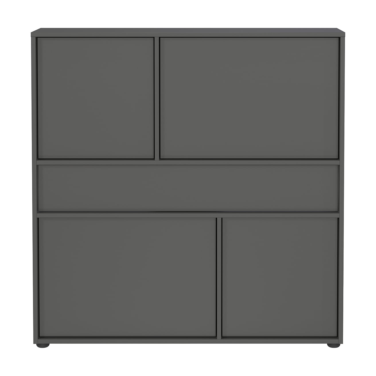De opbergkast Mathieu 105 cm is een multifunctioneel meubel dat zowel stijl als functionaliteit biedt. De kast heeft één lade met een draagvermogen tot 10 kg en twee deuren met daarachter 4 planken, elk belastbaar tot 10 kg. De grafietkleurige afwerking geeft de kast een moderne look, terwijl de krasbestendige melamineharscoating de kast perfect maakt voor dagelijks gebruik. Dankzij de ondiepe diepte is deze kast ideaal voor smalle gangen.
