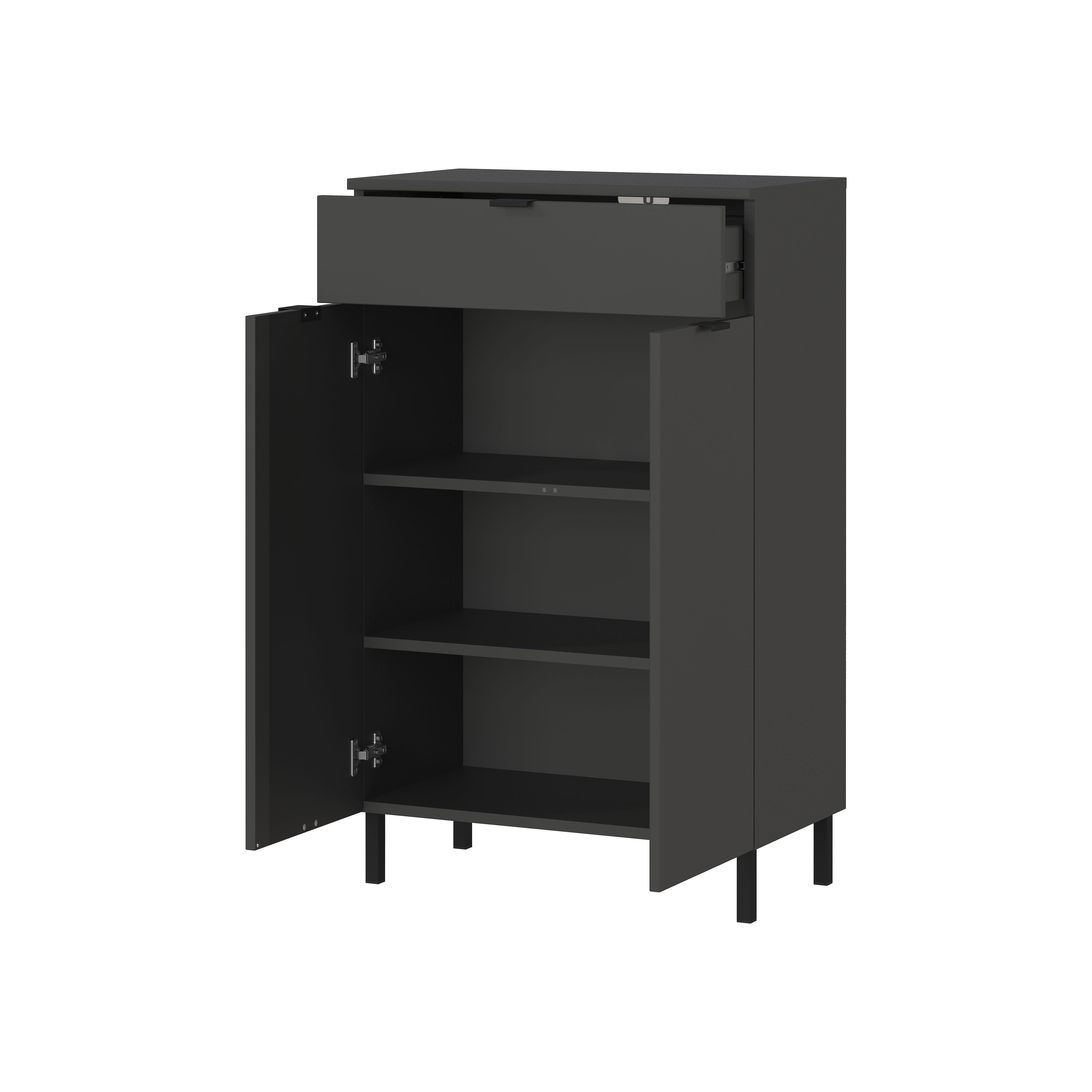 De opbergkast Zadar Grafiet 60 cm combineert een slank ontwerp met praktische opbergmogelijkheden. De kast heeft een lade met een draagvermogen van 10 kg en twee deuren met daarachter twee verstelbare planken, die elk belastbaar zijn tot 10 kg. Het meubel is voorzien van zwarte metalen randgrepen en vier stevige metalen poten, wat bijdraagt aan een moderne, industriële uitstraling. De krasbestendige melamine coating en de stootvaste randen zorgen ervoor dat de kast langdurig mooi blijft. De deuren en lade sluiten zachtjes dankzij de geïntegreerde demping.
